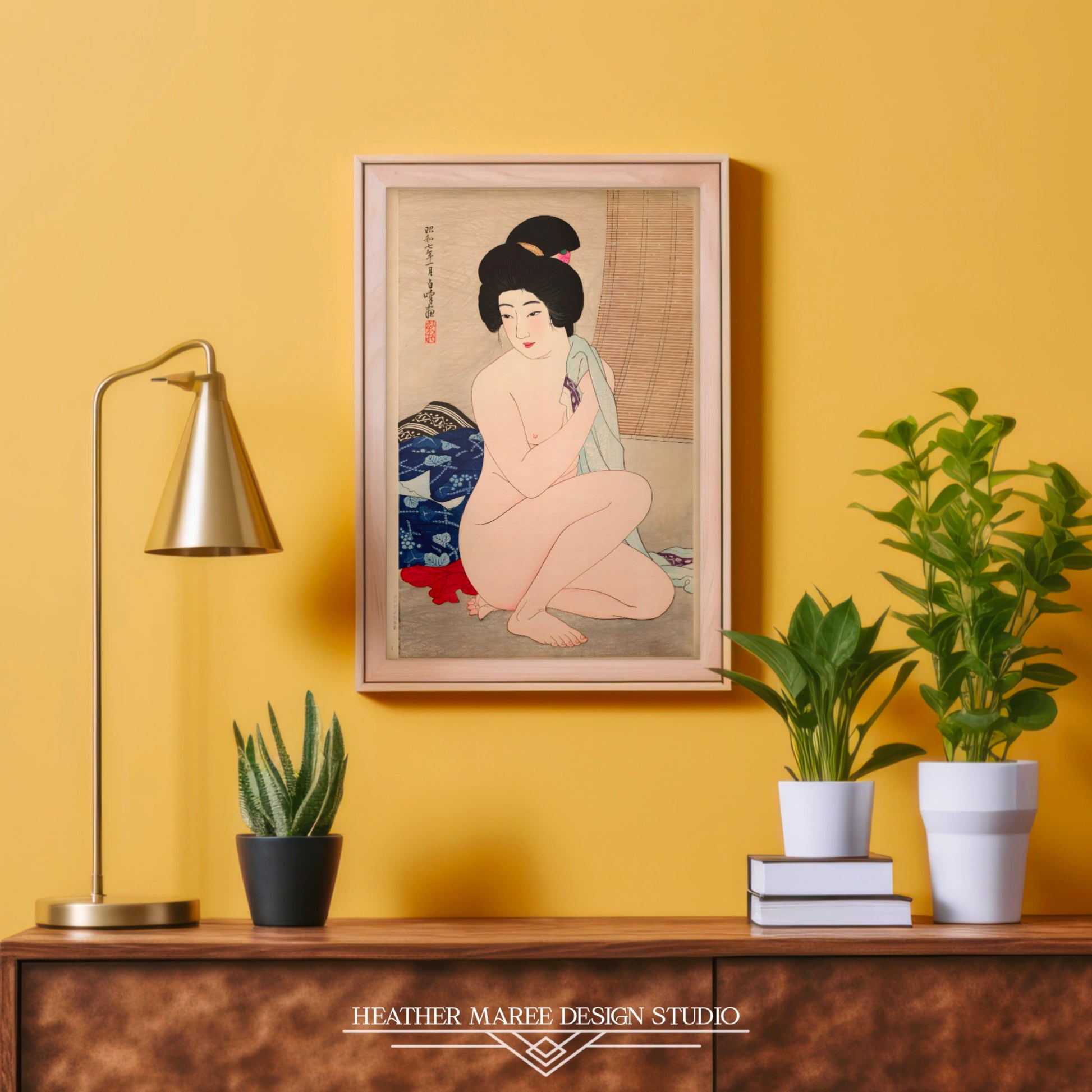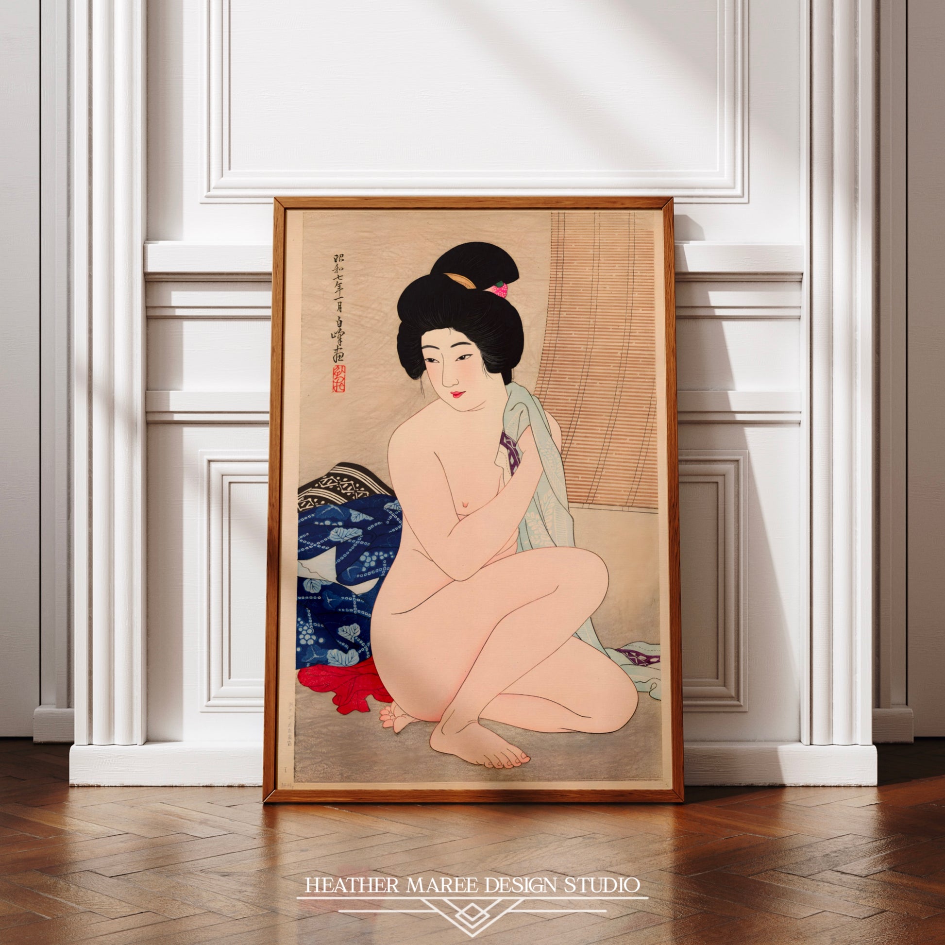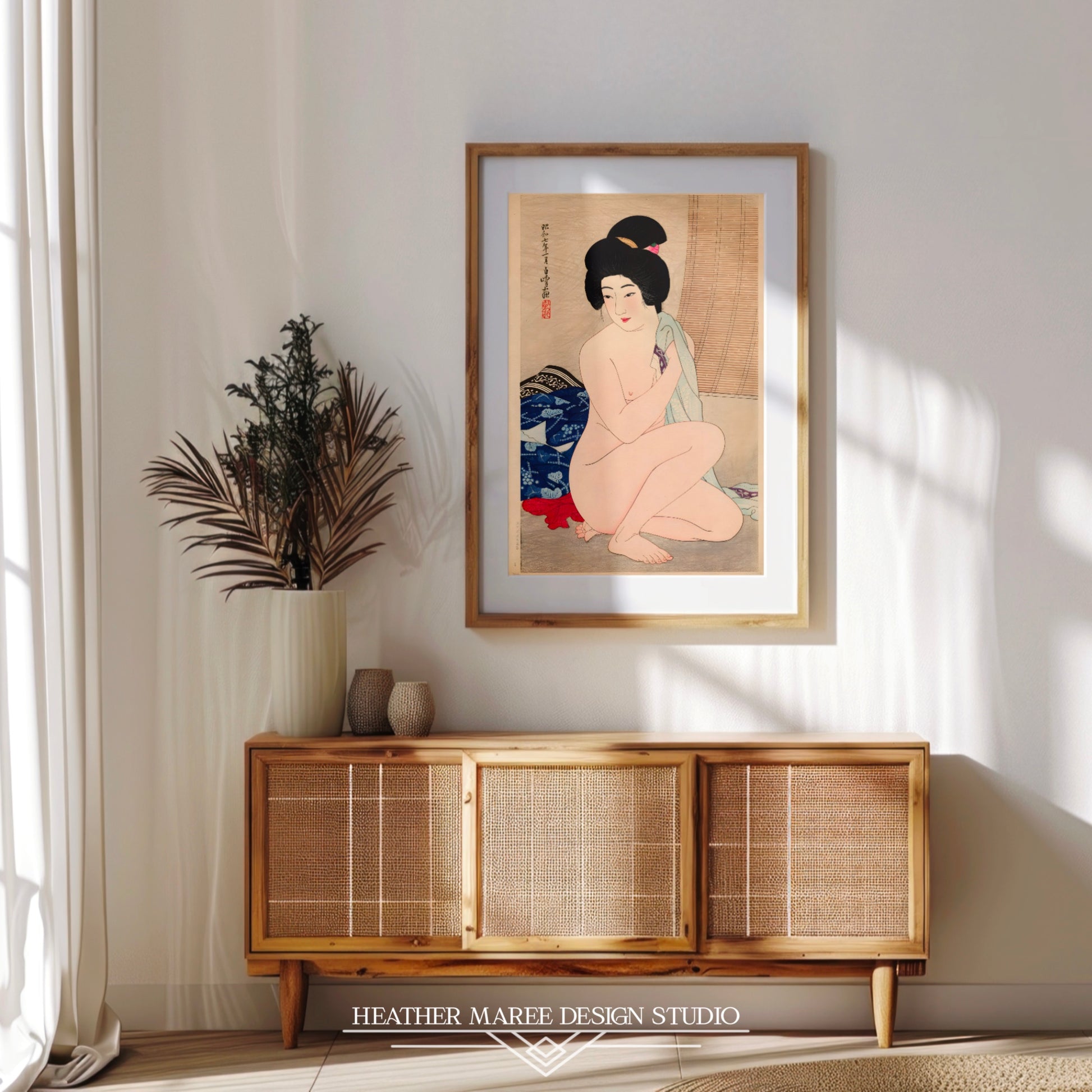 This captivating artwork effortlessly complements an array of home décor styles, from the unique fusion of eclectic home décor to the serene minimalism of Japandi aesthetics. Its versatile charm ensures it finds its place in your heart and home. For enthusiasts of traditional Japanese art, this digitally enhanced print offers an authentic and evocative experience, transporting you to a bygone era of elegance and grace. Simultaneously, it speaks to those who appreciate the subtleties of tasteful nude art, inviting you to embrace the beauty, serenity, and timeless allure captured within these inked lines.