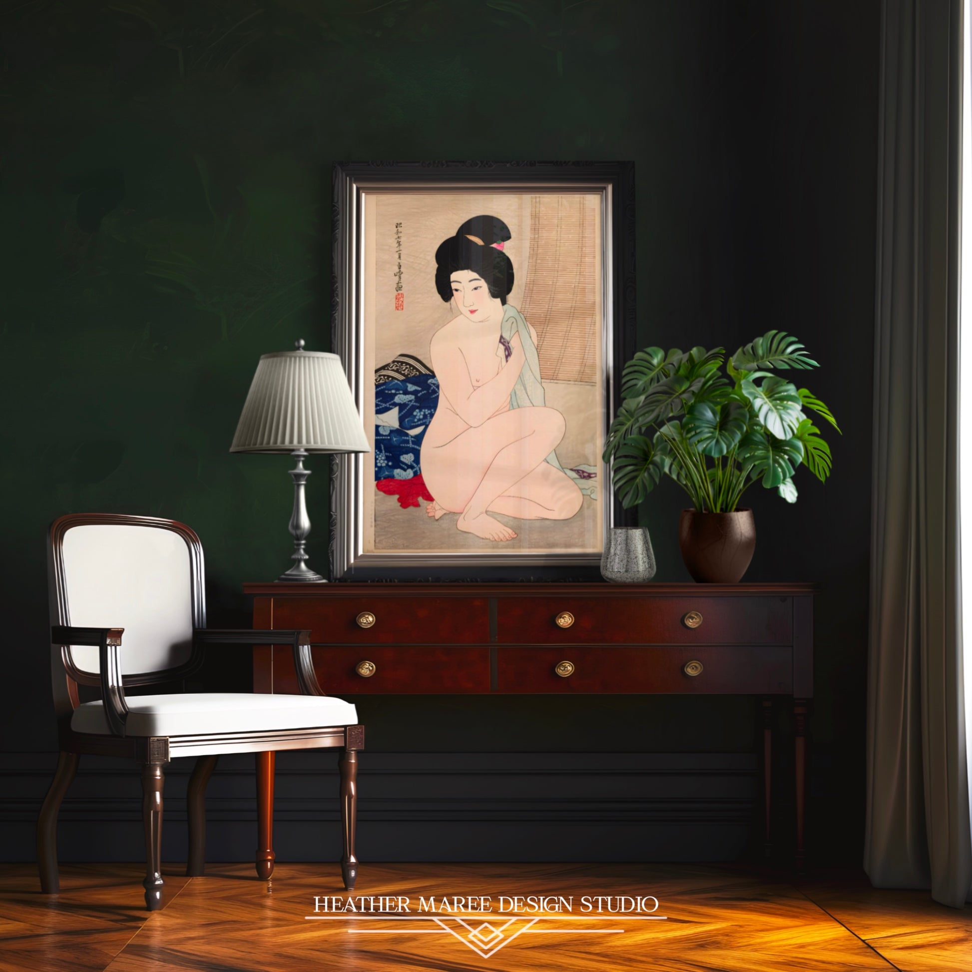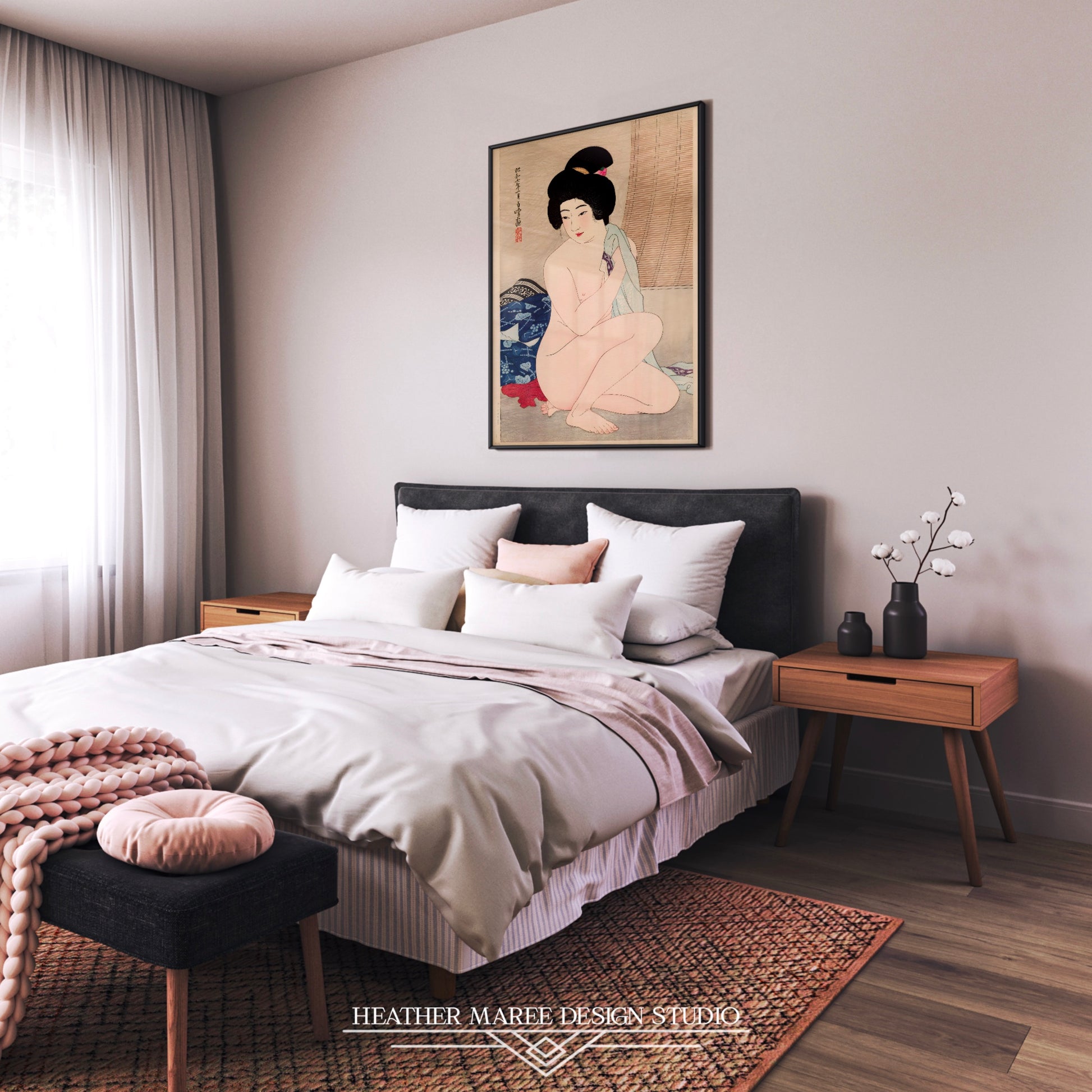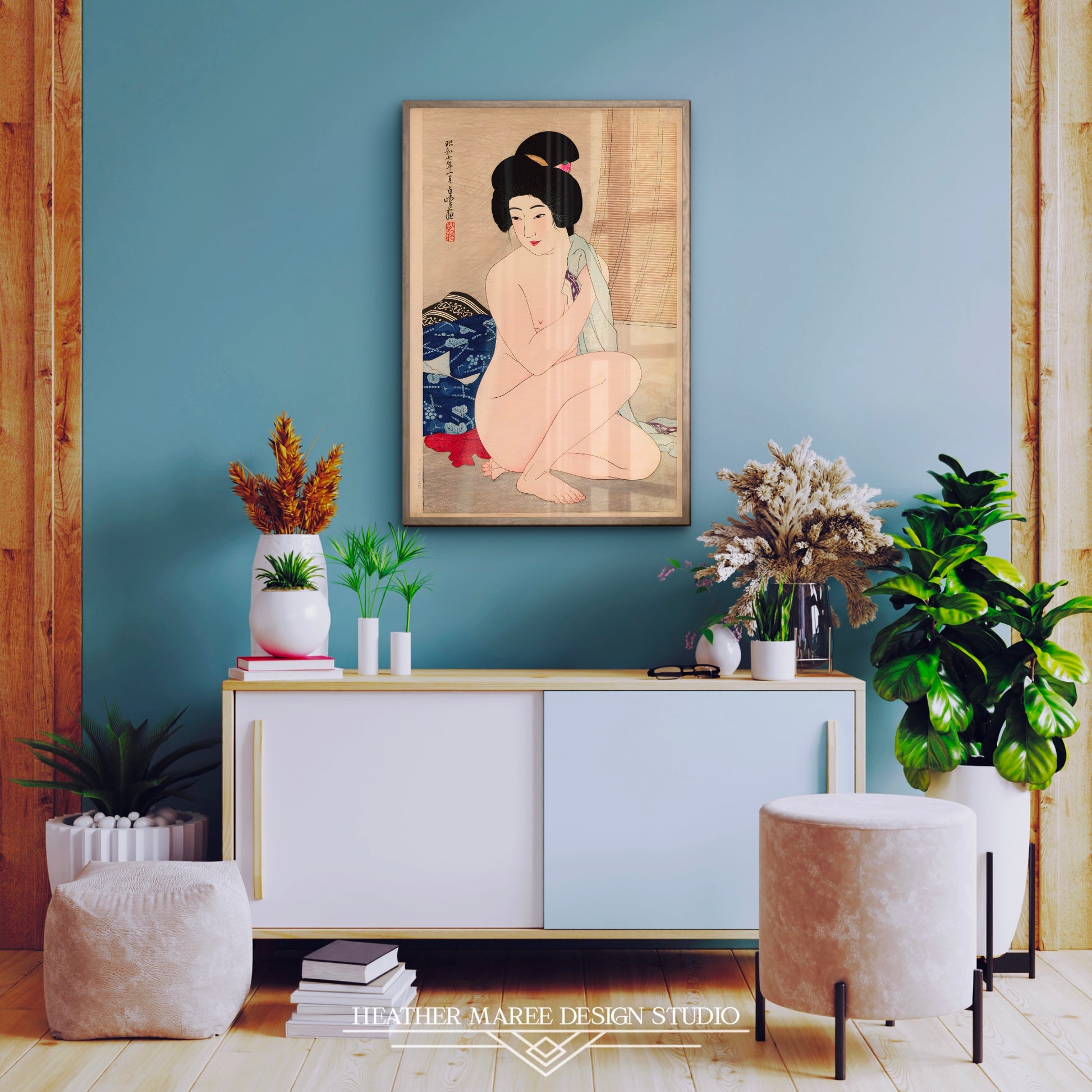 This captivating artwork effortlessly complements an array of home décor styles, from the unique fusion of eclectic home décor to the serene minimalism of Japandi aesthetics. Its versatile charm ensures it finds its place in your heart and home. For enthusiasts of traditional Japanese art, this digitally enhanced print offers an authentic and evocative experience, transporting you to a bygone era of elegance and grace. Simultaneously, it speaks to those who appreciate the subtleties of tasteful nude art, inviting you to embrace the beauty, serenity, and timeless allure captured within these inked lines.
