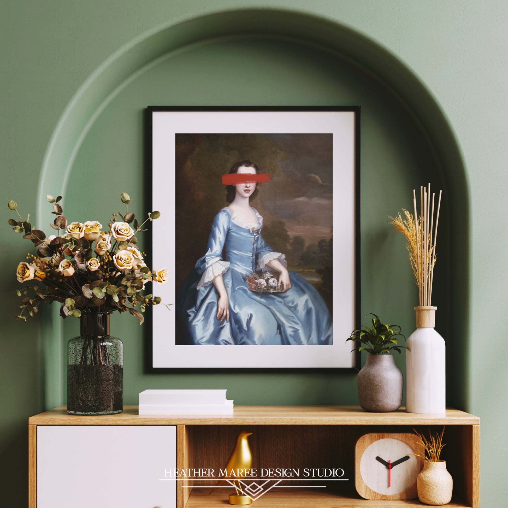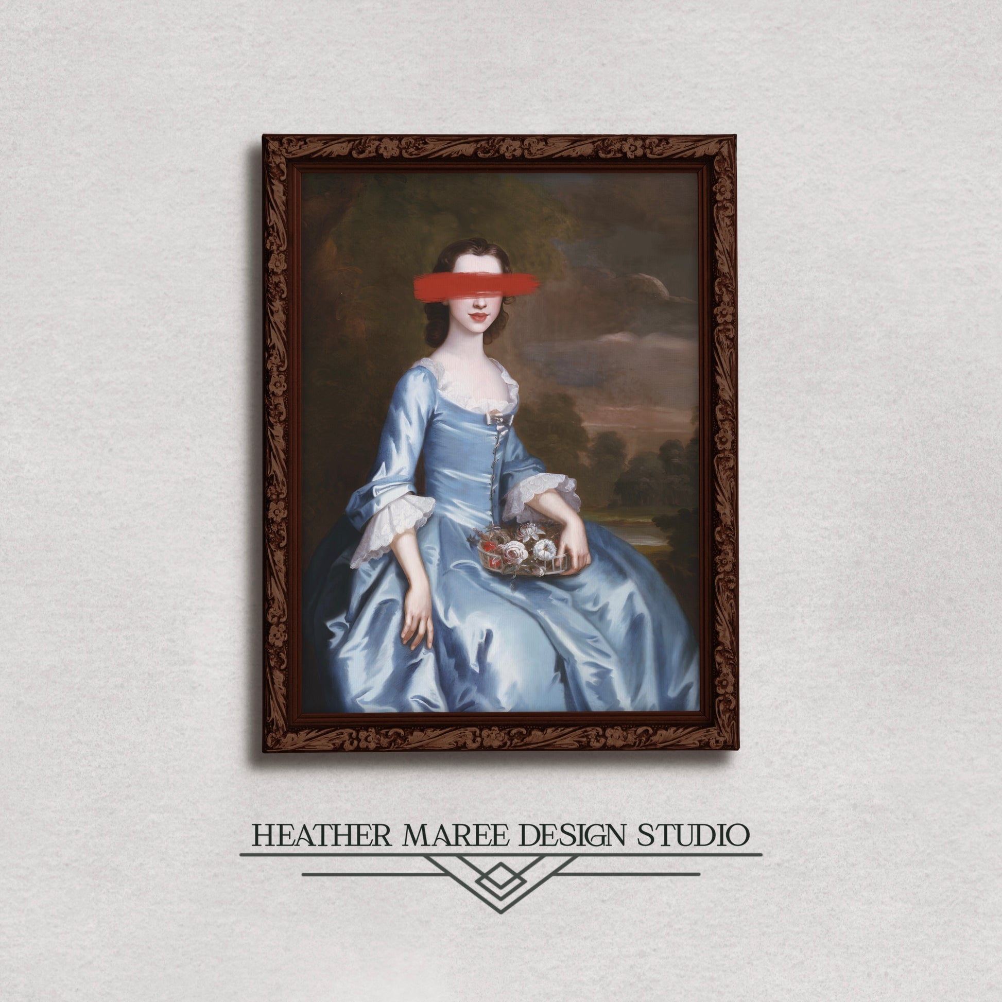 Step into the timeless elegance of John Wollaston's 1750 original painting, where an American woman adorned in a graceful blue dress delicately holds a small tray of flowers. This digitally altered artwork seamlessly blends history with a contemporary twist, capturing the essence of a bygone era while adding a touch of modern allure. The subtle transformation enhances the delicate features of the subject, creating a piece that transcends time and sparks the imagination.