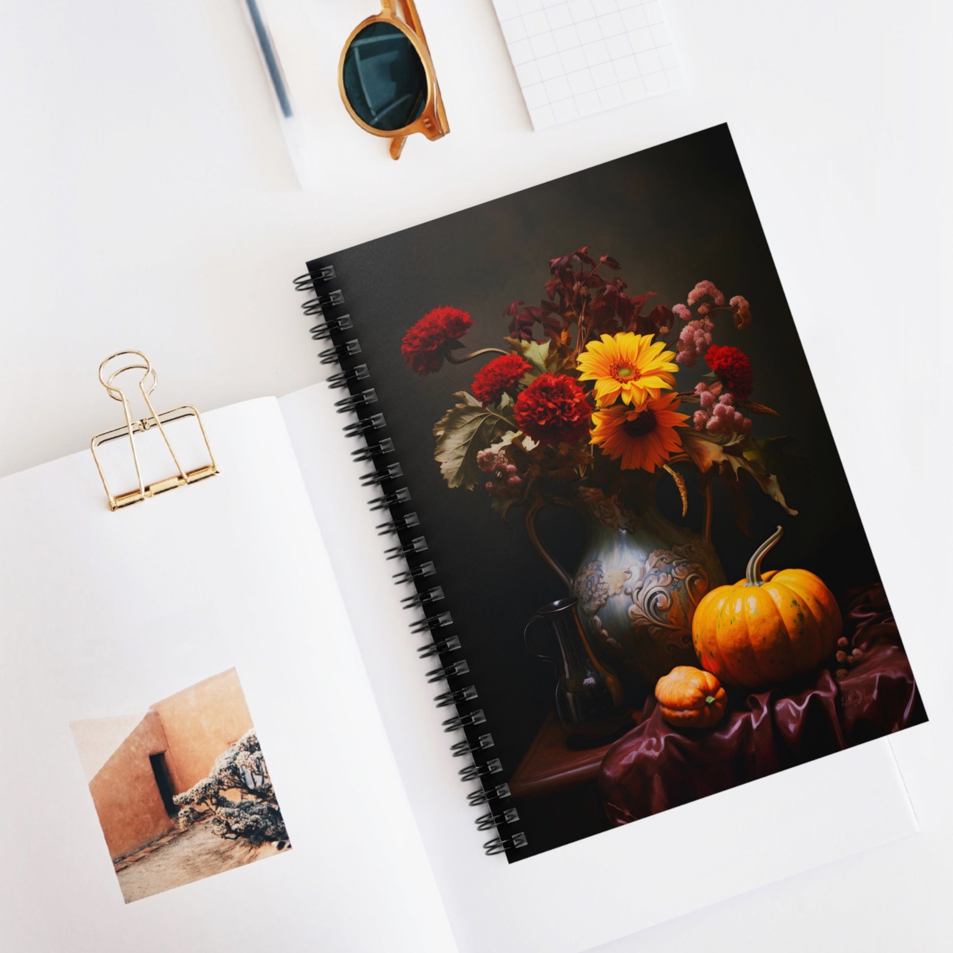 Delight in the timeless beauty of this original digital painting that brings a burst of vibrant charm into your living space. This enchanting artwork captures a charming floral arrangement featuring a medley of red, yellow, and pink flowers elegantly displayed in a fanciful pale blue decorative vase. The scene is set upon a rustic wood table adorned with a deep burgundy tablecloth, creating a captivating contrast of colors and textures. Two whimsical pumpkins and a dainty black glass pitcher complete this picturesque tableau, adding an intriguing touch of eclectic elegance. This notebook is a perfect companion for school notes, poems, shopping lists, and so much more.