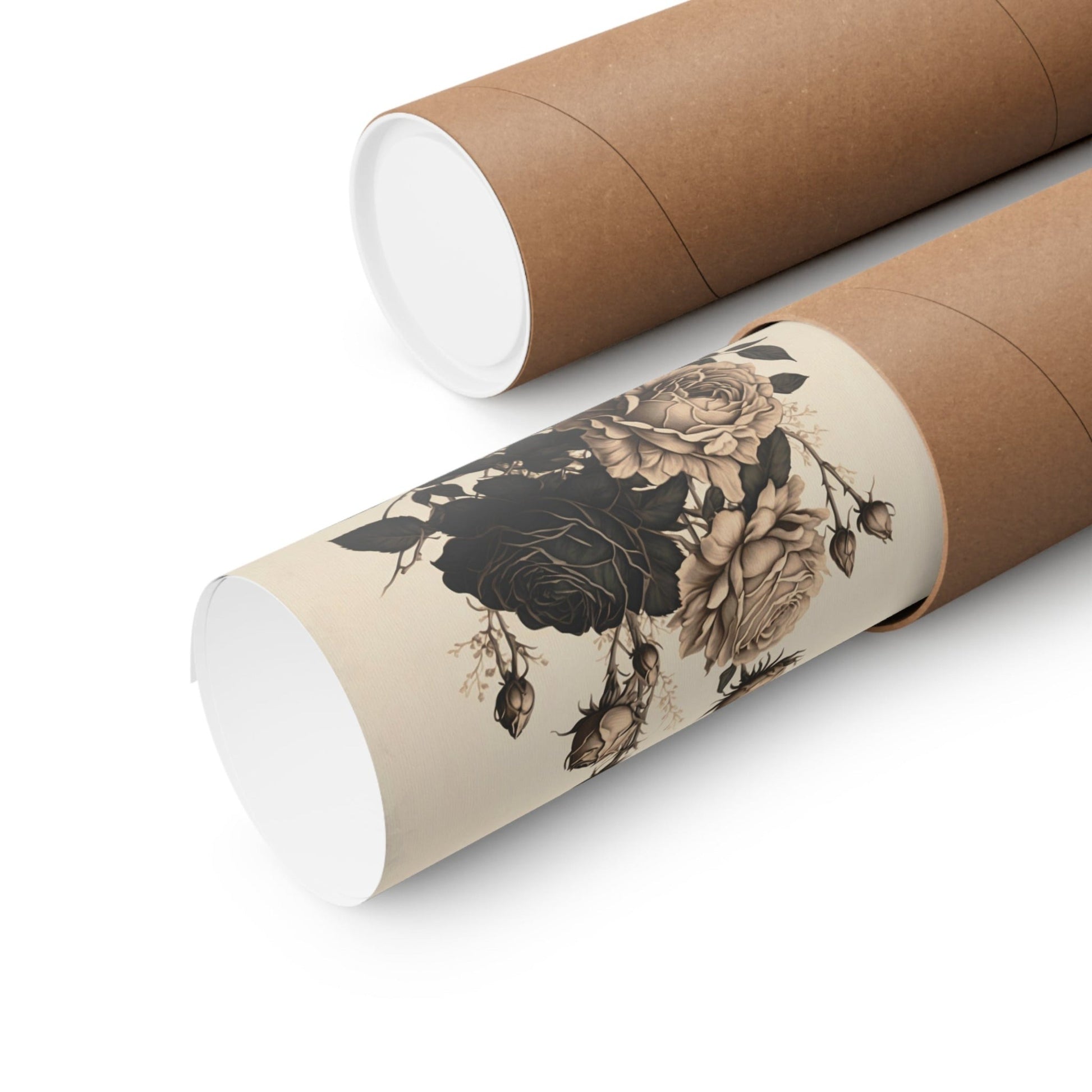 The enigmatic beauty of this digital illustration featuring a striking large black rose accompanied by delicate beige roses and dark foliage, all set against an antique white background, will enrich your home décor with a touch of noir magic. This captivating artwork captures the essence of contrast and mystery, making it a perfect addition to your home.