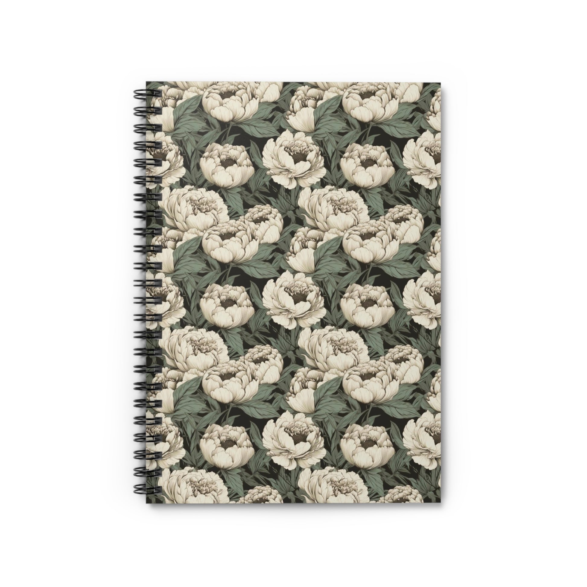 A charming vintage inspired digital pattern illustration of ivory and soft green peonies set against a dark background. This notebook is a perfect companion for school notes, poems, shopping lists, and so much more 🖼️💖