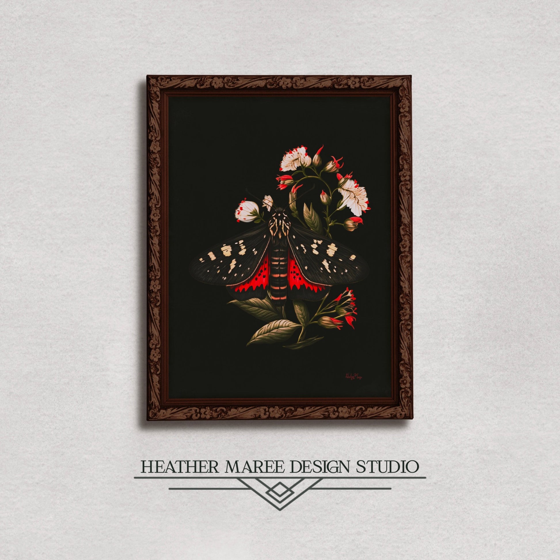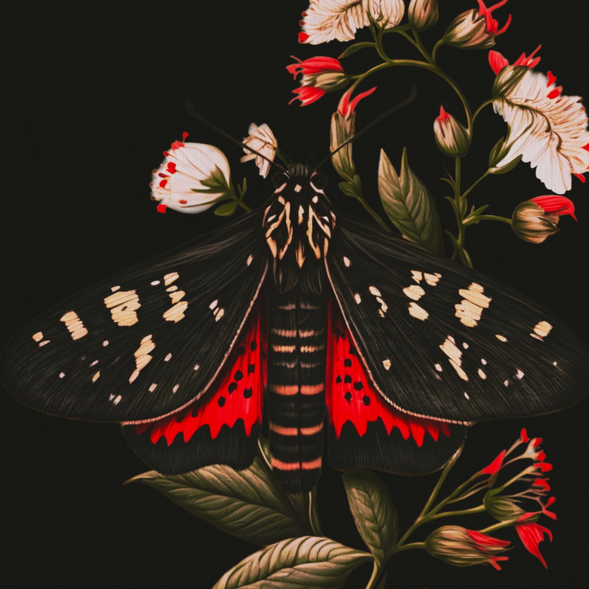 In this intriguing original digital painting, a stunning black and red moth, adorned with elegant white markings and wings gracefully outspread, alights upon a canvas of dark green foliage and white flowers with crimson-tipped petals. Set against a profound black background, this artwork captures a moment of exquisite contrast and balance, where the vibrant hues of nature's beauty harmonize with the depths of the night.
