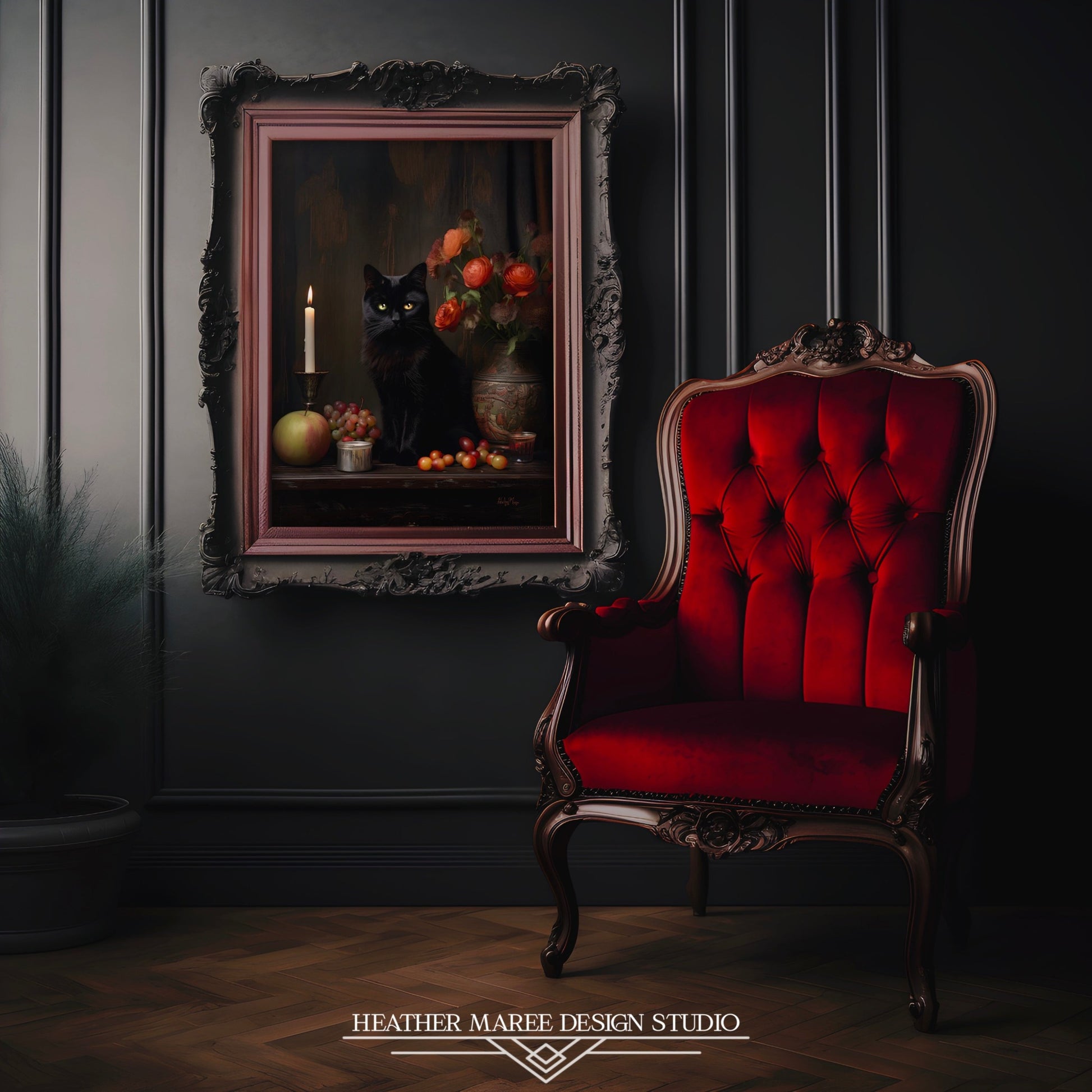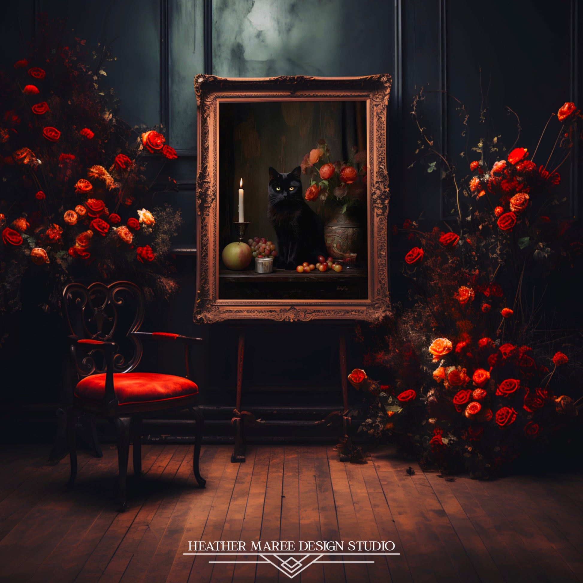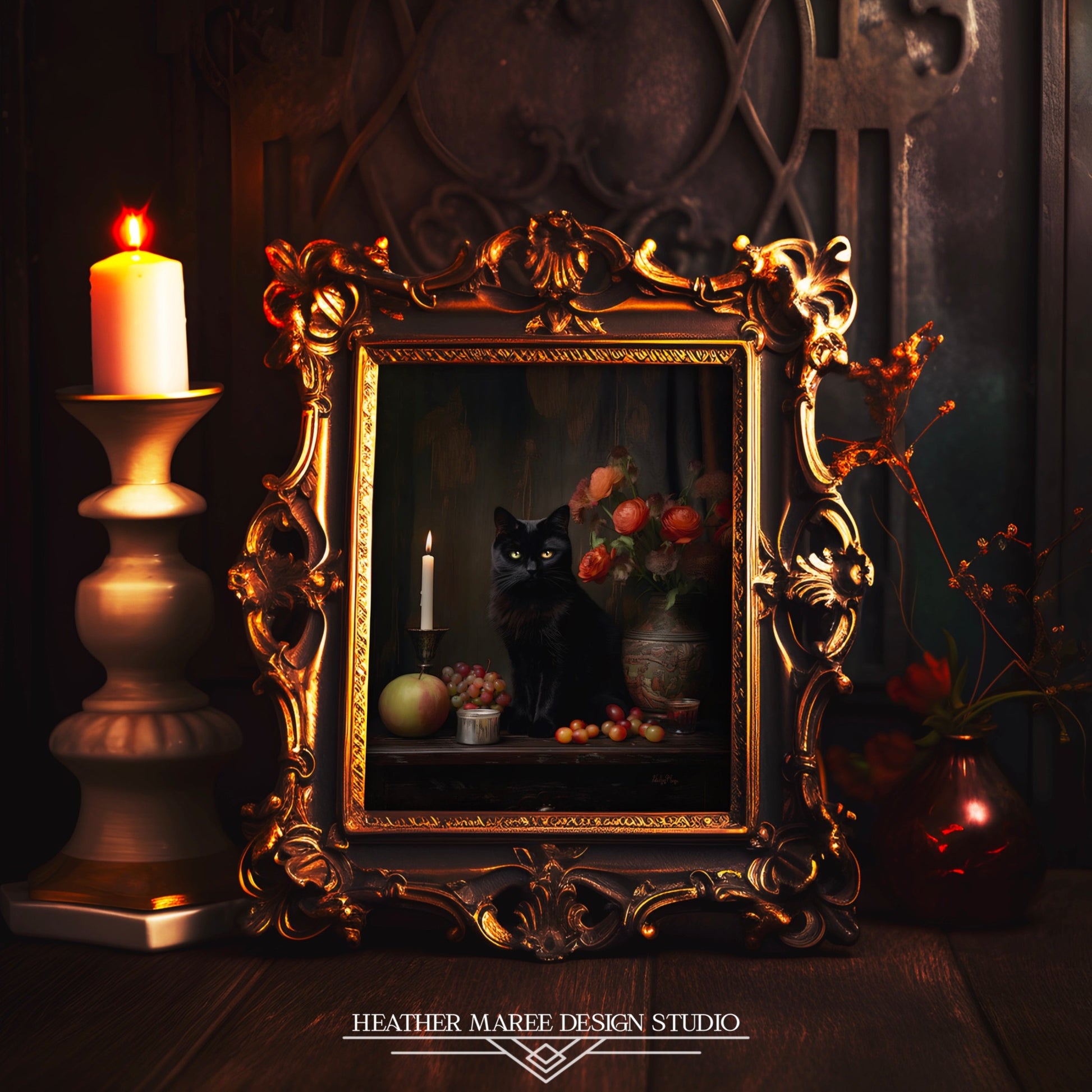 This original digital painting showcases a stunning black cat with mesmerizing heterochromia, gazing out from the canvas and inviting you into a world of enchantment. The inquisitive cat is perched regally upon a wooden table adorned with a delicate bouquet of pink and peach flowers. An apple and grapes beckon to the senses, while a candlestick offers a warm, flickering glow.