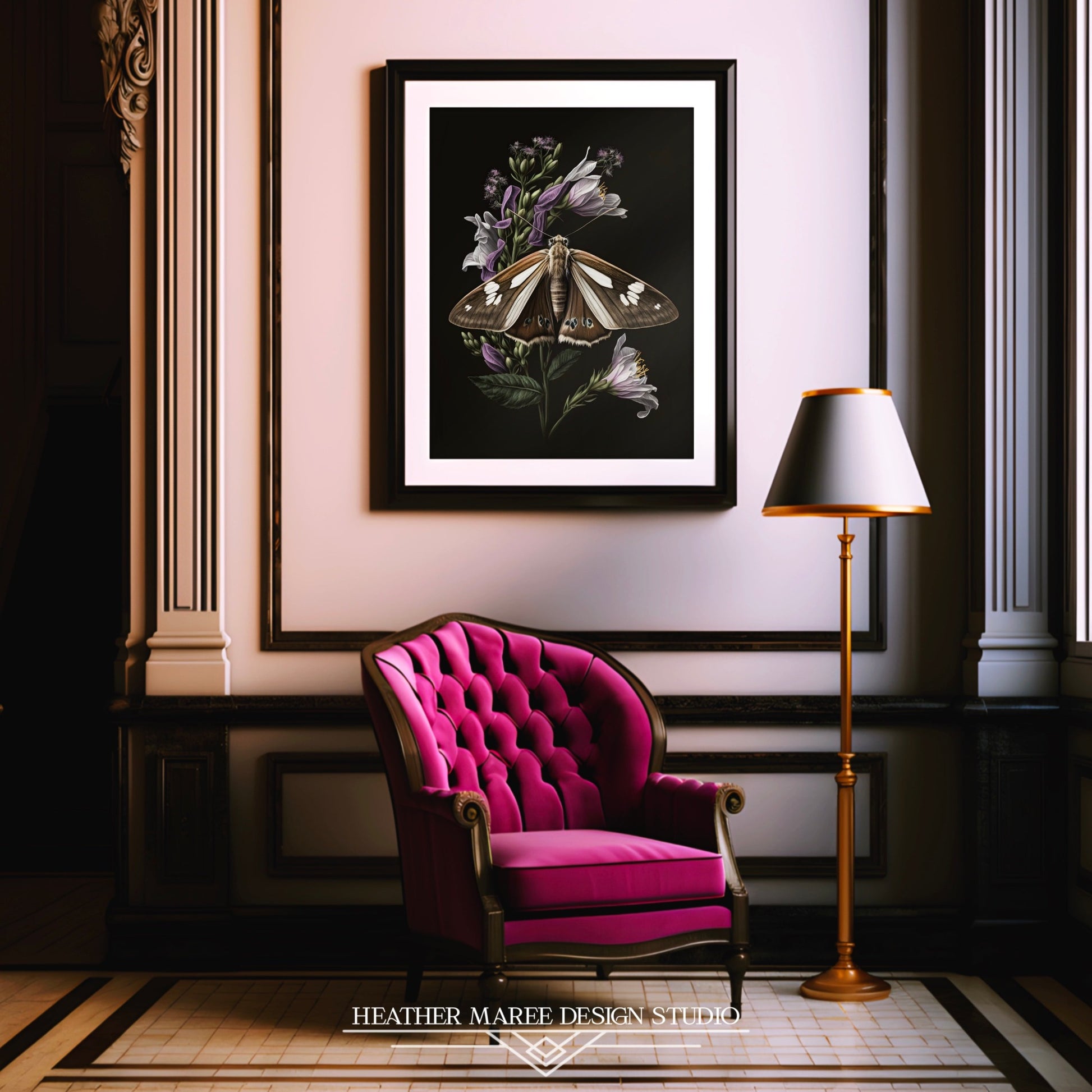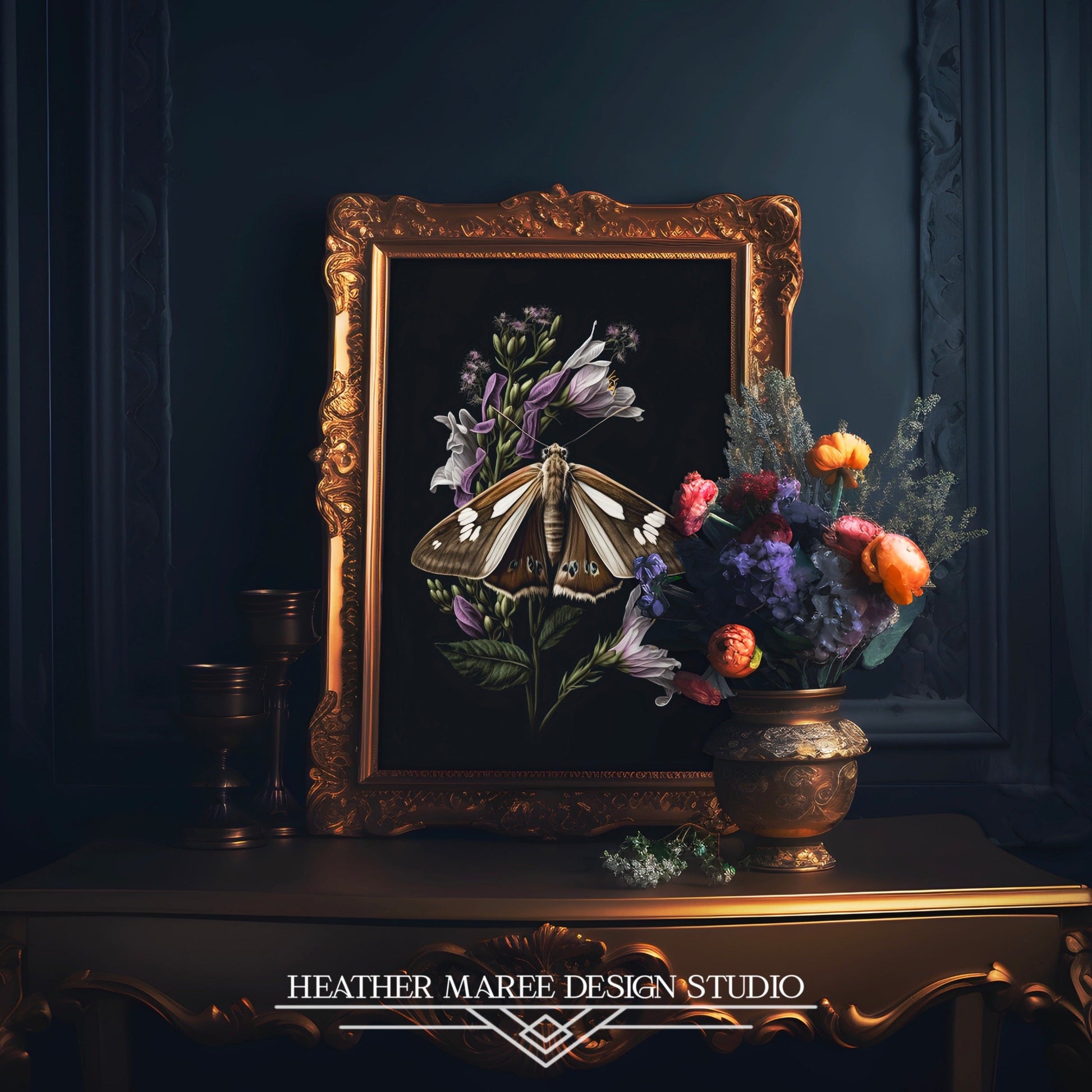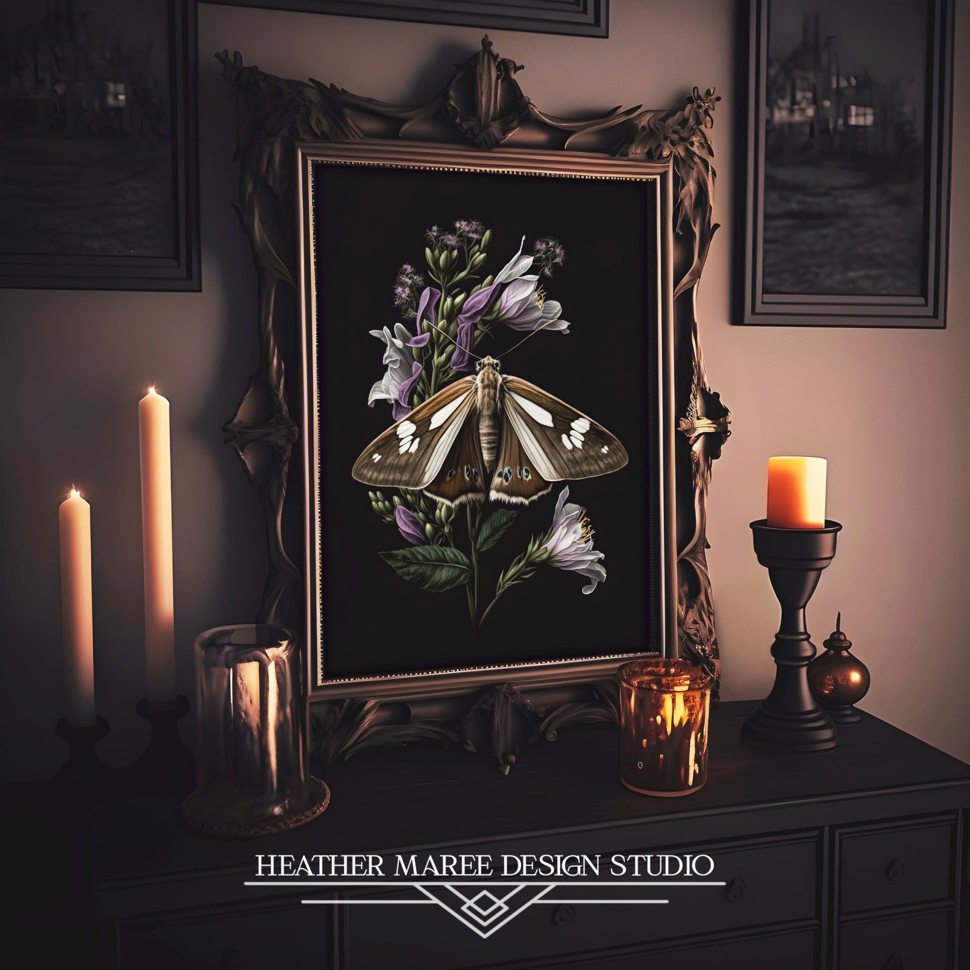 Embark on a journey into the realm of nature's exquisite beauty with this original digital painting. Here, a velvety brown moth, adorned with intricate ivory and black markings, delicately alights upon a sprig of dark green foliage. This verdant setting is further enhanced by soft purple flowers, their delicate white-tipped petals adding a touch of elegance to the scene. All of this captivating natural beauty is set against a matte black background, skillfully showcasing the delicate balance between the enchanting world of nature and the mysterious allure of darkness.