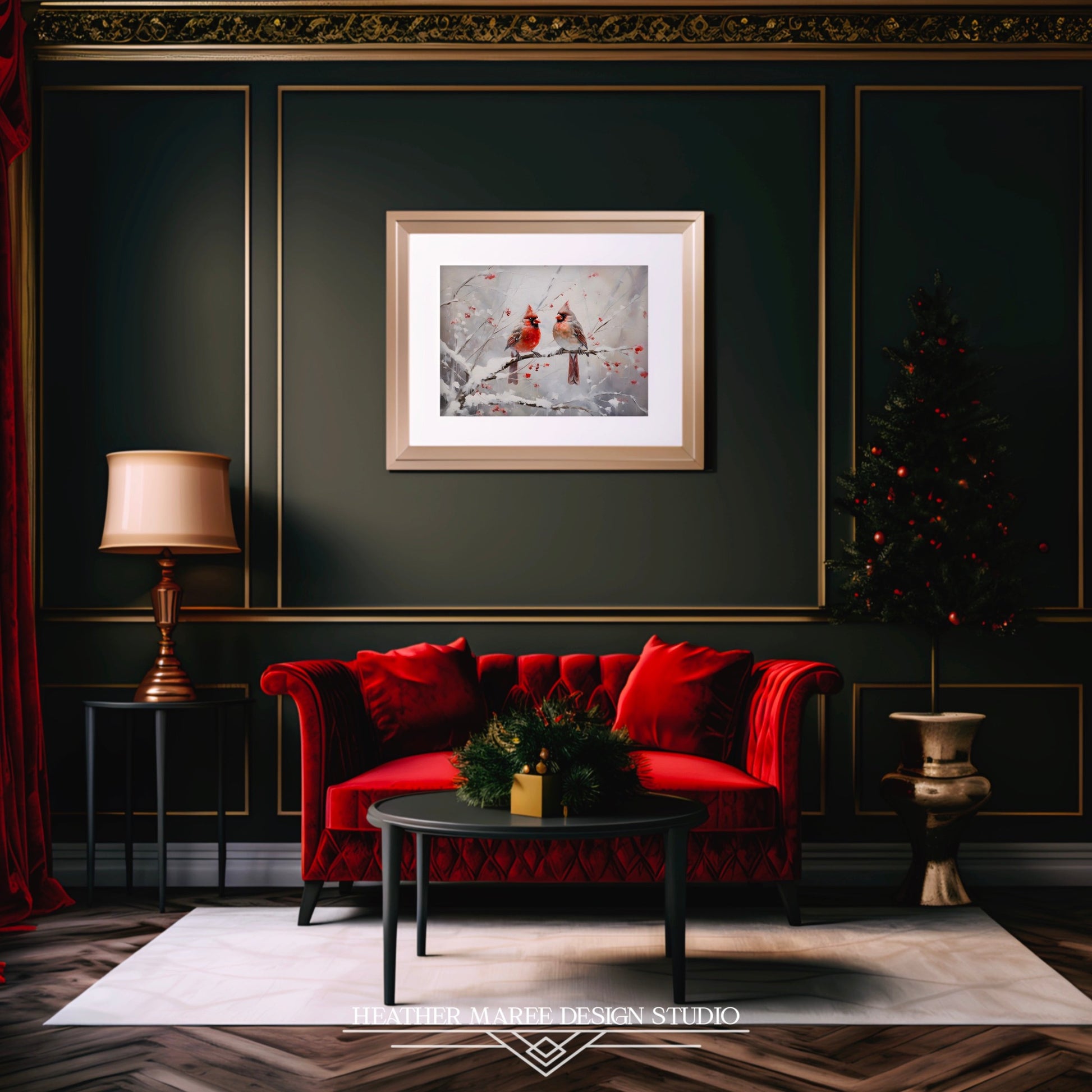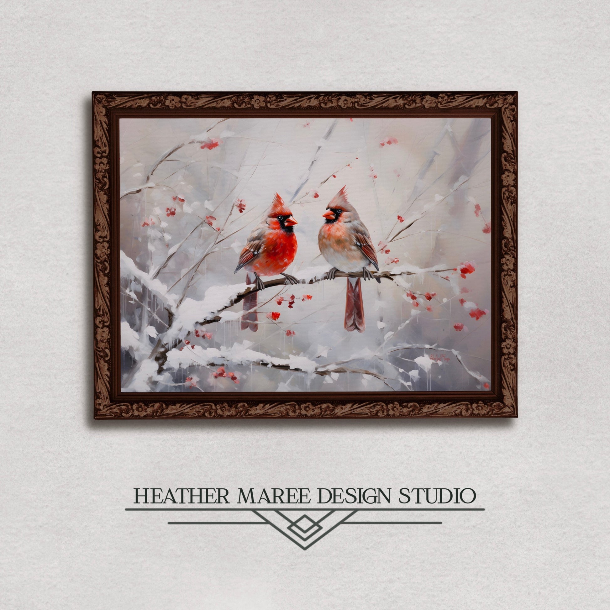 This exquisite artwork seamlessly complements a range of décor styles, making it a perfect addition to rustic, Christmas, and holiday home décor. Its depiction of the cardinals amidst a winter wonderland brings the festive spirit to life, making it an ideal choice to enhance the ambiance of your space during the holiday season. Whether you're adorning your home with a maximalist or vintage-inspired touch, this painting's timeless beauty and soothing palette will infuse your space with a touch of nature's tranquility, creating a cozy and inviting atmosphere.