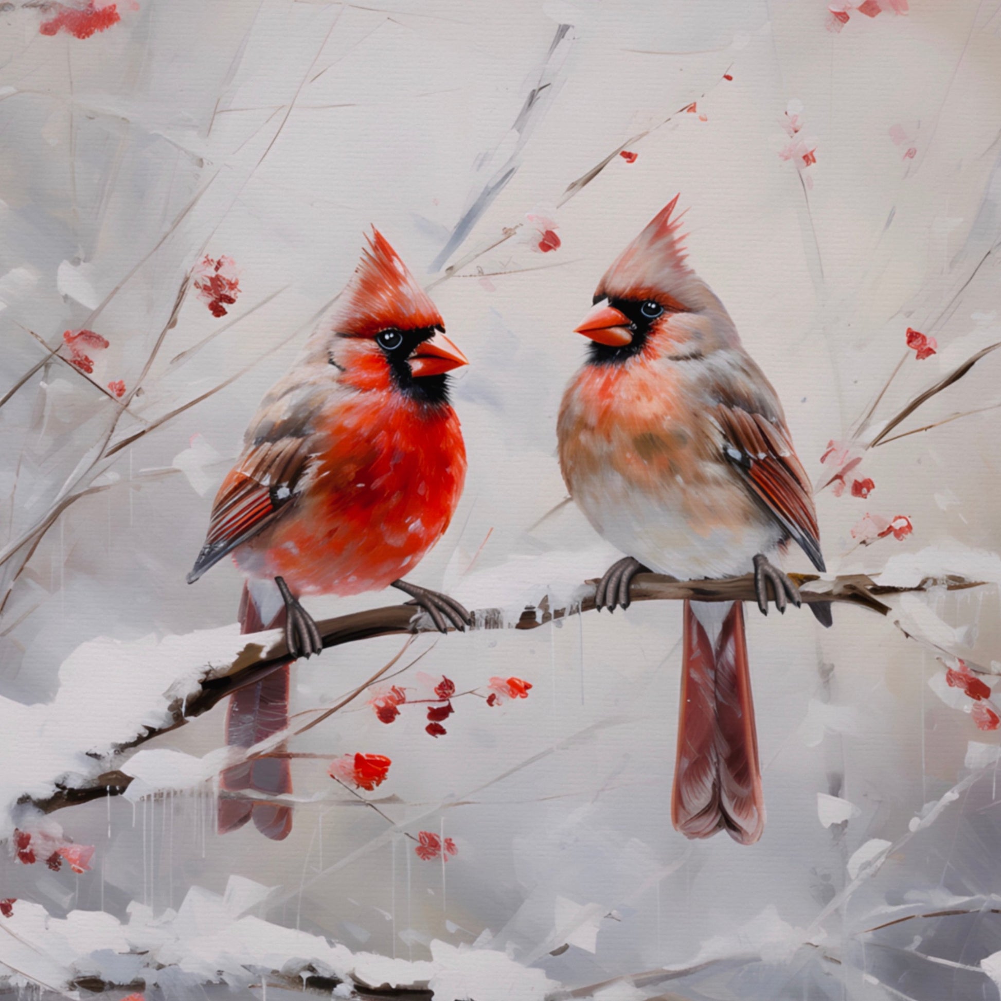 Embrace the serene allure of winter with this captivating original digital oil painting. Two lovely cardinals, a male and a female, elegantly rest on a snowy branch adorned with delicate red berries lightly dusted in snow. Against the backdrop of soft, snowy surroundings, this artwork captures the essence of nature's tranquil beauty during the colder months.
