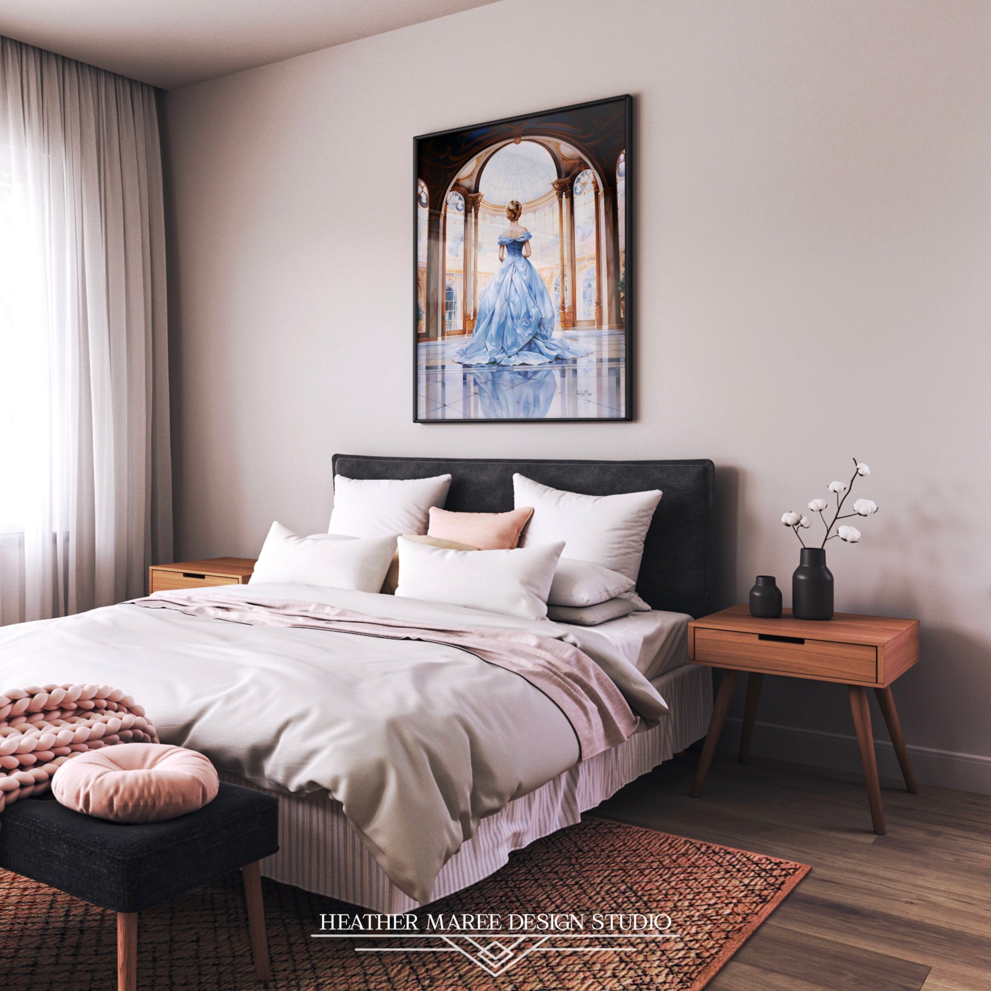 This art print goes beyond the ordinary, offering a unique addition for classic fairy tale enthusiasts. The meticulous attention to detail in Cinderella's portrayal makes it an ideal choice for those seeking distinctive maximalist-inspired home decor, as well as those drawn to French country aesthetics and vintage-inspired styles. The seamless blend of elegance and nostalgia transforms this illustration into a captivating focal point that can elevate the ambiance of any space.
