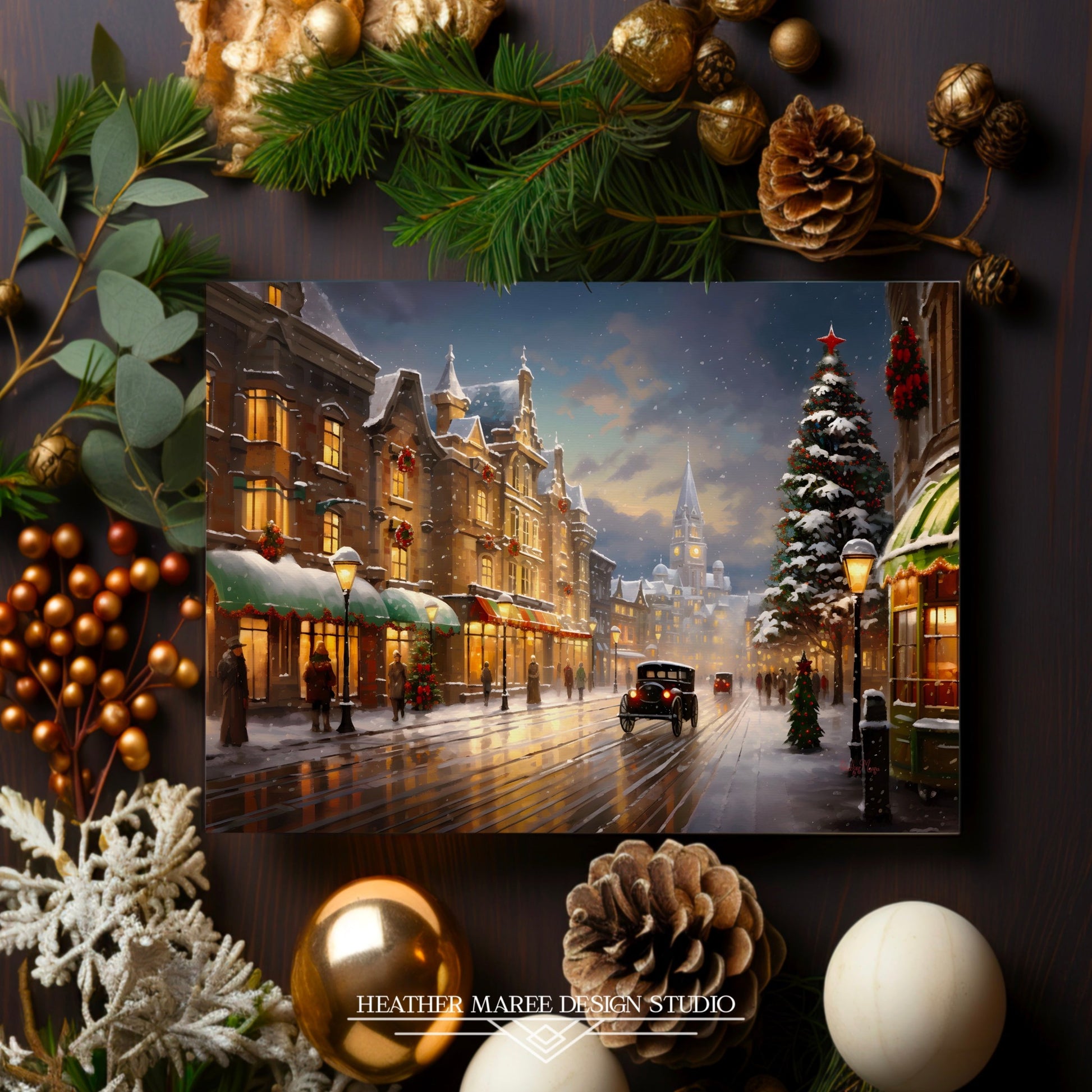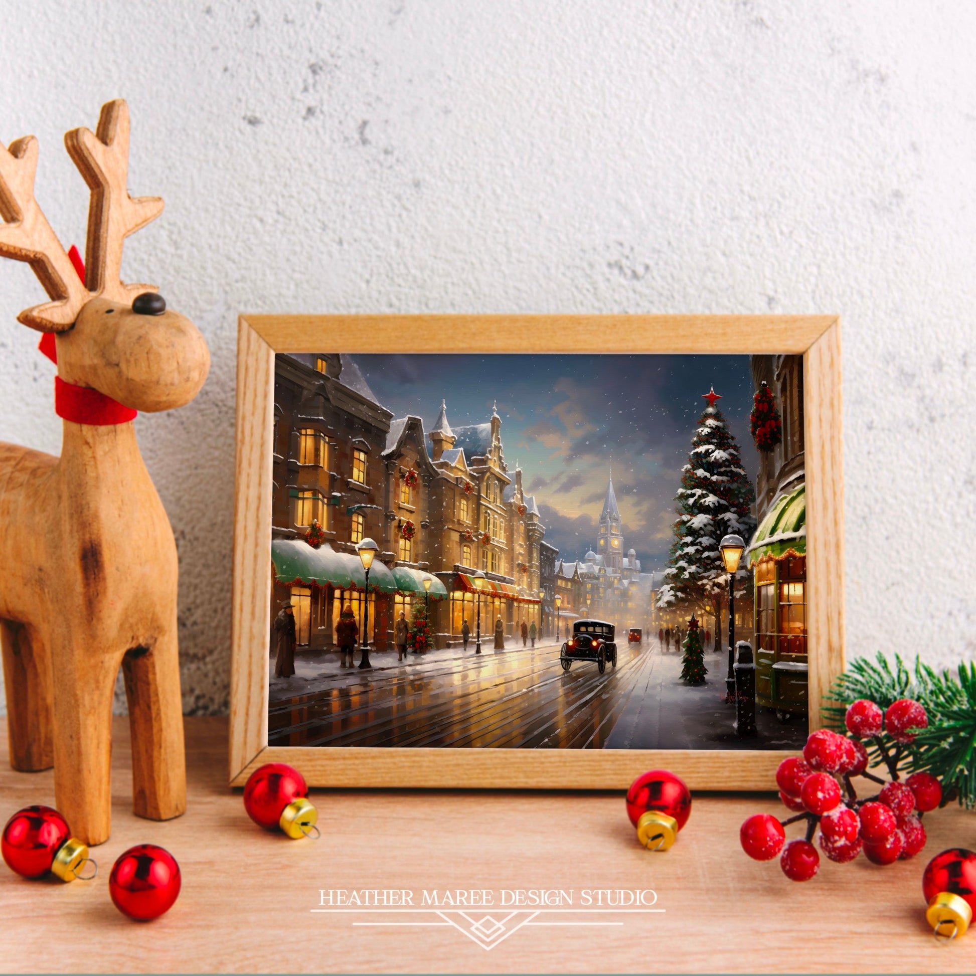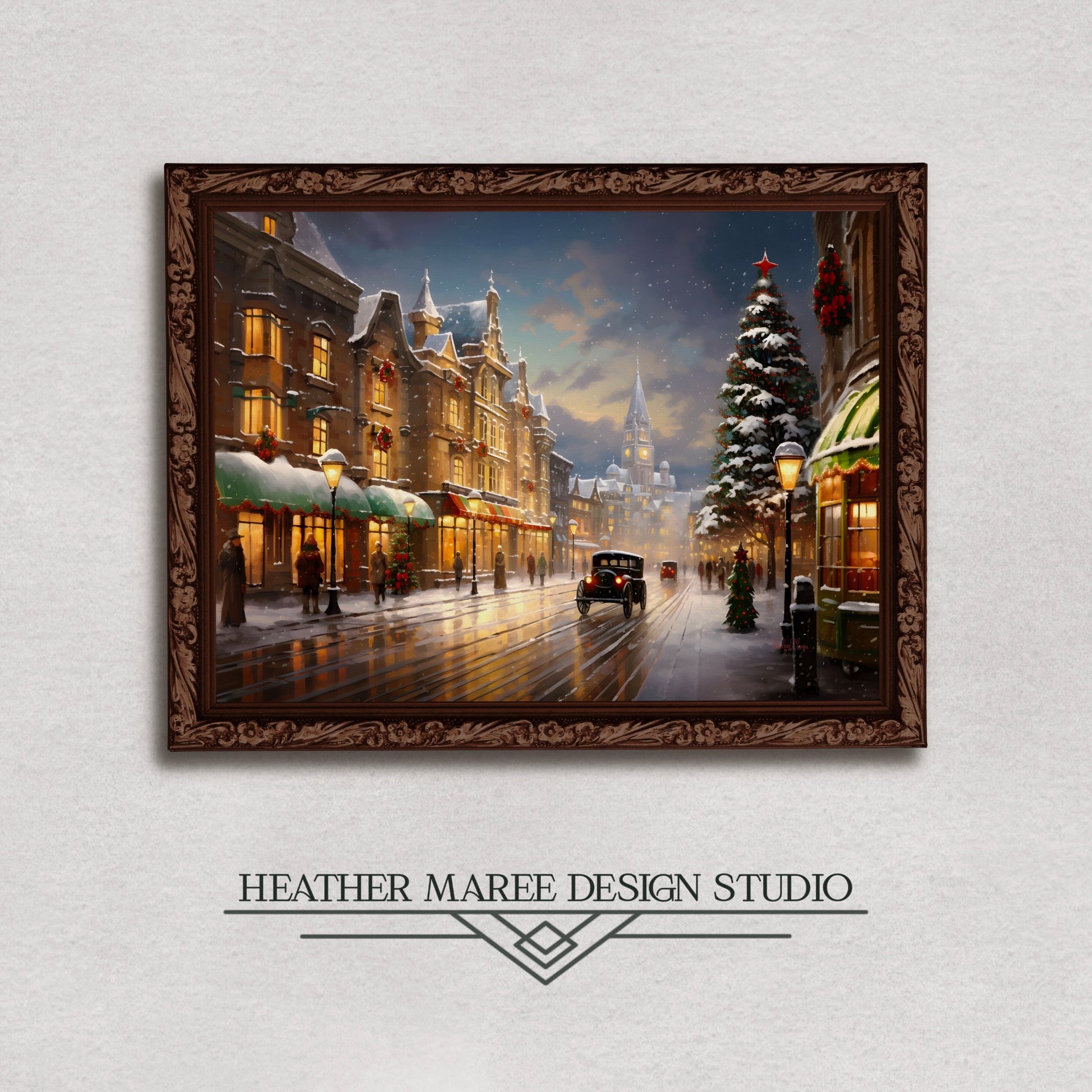 Experience the enchantment of a bygone era with this captivating digital impressionist painting. Transport yourself to a snowy 1920s city street aglow with the soft radiance of Christmas lights at dusk. Stroll down the snow-kissed pavement and take in the allure of festively adorned buildings, complete with charming holiday decorations and wreaths. A grand Christmas tree graces the background, its luminous lights casting a warm and inviting ambiance 🎄🎁