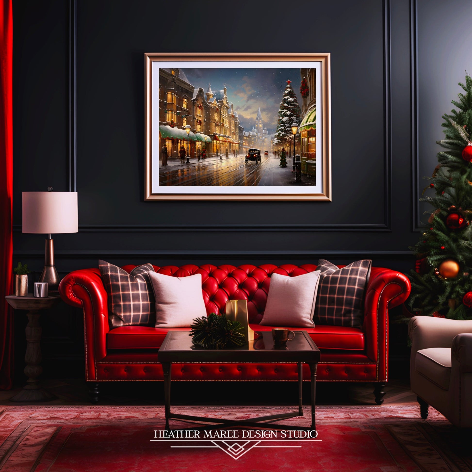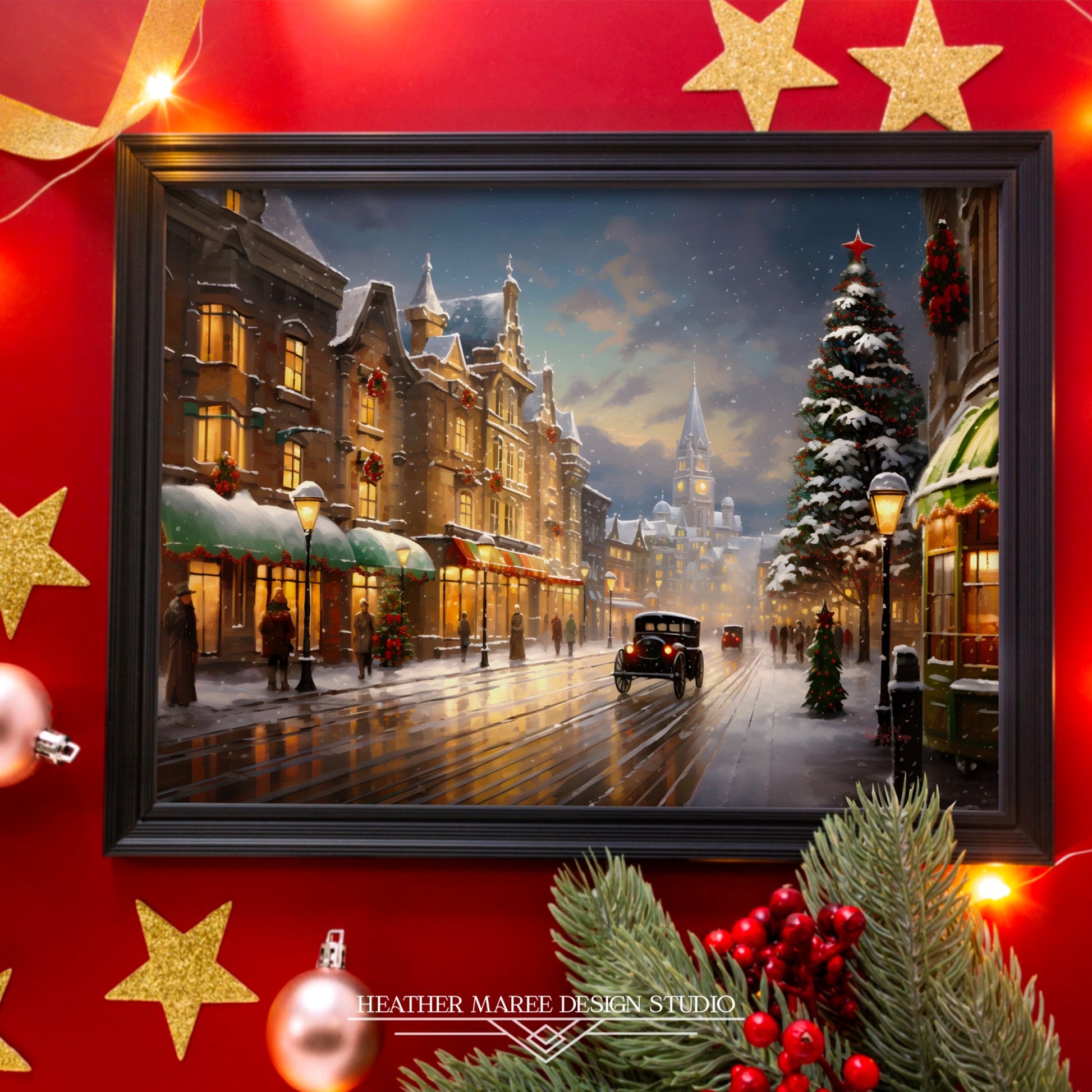 Experience the enchantment of a bygone era with this captivating digital impressionist painting. Transport yourself to a snowy 1920s city street aglow with the soft radiance of Christmas lights at dusk. Stroll down the snow-kissed pavement and take in the allure of festively adorned buildings, complete with charming holiday decorations and wreaths. A grand Christmas tree graces the background, its luminous lights casting a warm and inviting ambiance 🎄🎁