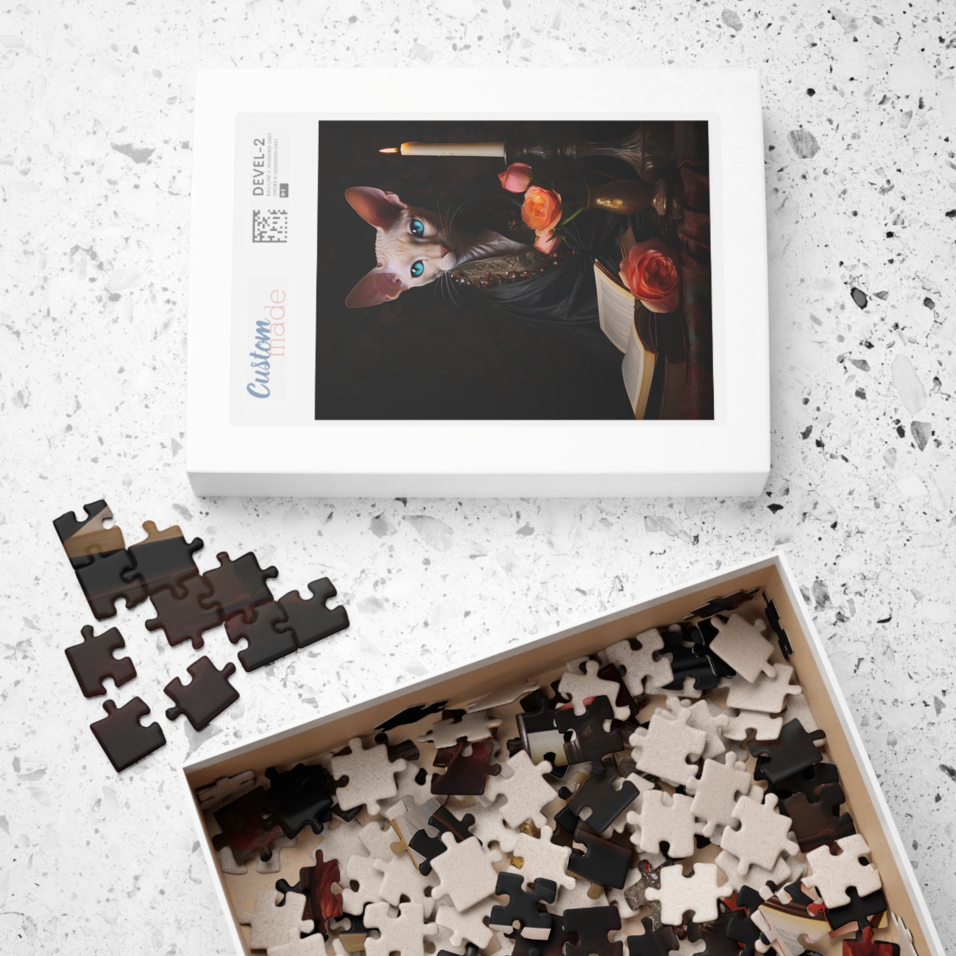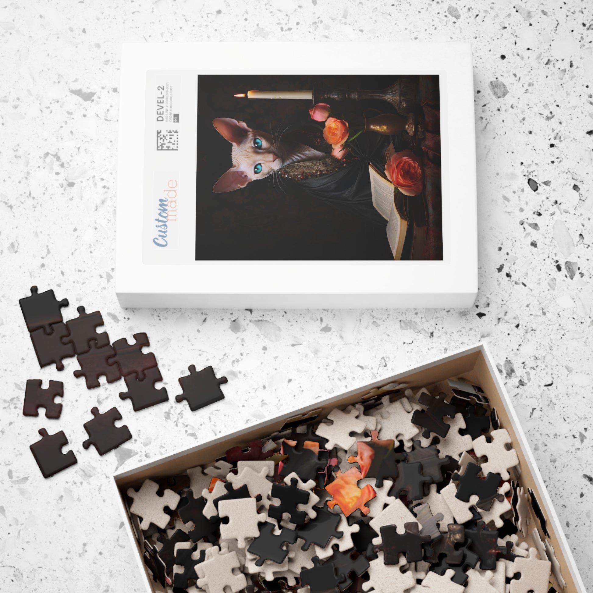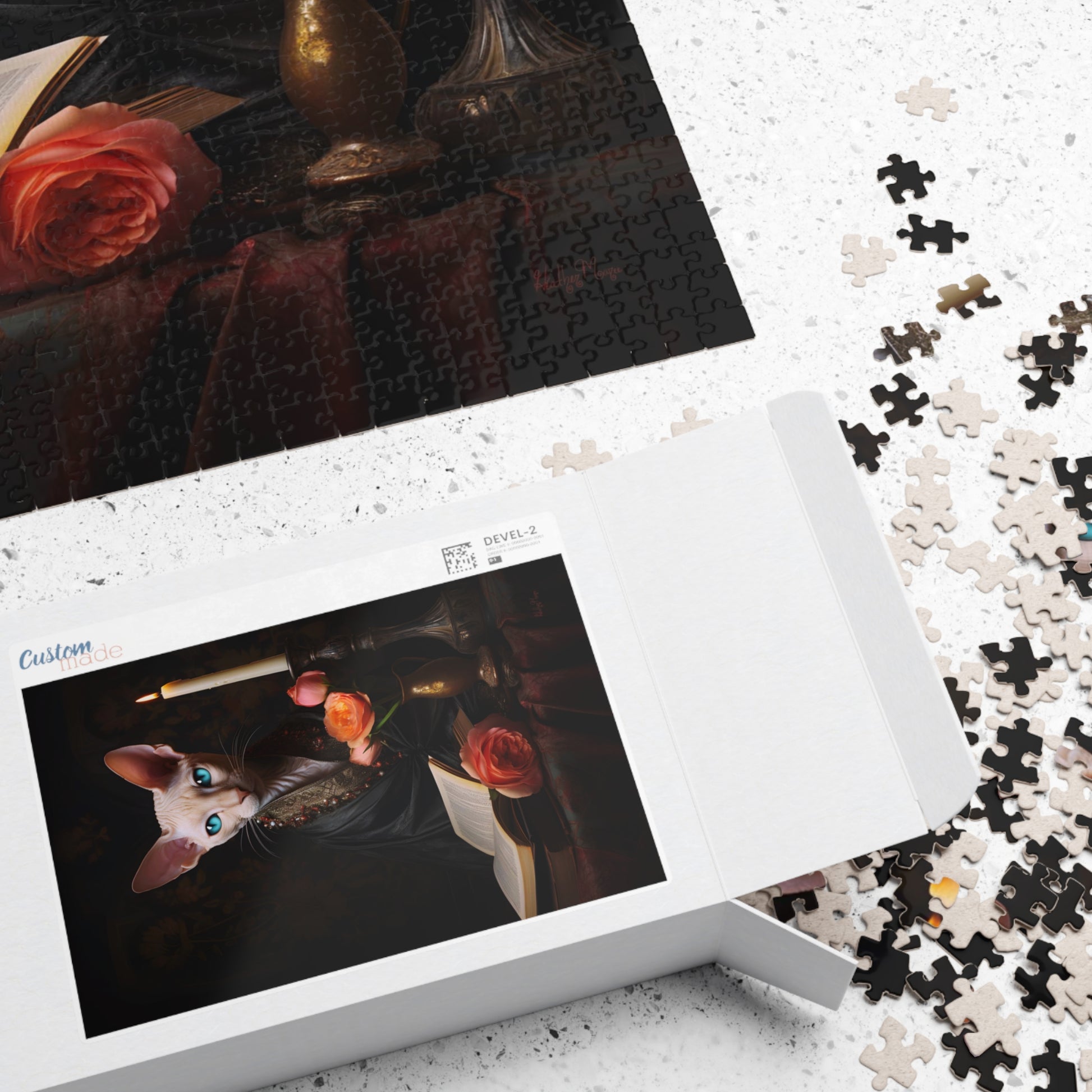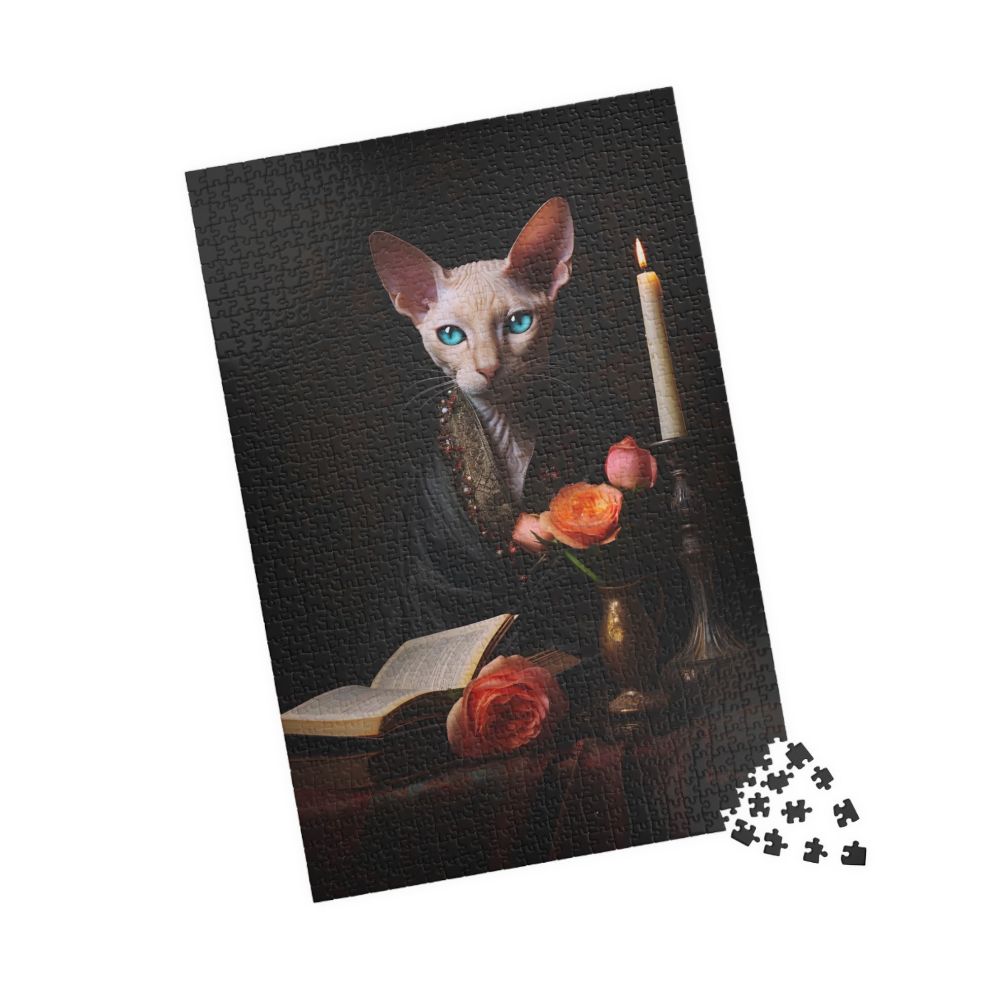 Indulge your senses in the captivating world of this charming original digital oil painting, which showcases a white Cornish Rex cat with piercing blue eyes, perched regally upon a table adorned with old books, delicate pink roses, and a flickering candle. This artwork is a symphony of elegance and mystique, inviting you into a realm of enchanting visuals. This puzzle would be an excellent gift for someone who loves moody vintage inspired oil paintings and beautiful white cats. Once the puzzle is completed it can be turned into a beautiful wall hanging 🖼️💖