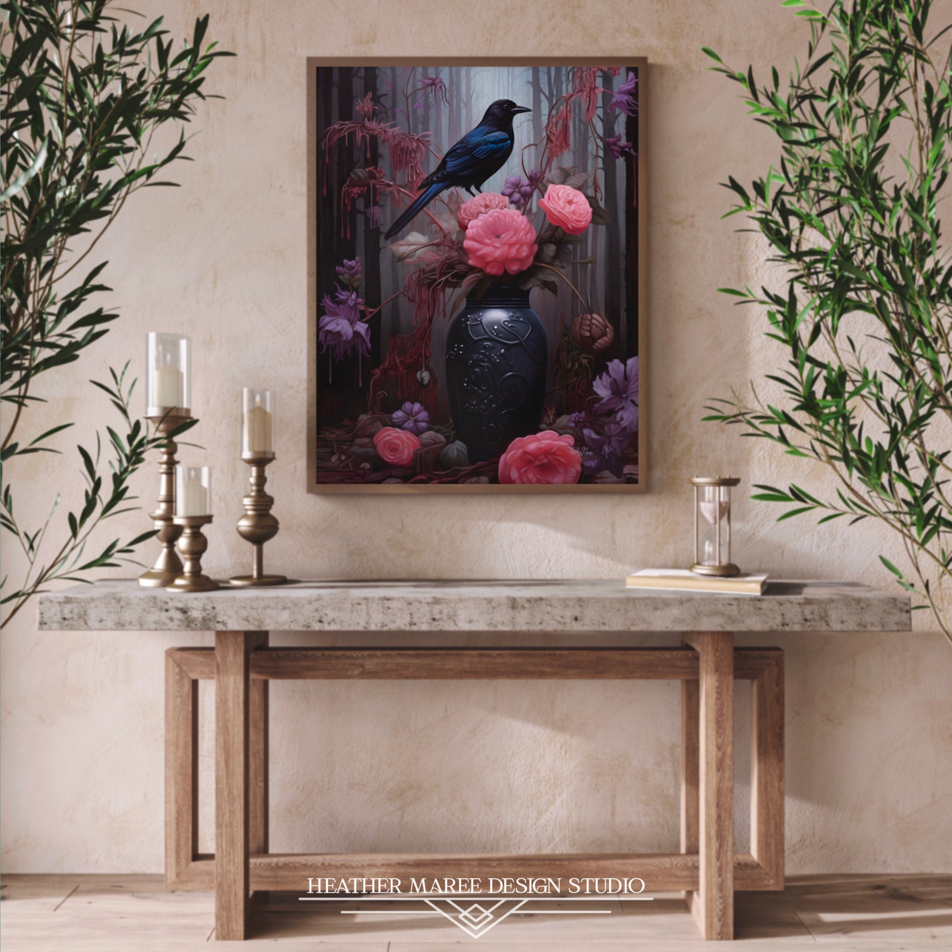 This captivating original painting features a majestic black crow perched atop a decorative vase, its gaze piercing through the ethereal ambiance. Within the vessel, a curious bouquet of pink and muted purple flowers, set against a backdrop of a moody forest completing the captivating tableau.