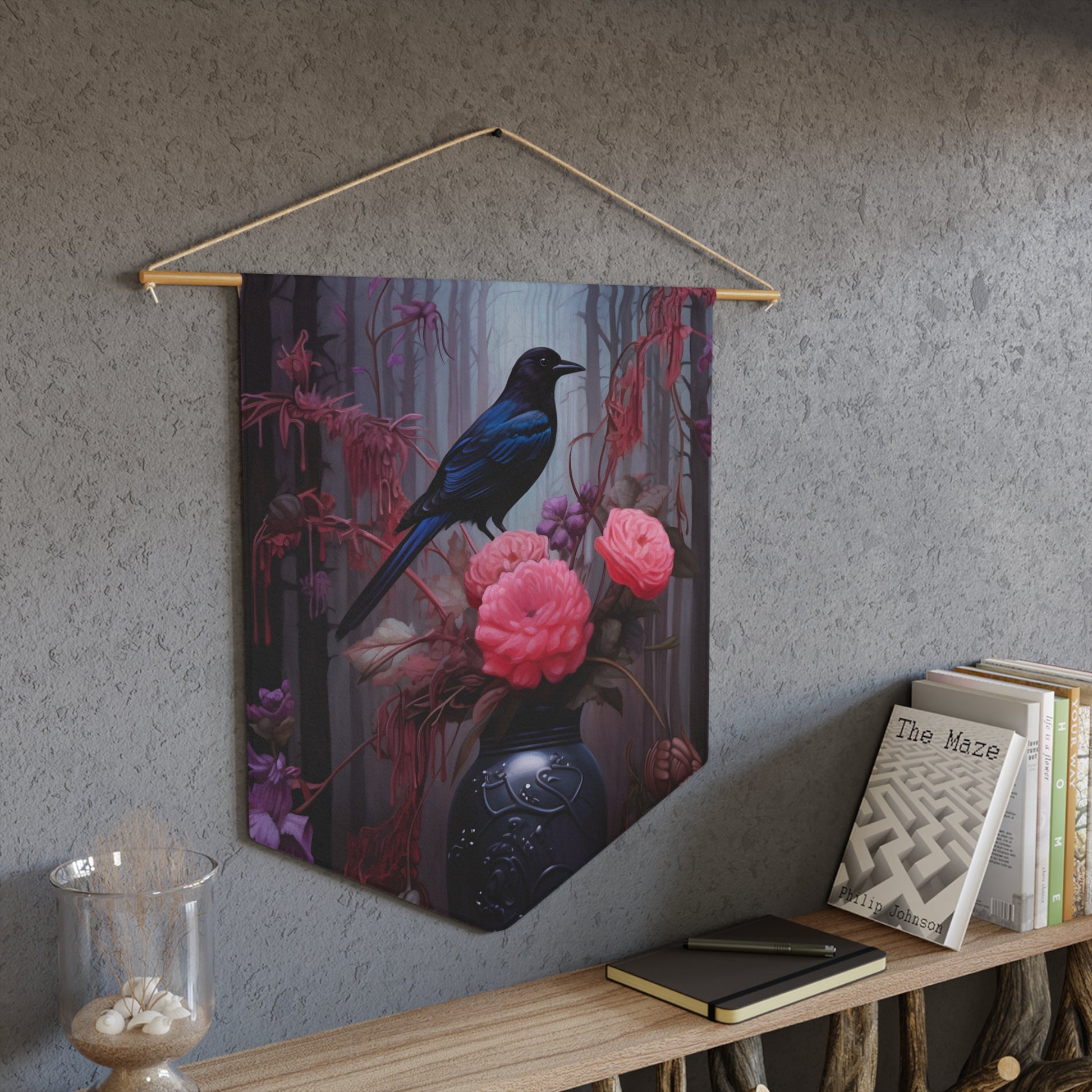 The dark allure of this fabric pennant is perfect for accentuating the ambiance of moody vintage interiors, gothic-inspired spaces, amongst other maximalist decor aesthetics. Whether adorning the walls of a cozy reading nook, lending an air of mystery to a gothic bedroom retreat, or infusing a maximalist living area with enchanting charm, this print adds depth and character to any space it graces.