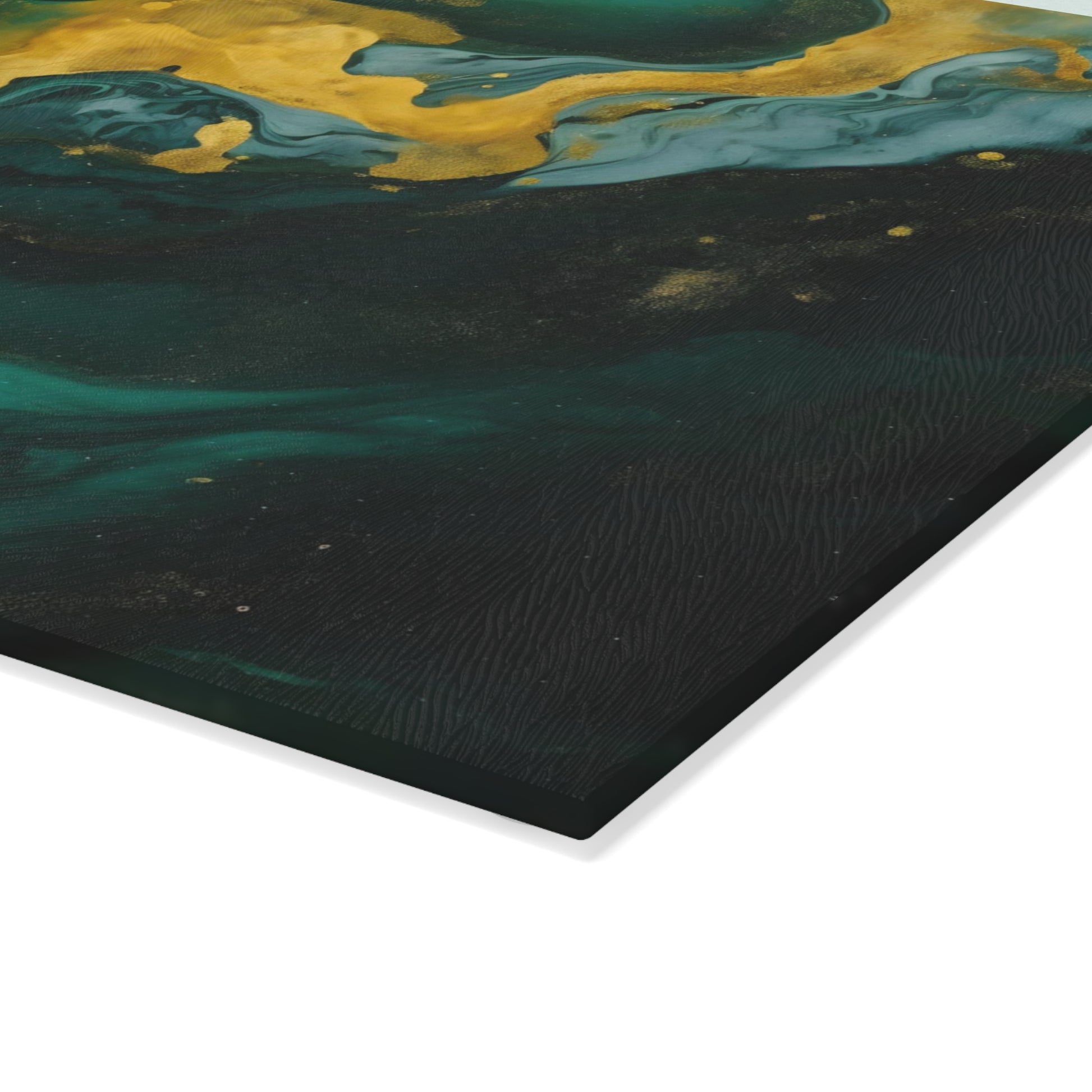 Introducing a handcrafted glass cutting board featuring a sophisticated marbled design in dark green, teal, and ivory, adorned with glimmering gold accents. Meticulously crafted, this exquisite piece brings a unique touch of character to enhance the aesthetic of any kitchen. Elevate both style and functionality with the addition of this beautiful glass cutting board, designed to infuse your culinary space with sophistication and charm 🖼️💖