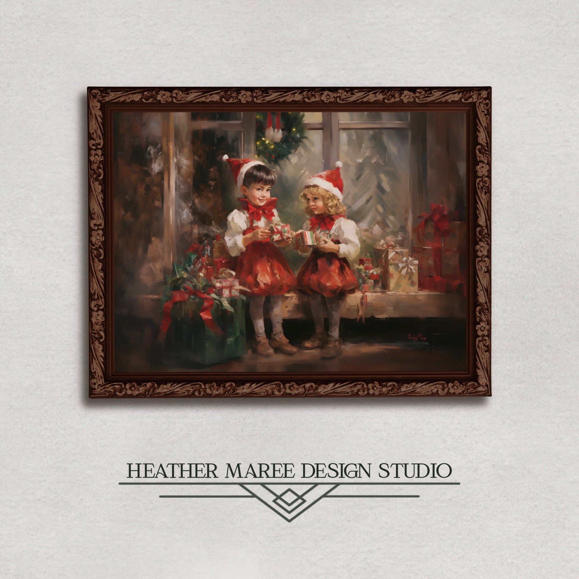 Embark on a journey into the heartwarming world of Christmas with this captivating digital impressionist painting. Delight in the scene of two adorable Christmas elves as they stand amidst the magical chaos of Santa's workshop, playfully comparing their beautifully wrapped presents. The rustic workshop ambiance, complete with intricate details and a glimpse of snowy outdoors through a window, captures the essence of the holiday season in a cozy and inviting manner.