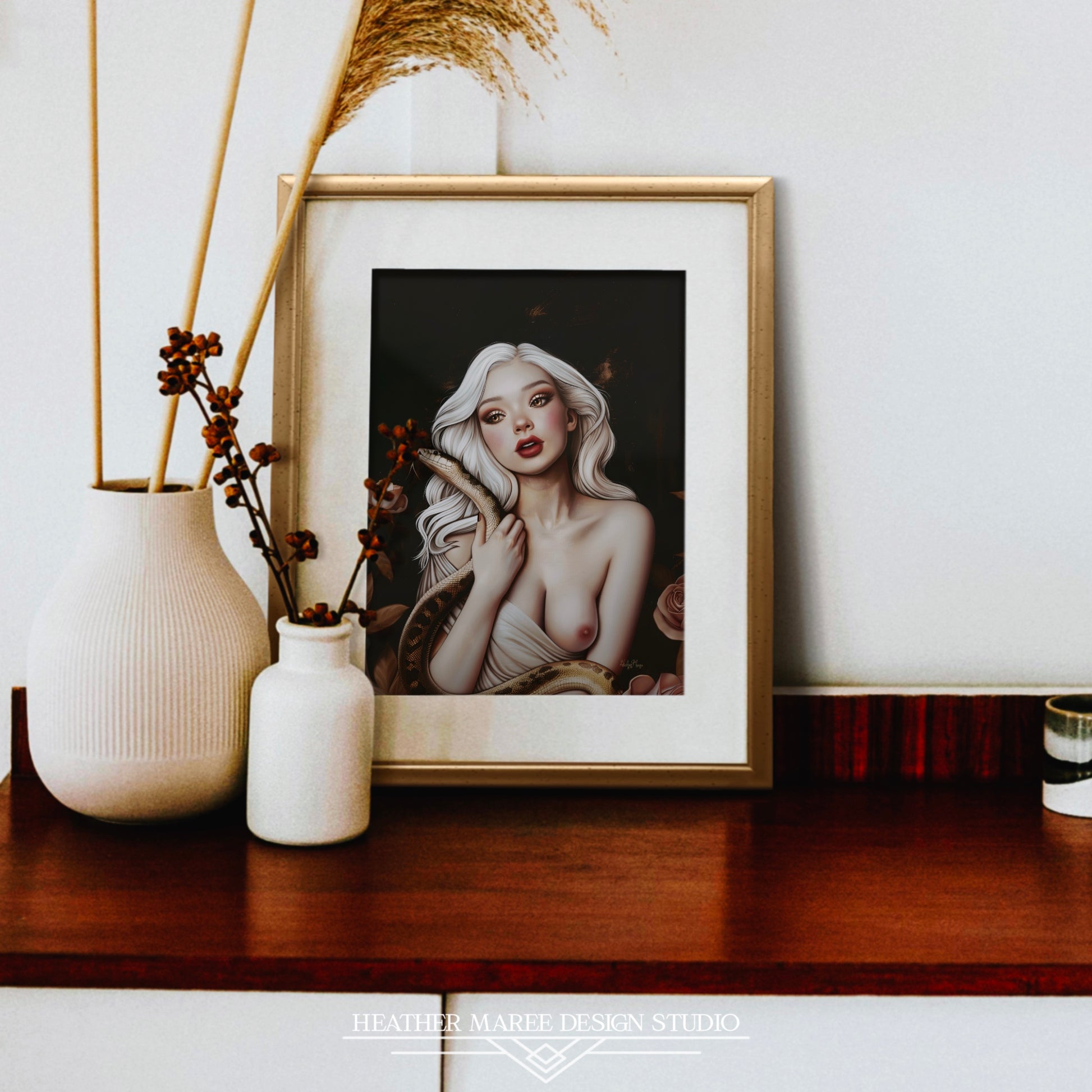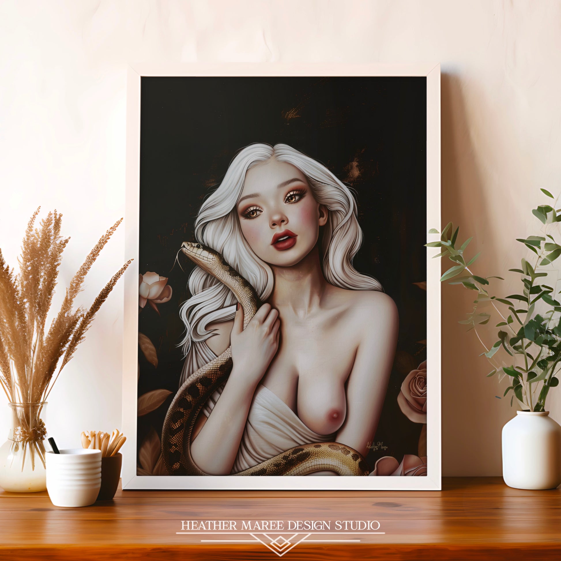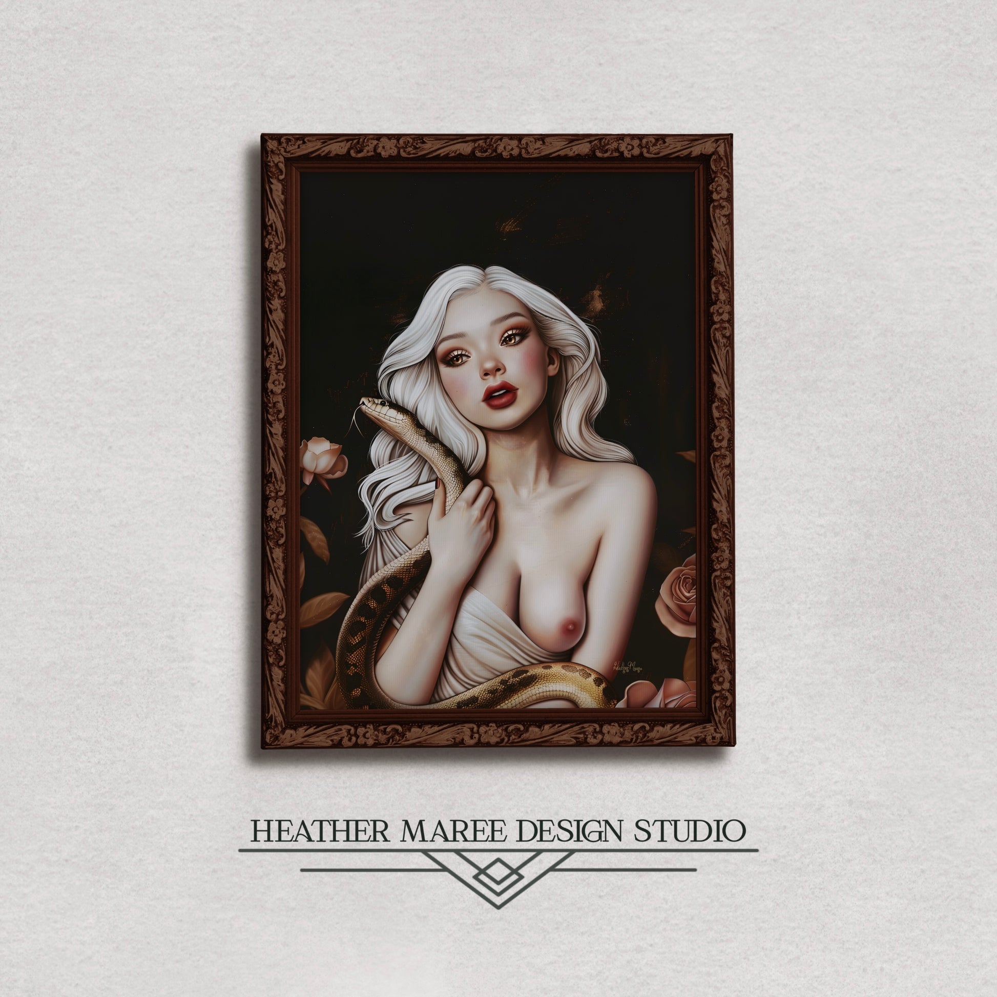 This bewitching original fine art print features a striking image of a young woman with flowing white hair, her gaze both intense and captivating. She holds a serpent gracefully wrapped around her bare shoulders, its textured scales contrasting with her smooth, porcelain skin. Her rosy cheeks and bold red lips add a touch of warmth to the otherwise cool, ethereal palette. The background is a deep, dark canvas, accentuated by hints of gold and bronze, with delicate roses framing the scene.