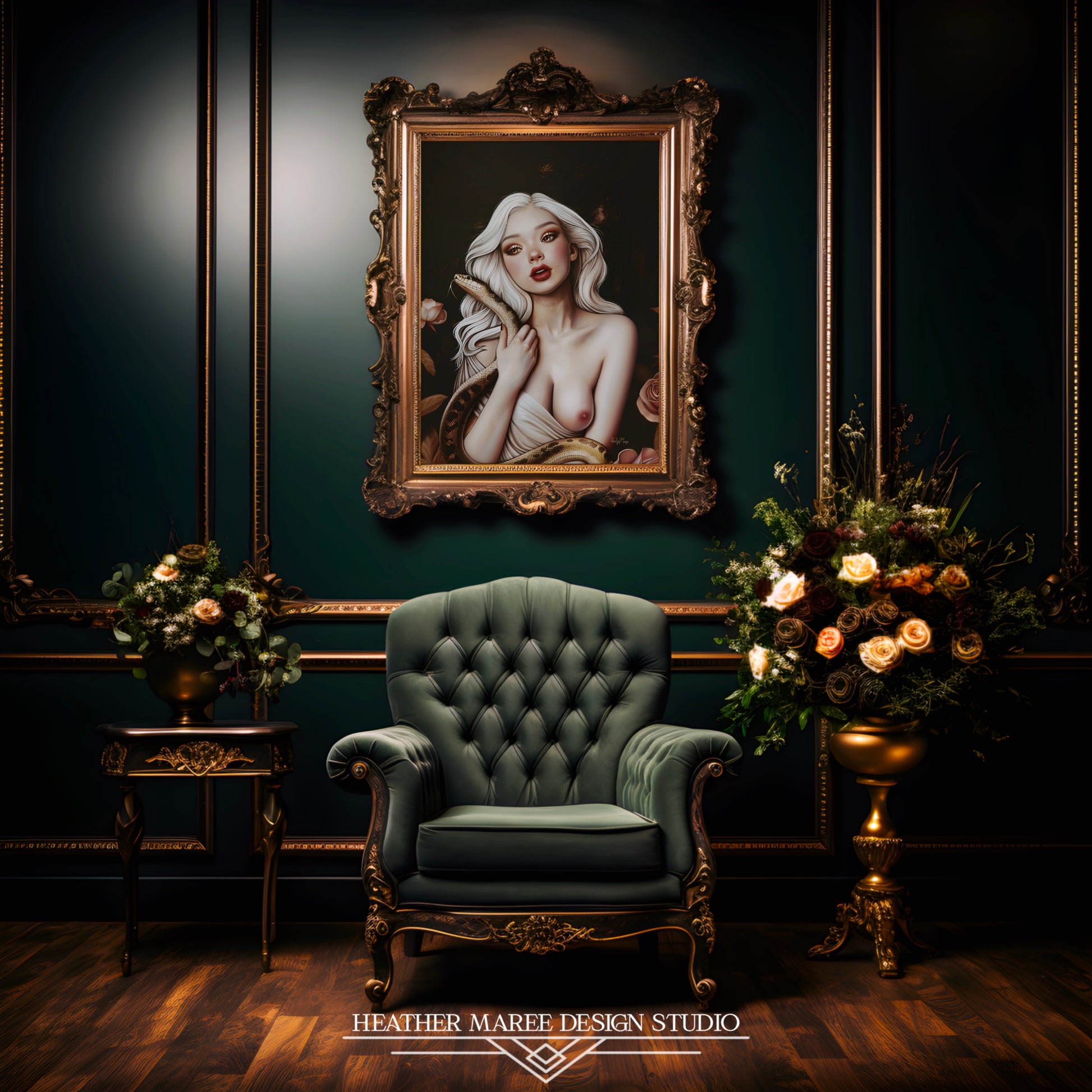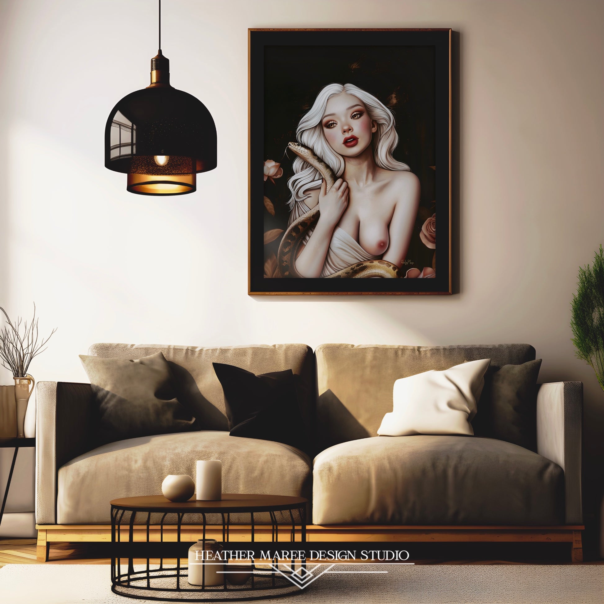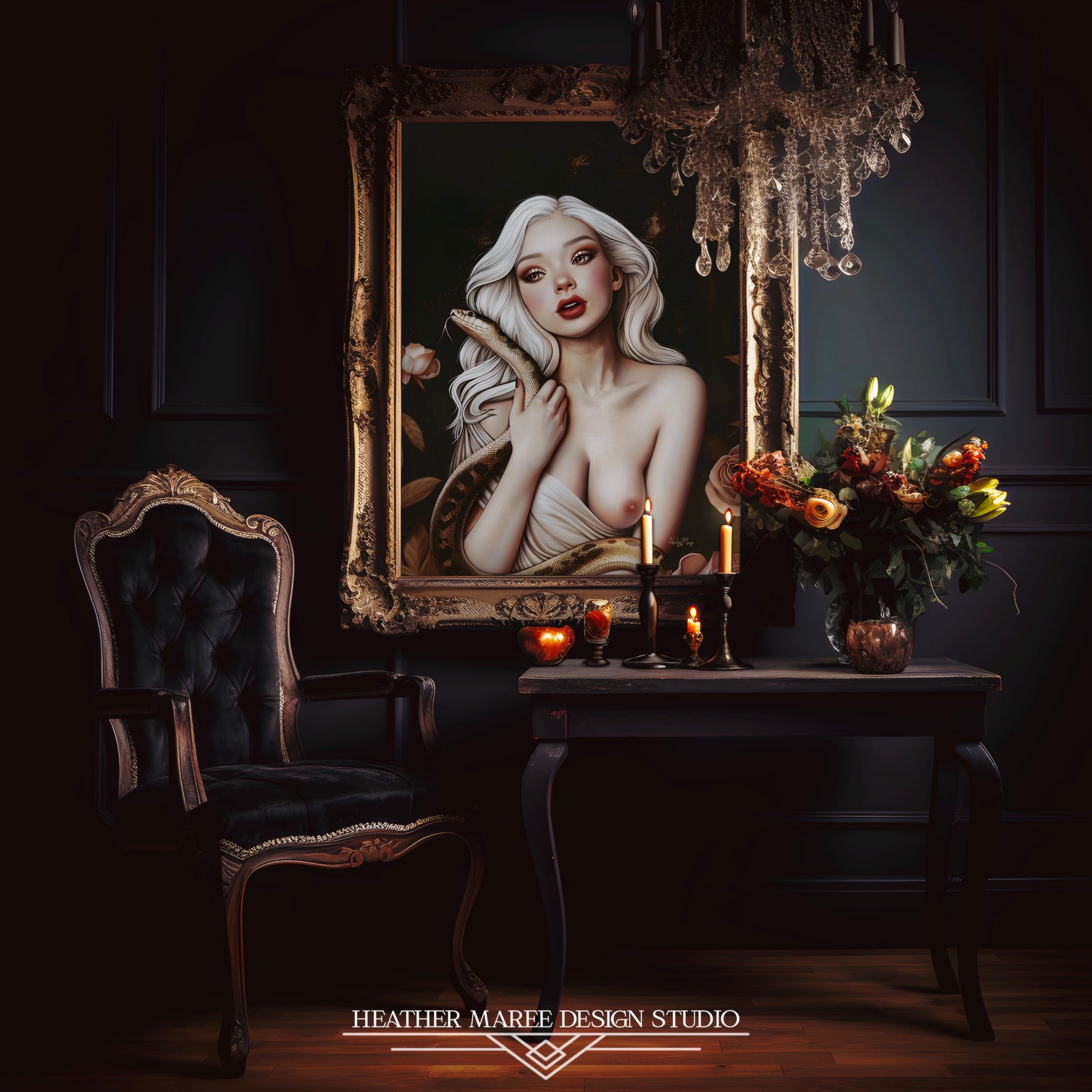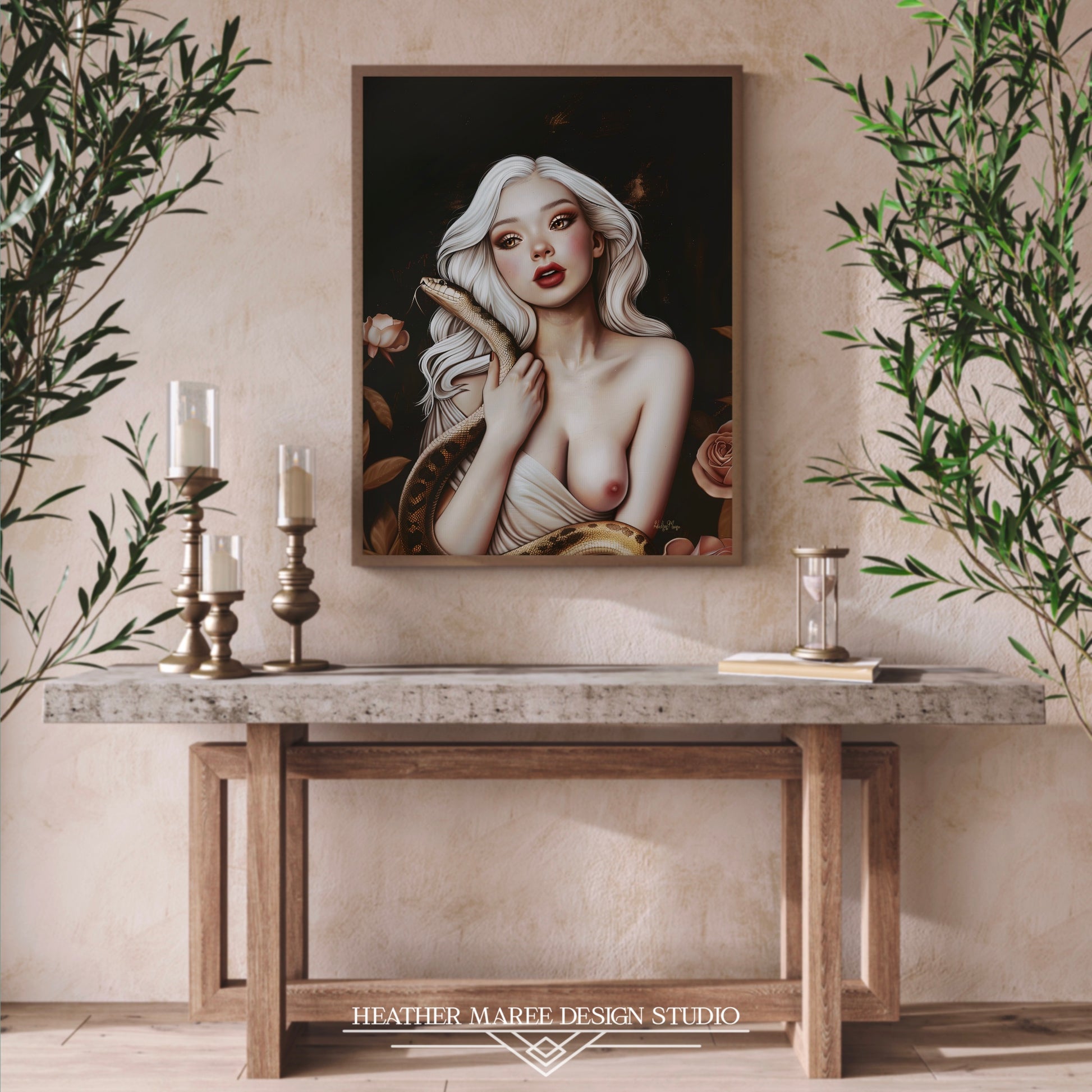 This bewitching original fine art print features a striking image of a young woman with flowing white hair, her gaze both intense and captivating. She holds a serpent gracefully wrapped around her bare shoulders, its textured scales contrasting with her smooth, porcelain skin. Her rosy cheeks and bold red lips add a touch of warmth to the otherwise cool, ethereal palette. The background is a deep, dark canvas, accentuated by hints of gold and bronze, with delicate roses framing the scene.