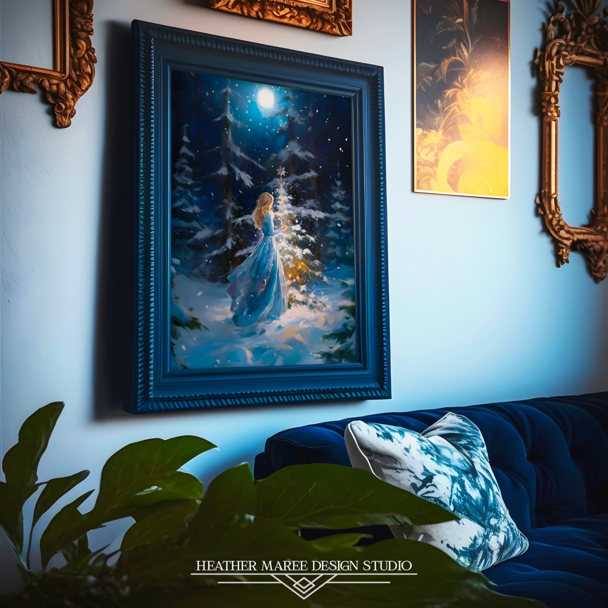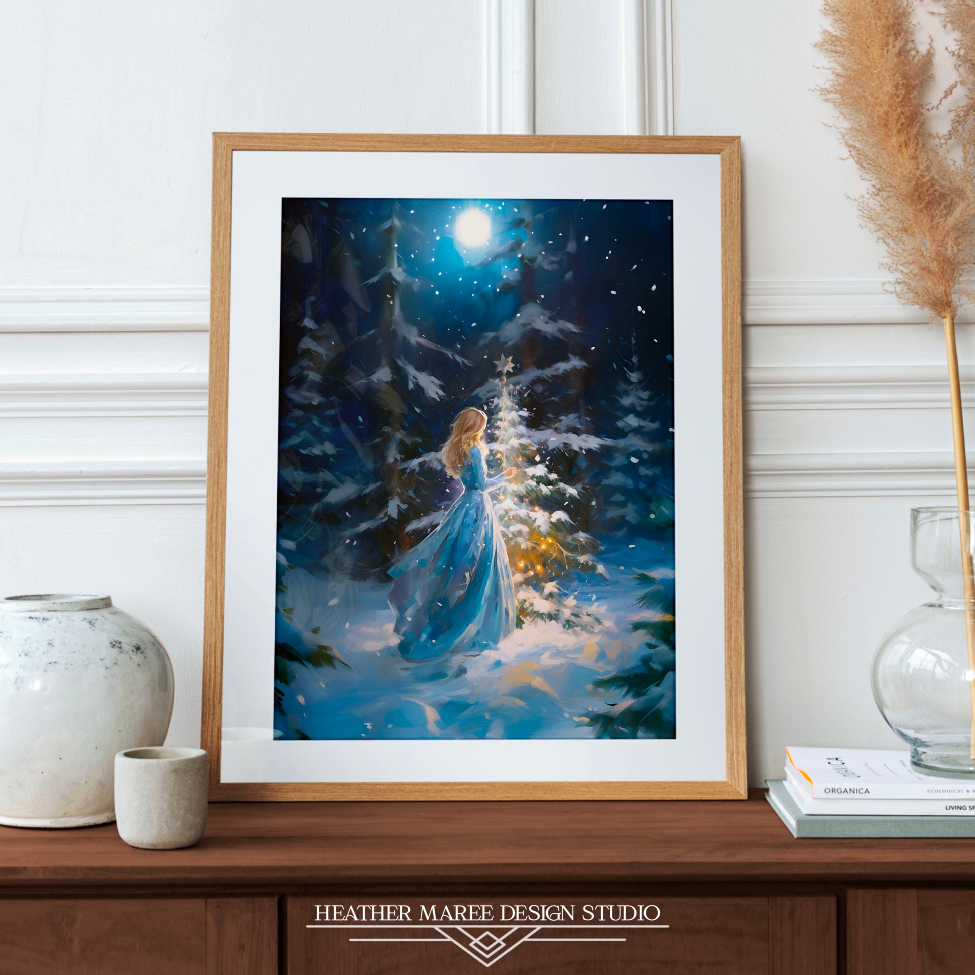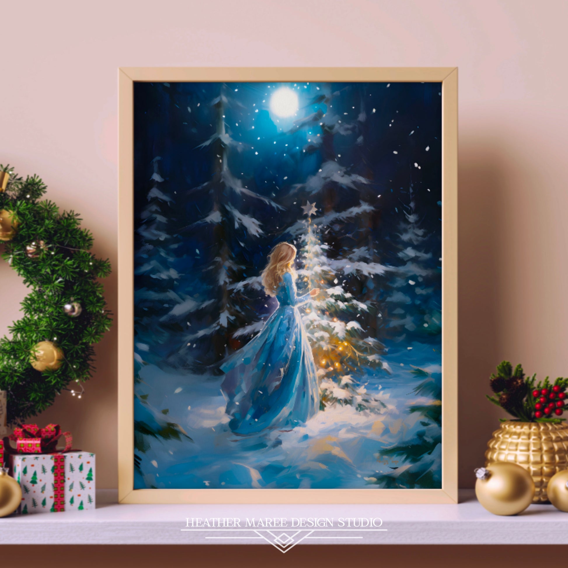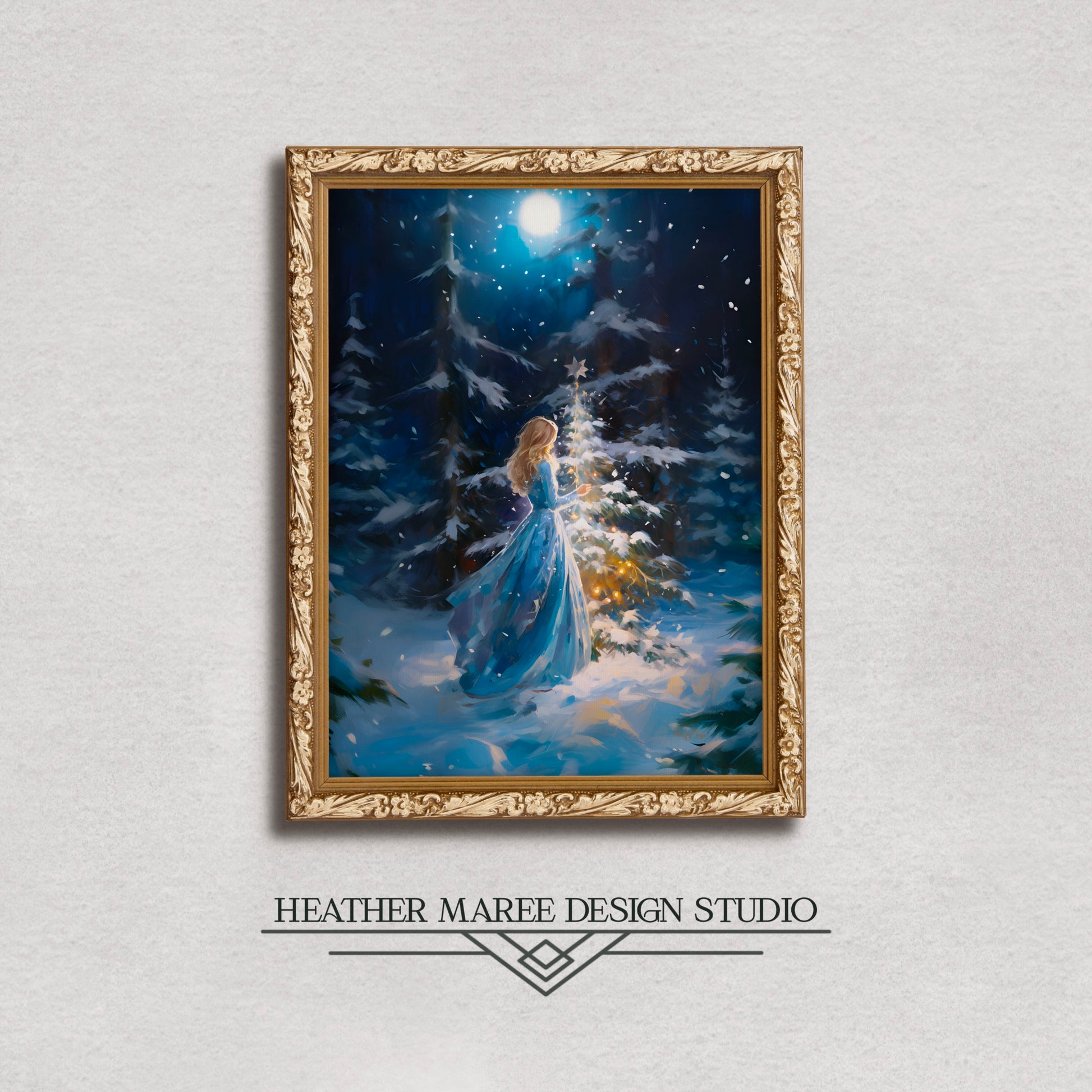 Capture the magic of the holiday season with this enchanting original impressionist painting of young woman with flowing golden hair. She is gracefully decorating a petite evergreen tree with a glimmering silver star. Her attire, a long and elegant blue dress, complements the serene wintry landscape that surrounds her. The ground is blanketed in a soft layer of snow, while majestic snow-covered pine trees stand tall in the background. Against the dark blue night sky, delicate snowflakes dance in the air, creating a sense of wonder and warmth in this charming scene.