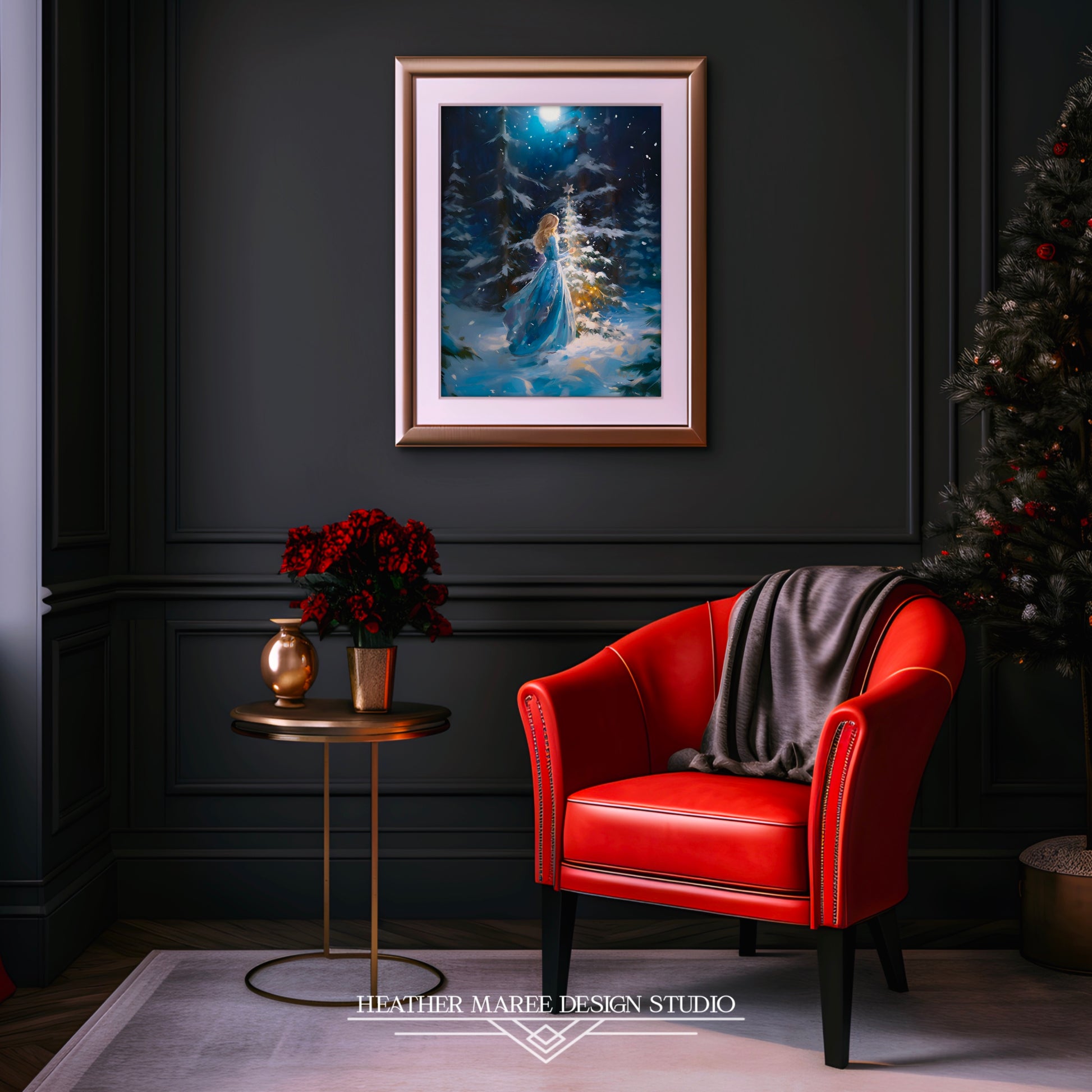 This artwork holds the essence of the holiday spirit, making it a perfect addition to your festive décor. Its soothing hues and joyful atmosphere will beautifully complement rustic, Christmas, and winter-themed home interiors. Whether displayed on its own or as part of a curated collection, this piece brings a touch of maximalist allure and vintage charm to any space. Let the magic of the season come to life with this enchanting portrayal of a young woman embracing the joy of decorating, inviting a sense of coziness into your home.