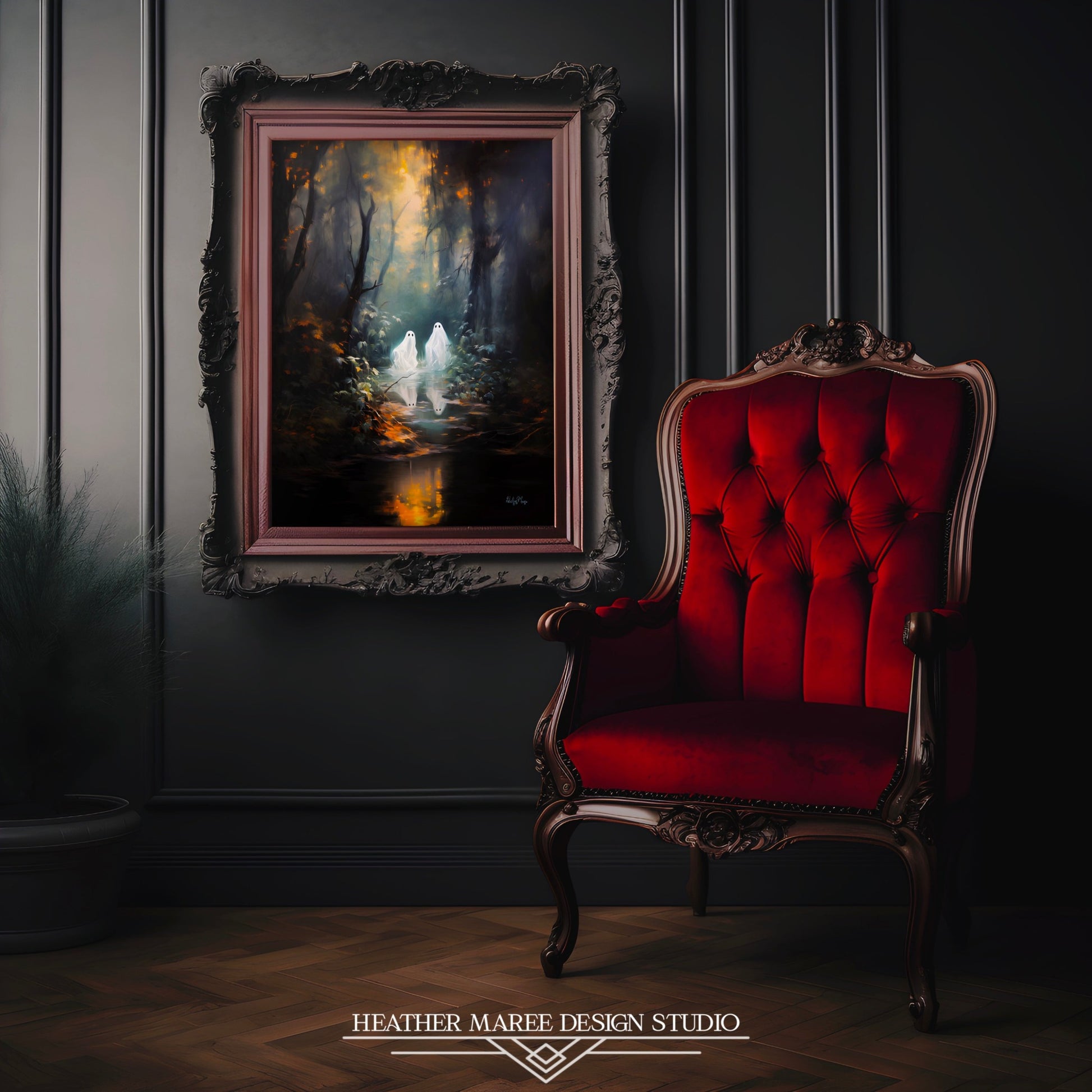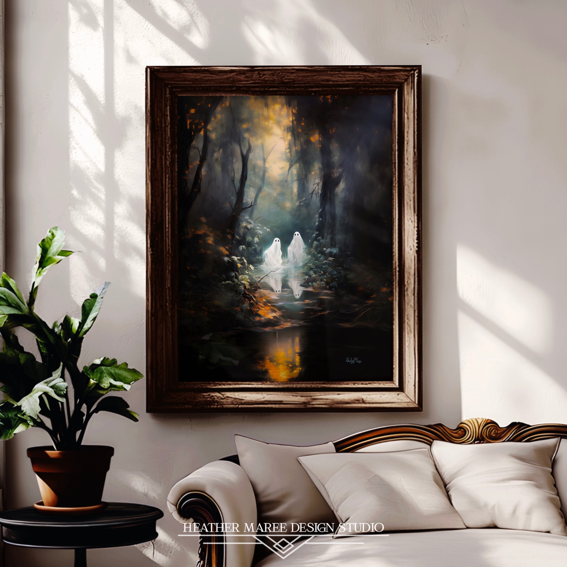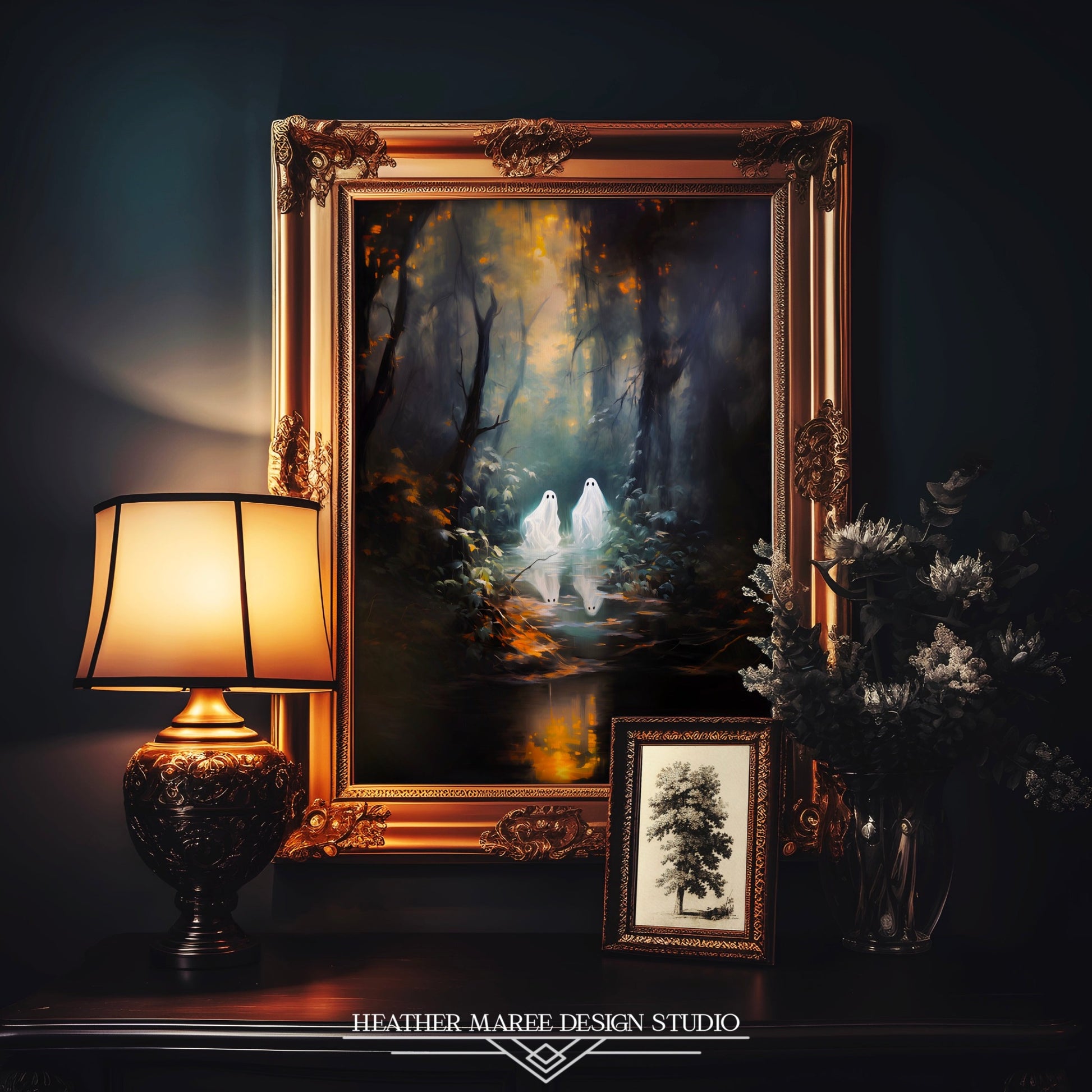 In the captivating realm of this original digital painting, two charming little ghosts embark on a mystical journey through a hauntingly moody forest. Golden sunlight filters through the dense canopy of towering, dark trees, creating a mesmerizing play of light and shadow. As the spectral figures wander, they approach a dark, tranquil pond that mirrors the ethereal beauty of the scene, casting an enigmatic, otherworldly glow. This artwork masterfully combines the supernatural with the natural, inviting viewers into a realm where enchantment meets the mysterious, and where every glance reveals new depths of wonder.