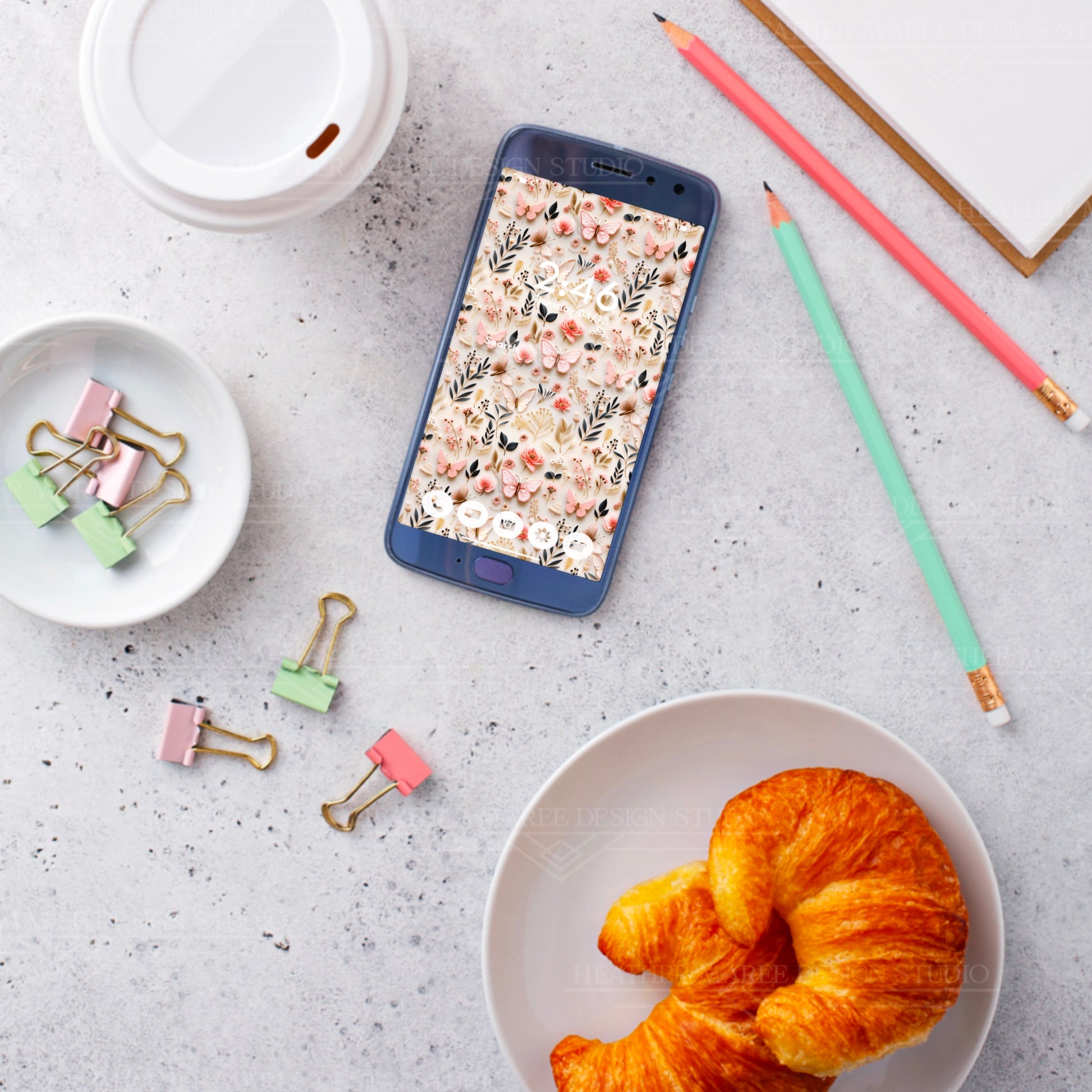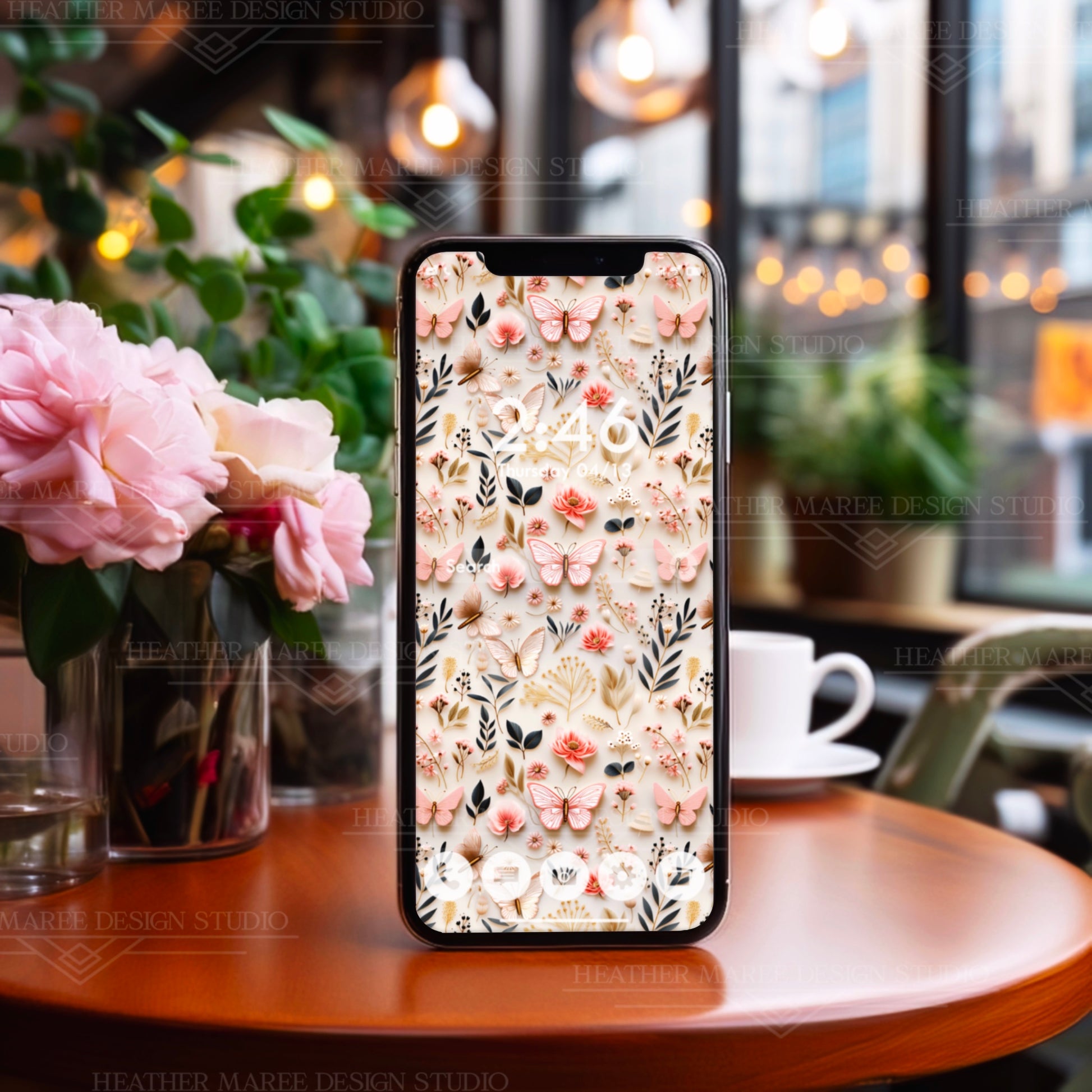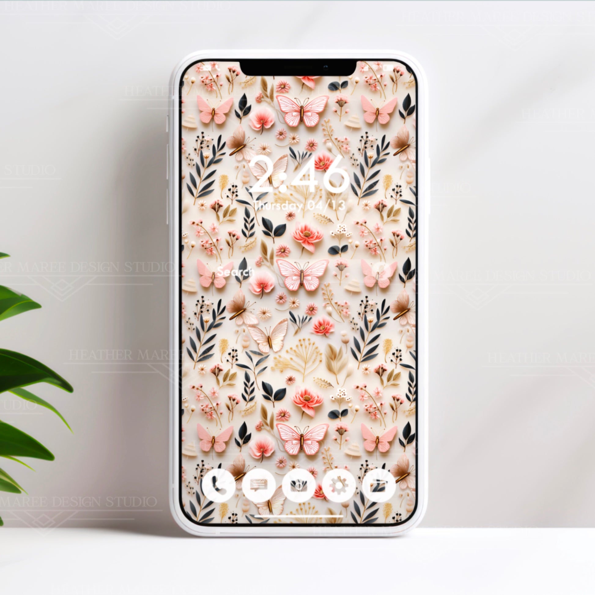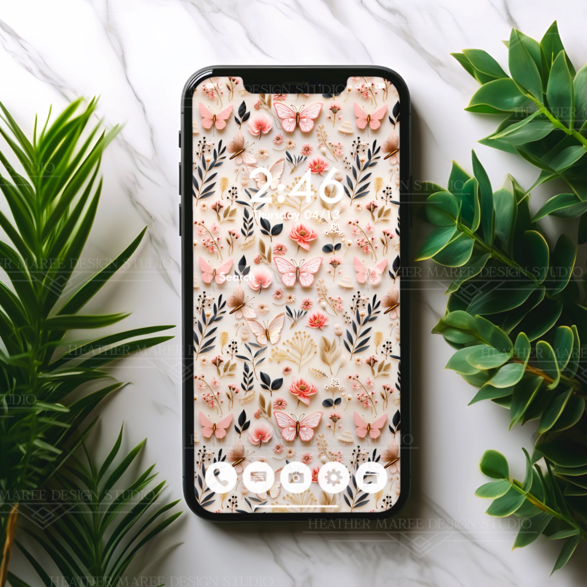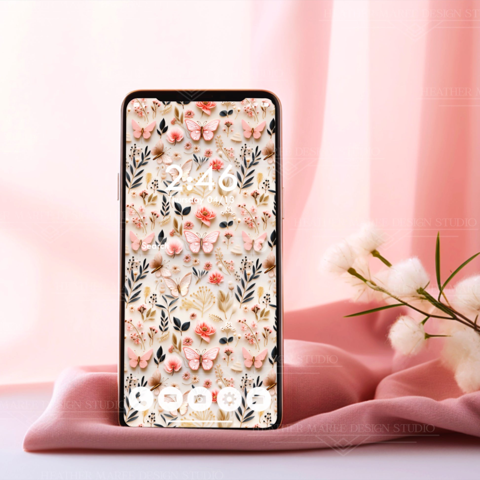 Revitalize your digital experience with our captivating original phone background featuring an original 3D design. Adorn your screen with the intricate charm of delicate white butterflies, featuring intricate pink veins, vibrant pink flowers, dainty white blossoms, verdant green leaves, and golden botanical elements—all against an elegant ivory background. This unique digital artwork brings a touch of nature's beauty to your device, creating a harmonious blend of sophistication and creativity. Instantly transform your phone's aesthetic with this enchanting download, adding a dash of elegance to your digital style.