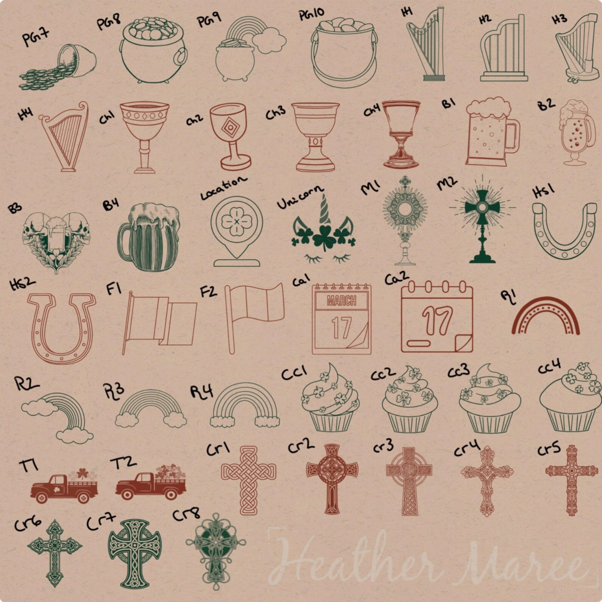 Indulge in endless creative possibilities with our extensive Procreate brush pack, boasting 143 carefully crafted stamp brushes inspired by Saint Patrick's Day. While these brushes are designed with the holiday in mind, their versatility extends beyond, catering to a variety of themed projects. Explore 10 intricate crosses and 20 Celtic symbols that can effortlessly transition into stunning outlines for Celtic and cross tattoos. Beyond festive creations, these stamps open the door to a myriad of projects, from printable DIY endeavors like stencils to scrapbooking, digital planners, clothing designs, greeting cards, and beyond - unleash your imagination with every stroke.