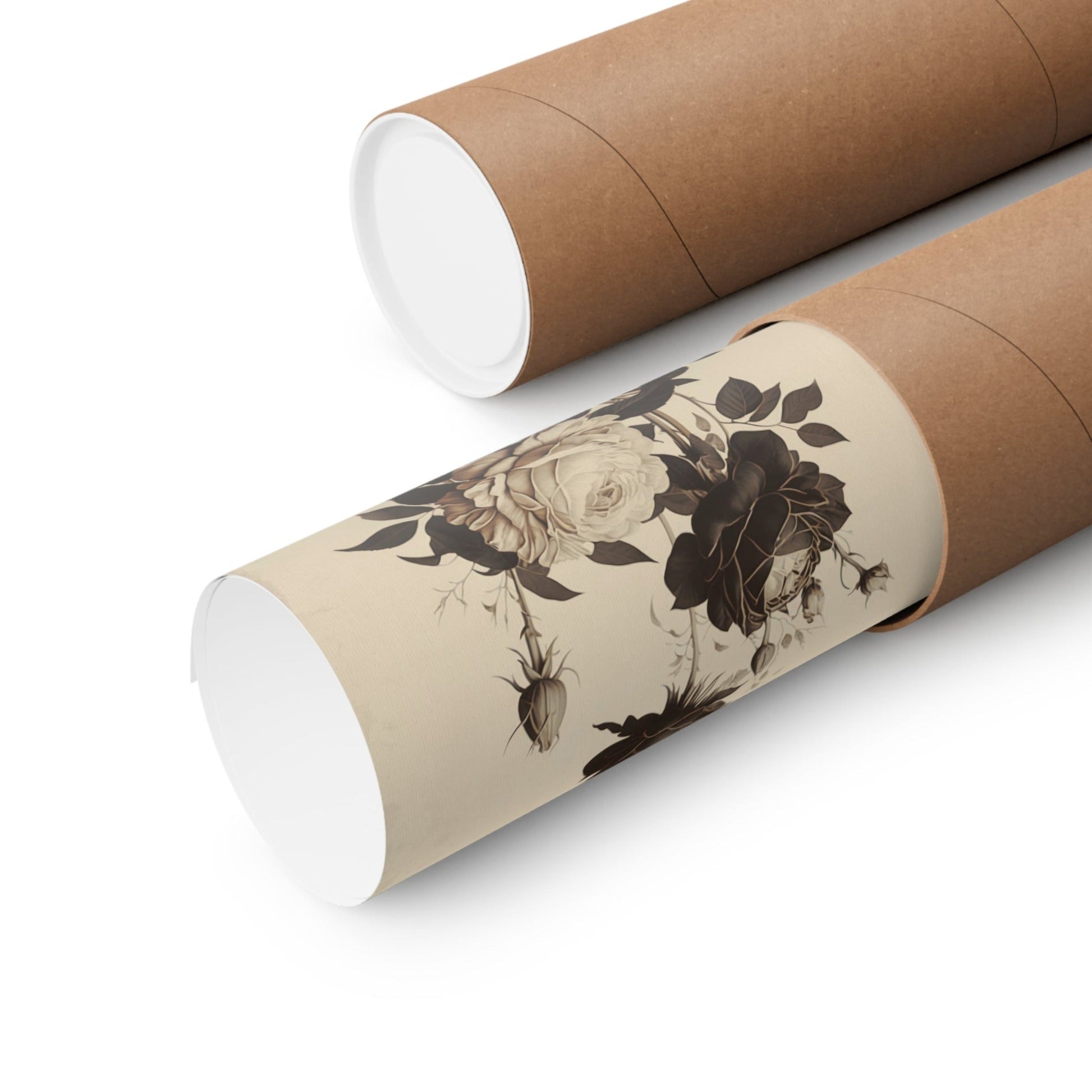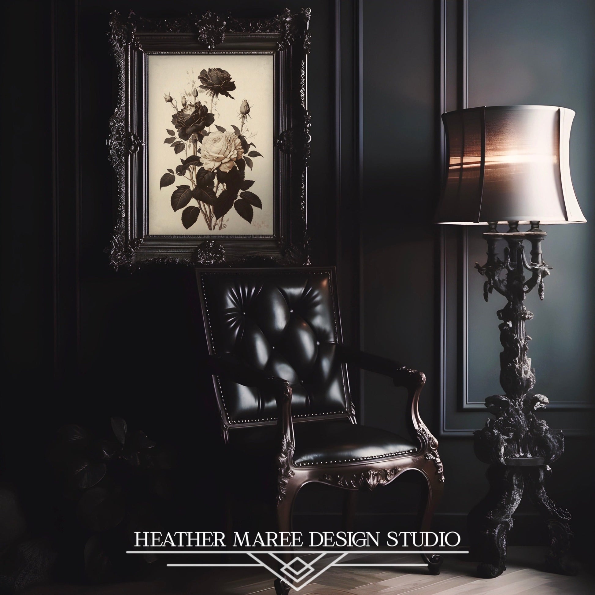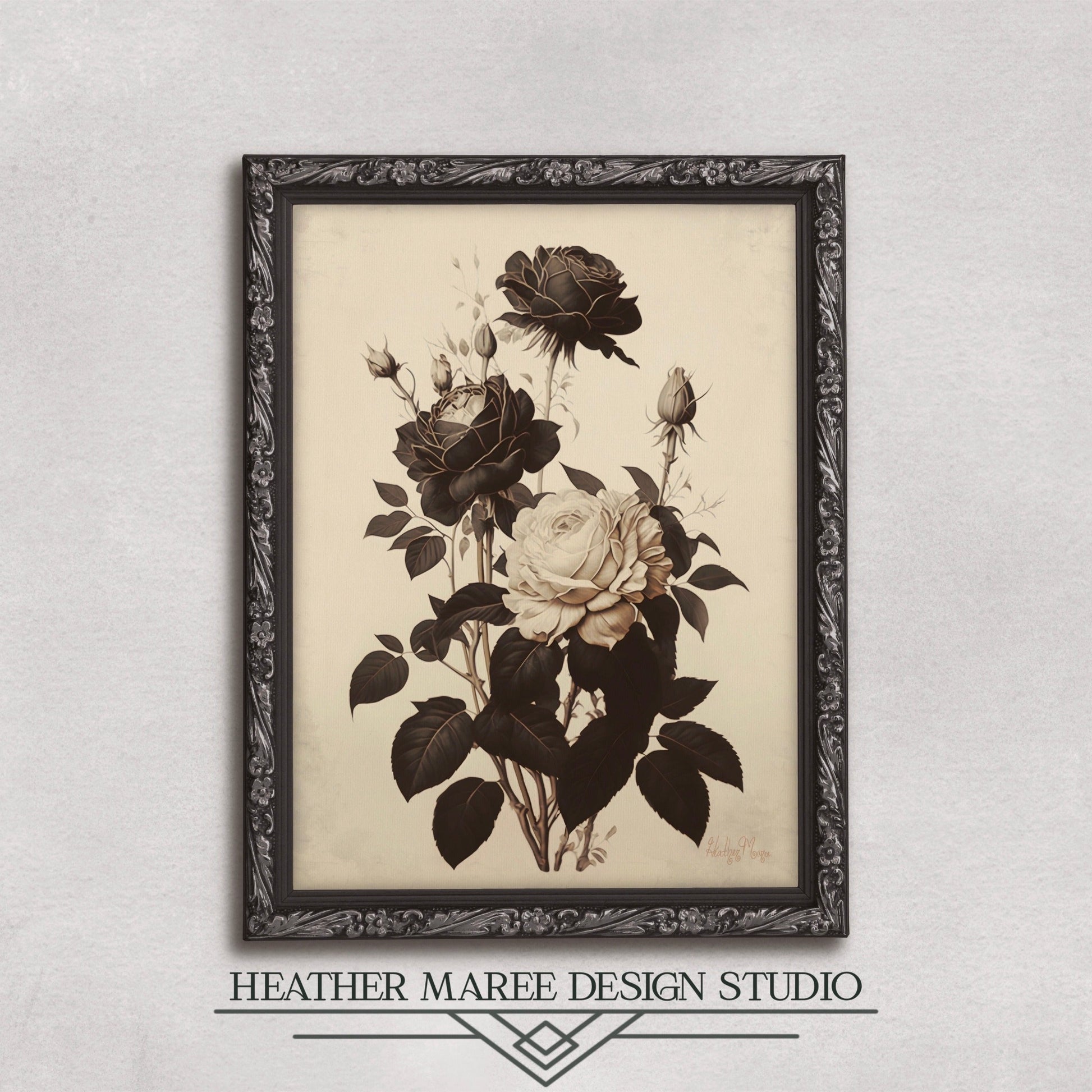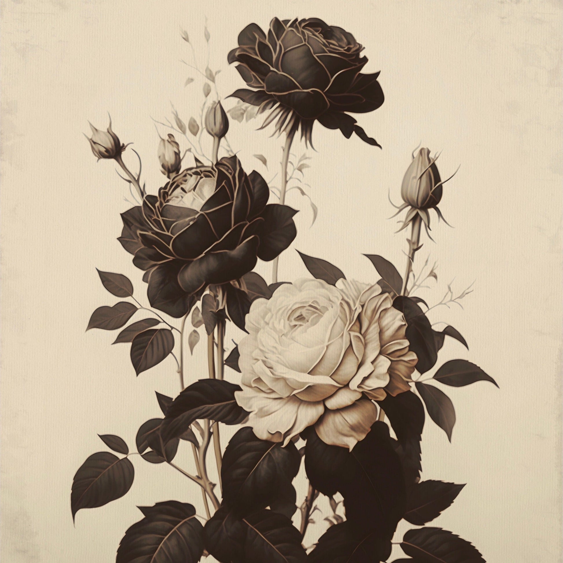 This moody and captivating digital illustration featuring a striking ivory rose accompanied by delicate black blooms and dark foliage, all set against an antique white backdrop, will be a elegant addition to your home. This artwork embodies the beauty of contrasts and is poised to seamlessly complement a range of home décor styles.