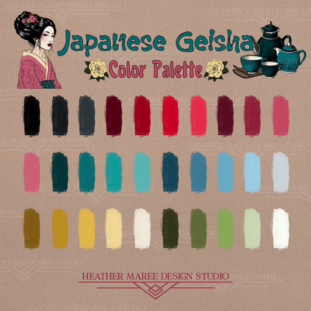 Step into the captivating world of Japanese elegance with this Procreate Color Palette inspired by geisha aesthetics. The palette embodies the essence of traditional beauty and grace, featuring a harmonious blend of blacks, fiery reds, soft pinks, tranquil turquoise, deep blues, sunny yellows, and lush greens. Seamlessly integrated into the Procreate swatch file are 30 carefully curated colors that effortlessly enhance your digital artistry—a user-friendly palette ready for upload into your Procreate app. Explore the richness of this palette and elevate your creations with the vibrant hues meticulously crafted to bring the elegance and allure of Japanese geisha culture to life on your digital canvas 💕
