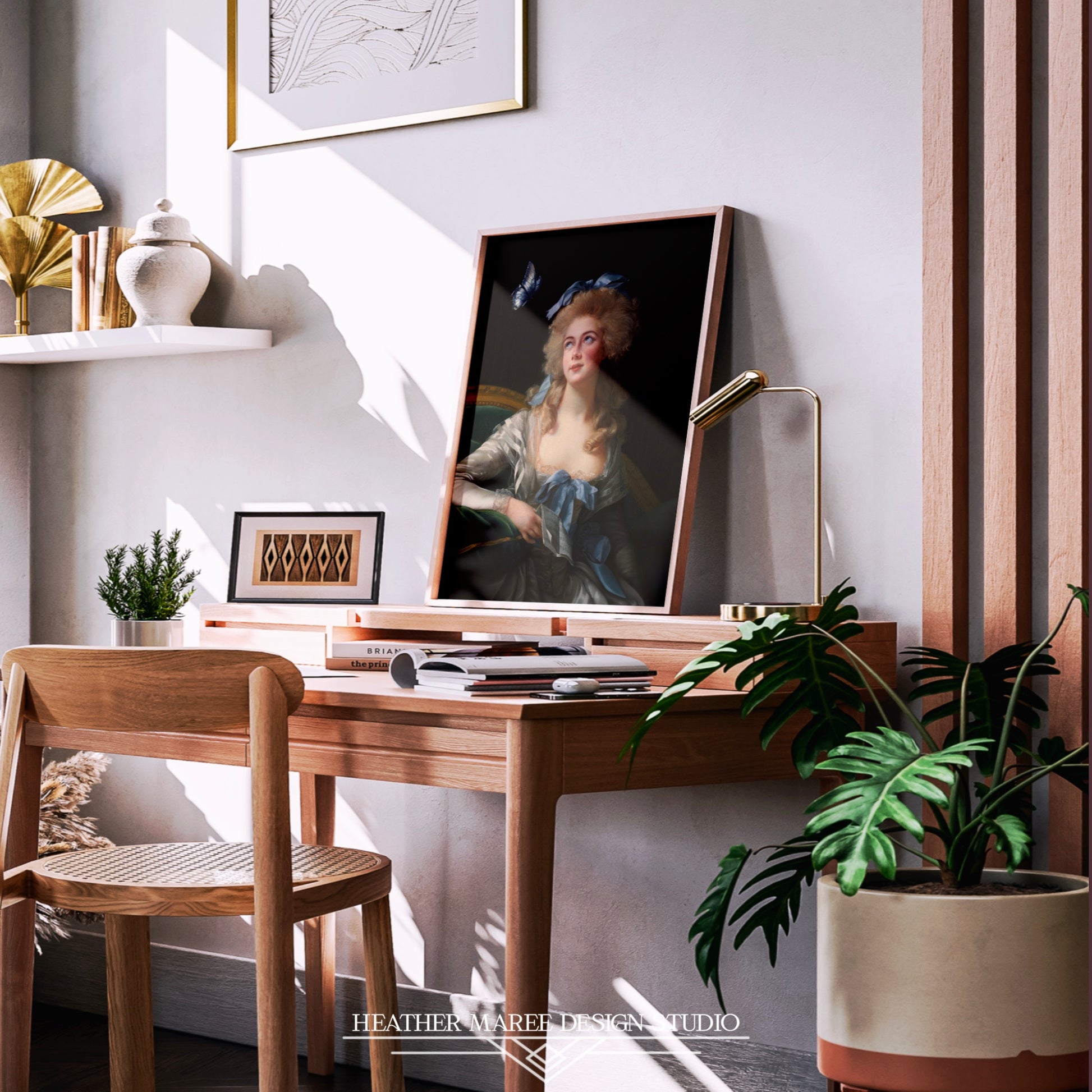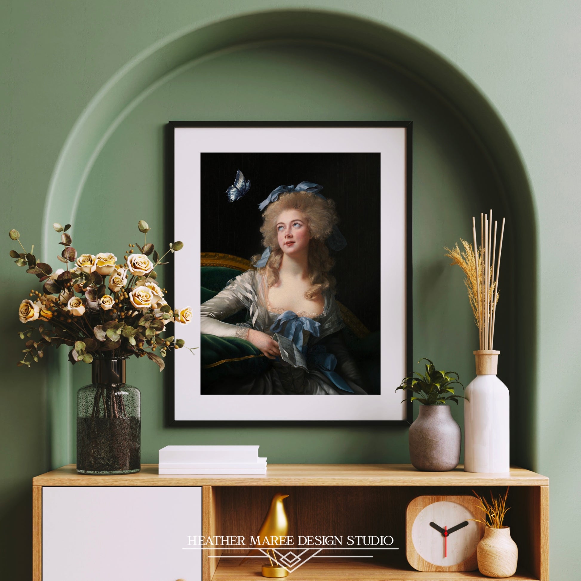With its striking presence and stunning subject, this exclusive artwork seamlessly complements various interior design styles. The feminine aesthetic and timeless ambiance this artwork radiates, make this piece an essential addition to homes that embrace grandmillennial-inspired decor, Victorian revival elements, and other vintage maximalism-inspired designs. Whether hung in a curated living room, tranquil bedroom, or a thoughtfully arranged study, this piece brings an air of refinement with a delightful hint of whimsy, making it an ideal addition to your home.