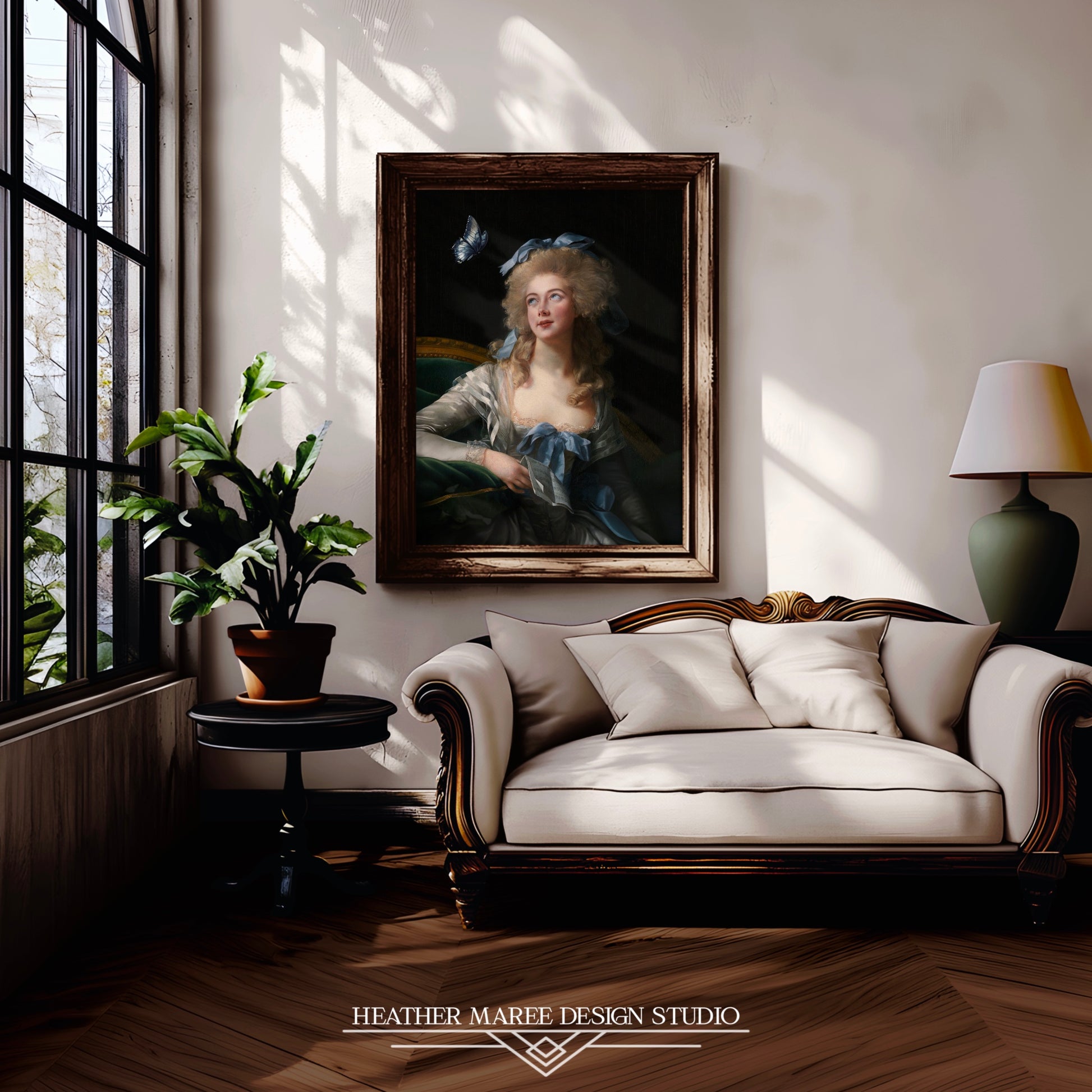 This expertly retouched and transformed art print reproduction features a poised young woman clad in a delicate, flowing gown embellished with blue ribbons. Her captivating gaze is fixed upon a blue butterfly, introducing a distinctive element to this timeless portrait. The presence of the butterfly imparts a whimsical quality to the piece, rendering it both enchanting and mesmerizing.