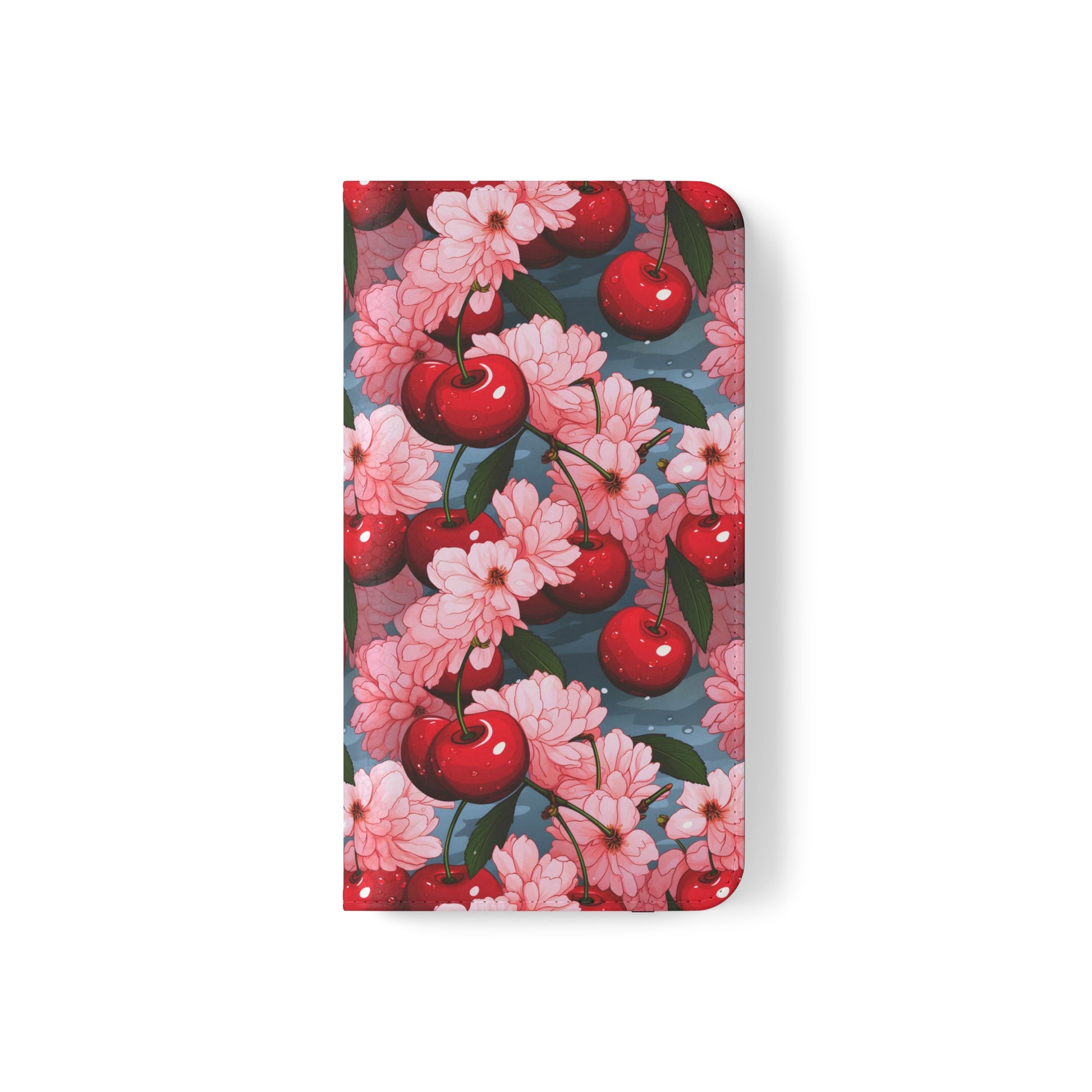 This original faux leather flip phone case design features luscious maraschino cherries, their rich red hue beautifully complemented by dainty green stems, set against a soft blue backdrop. Playful pink cherry blossoms dance amidst the cherries, creating an artistic fusion of fashion and functionality.
