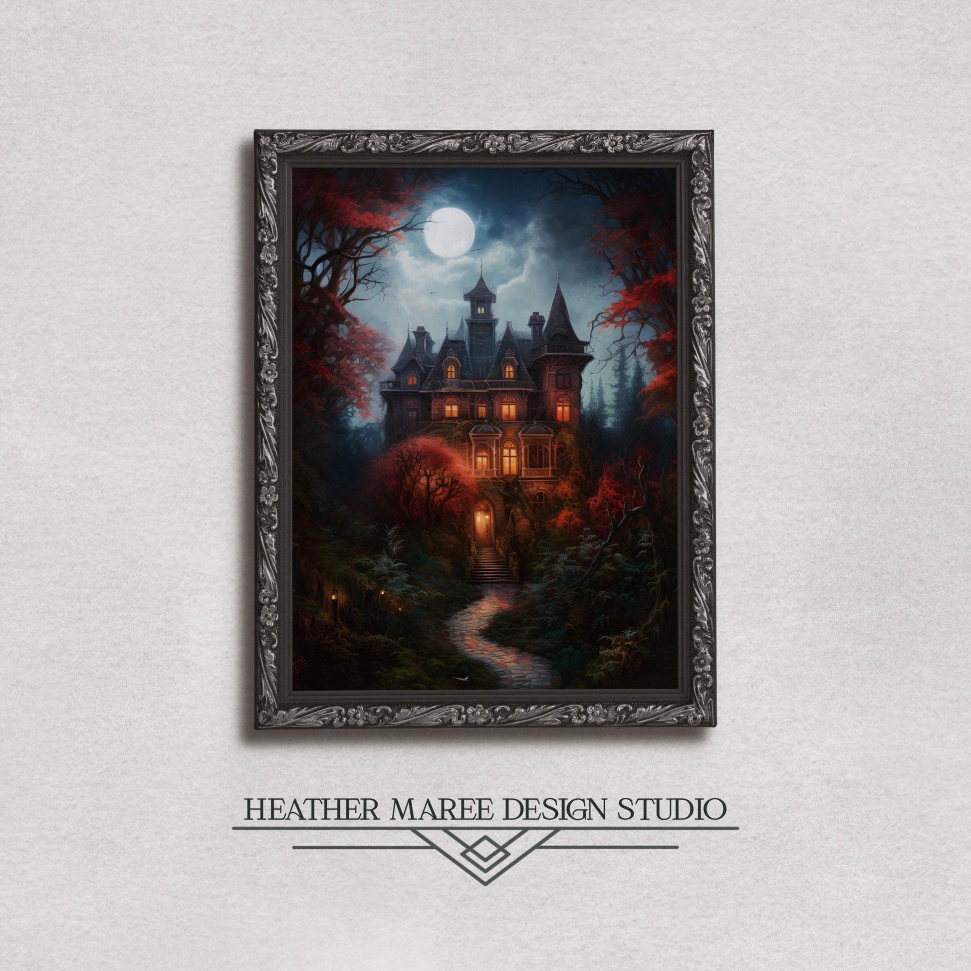 A spooky digital impressionist painting of a large gothic mansion lighting a nighttime forest with an ominous red-orange glow. This original digital art print will steal you away into a bewitching otherworldly forest, where a moody Victorian mansion stands under the spell of a full moon's radiant glow 🏰🌙