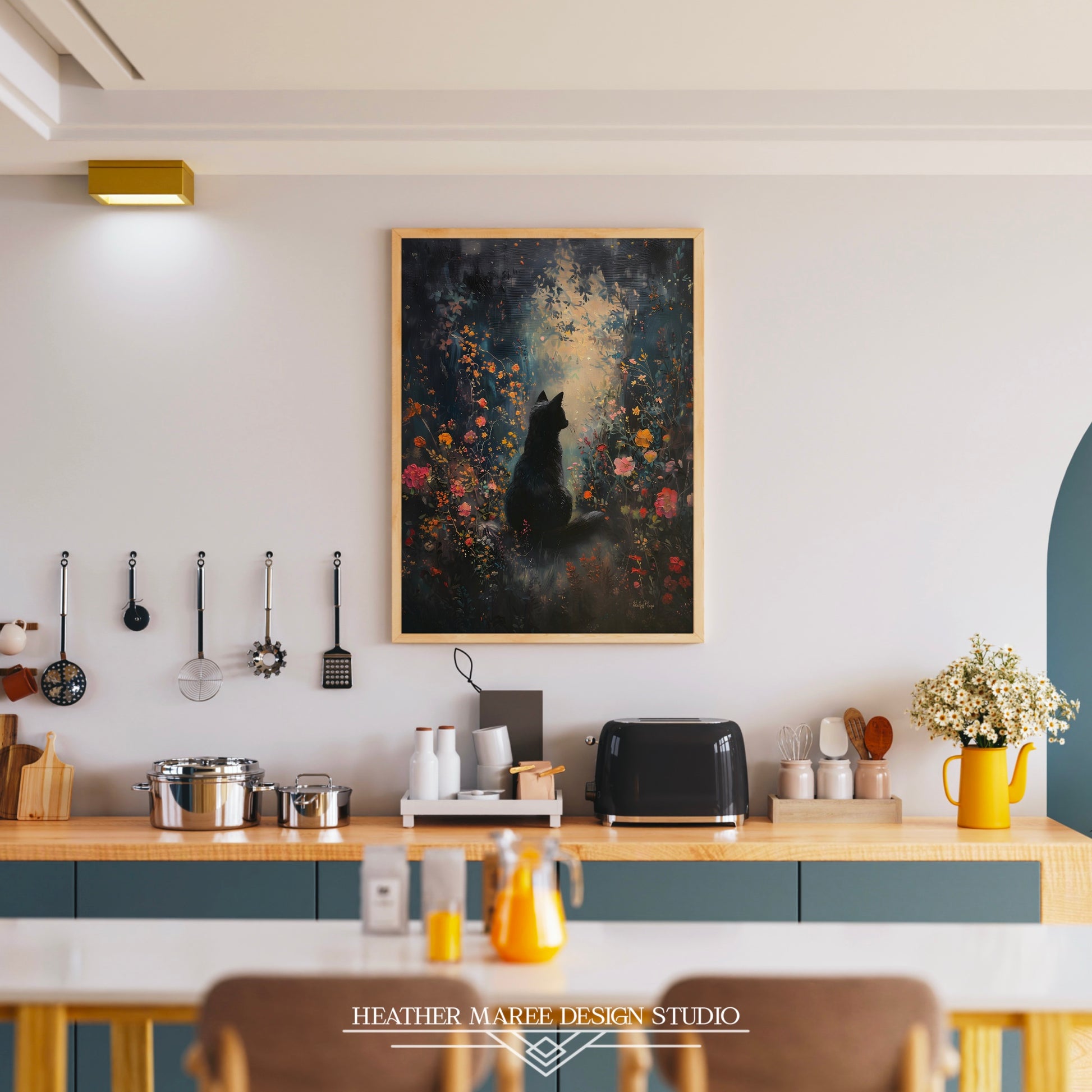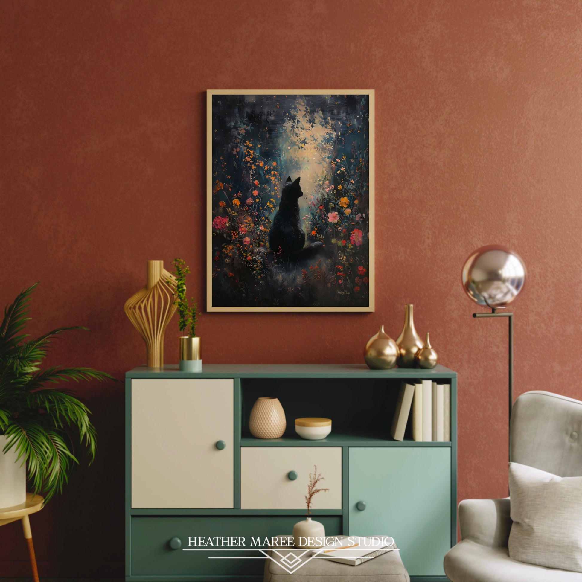 Explore the enchanting realm of original artwork with this captivating fine art print, where each stroke of the brush unveils a world of whimsy and charm. Drenched in a vibrant palette of greens, oranges, pinks, blues, and yellows, this semi-abstract masterpiece draws inspiration from folk art, casting a spell of timeless allure. Imagine a tranquil scene where a little black cat presides over a blooming meadow, exuding a moody folk-art aesthetic that adds depth and character to any space.
