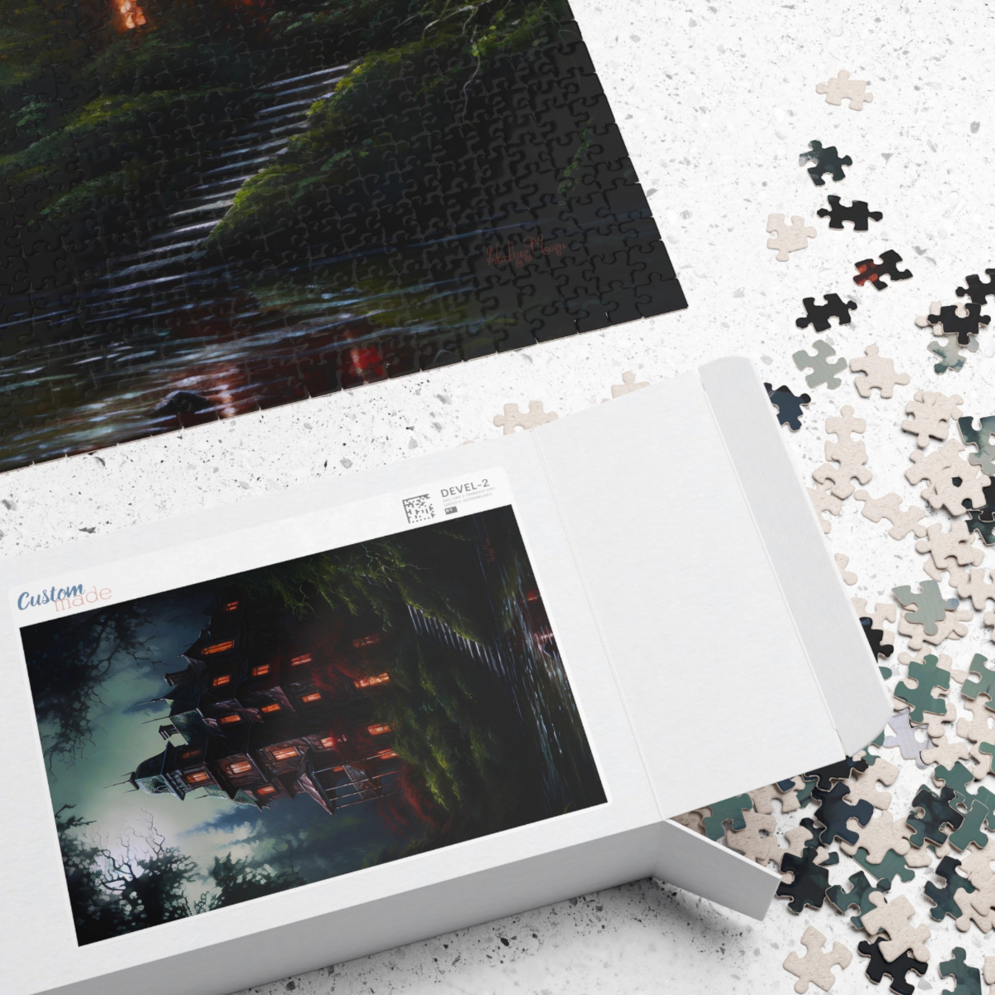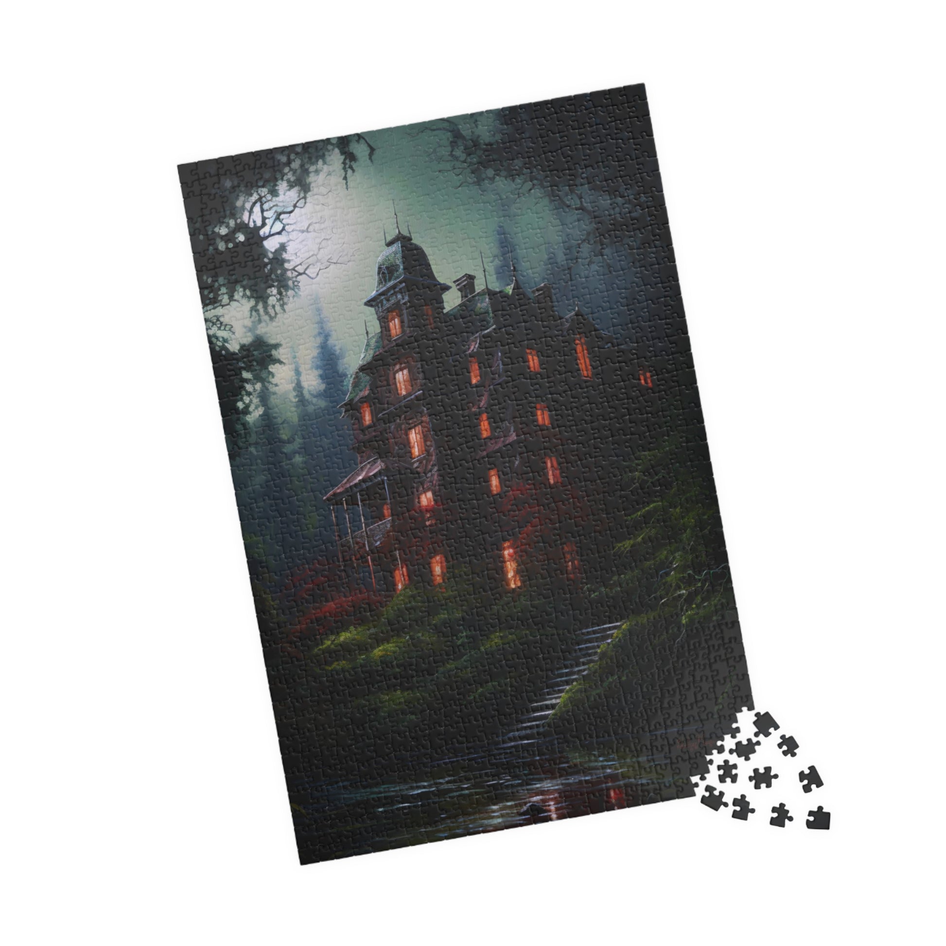 A moody digital impressionist painting of a large ominous gothic mansion, set against a dusk skyline and gloomy forest. This original artwork will bring you on a journey where the ethereal allure of a grand mansion intertwines with the enigmatic embrace of a moonlit forest. This puzzle would be an excellent gift for someone who loves moody architecture artwork and Victorian style homes. Once the puzzle is completed it can be turned into a beautiful wall hanging.
