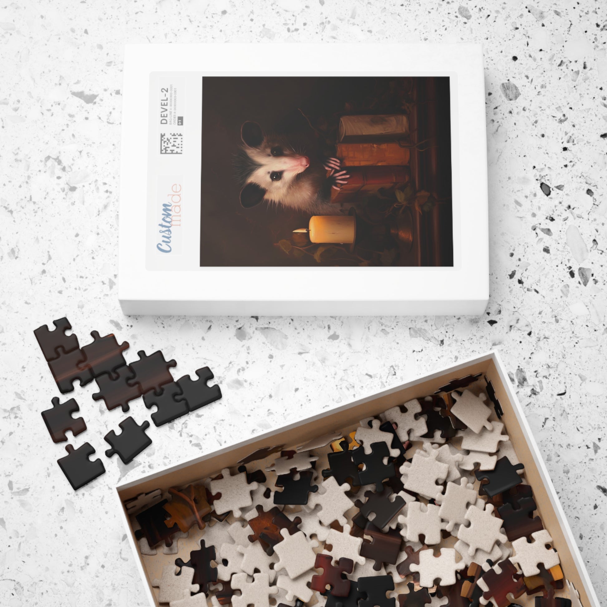 This inviting original digital painting unveils an inquisitive opossum, perched behind a trio of antique books resting on a rustic wooden table. Illuminated by the gentle flicker of a solitary candle, the scene exudes an aura of contemplation and wonder. Against a backdrop of simple olive green, this artwork captures not only the charm of the marsupial but also invites you to delve into a realm of intellectual exploration, where the timeless allure of books and the tranquil spirit of opossums harmonize perfectly. This puzzle would be an excellent gift for someone who loves moody books a cute opossums. Once the puzzle is completed it can be turned into a beautiful wall hanging 🖼️💖