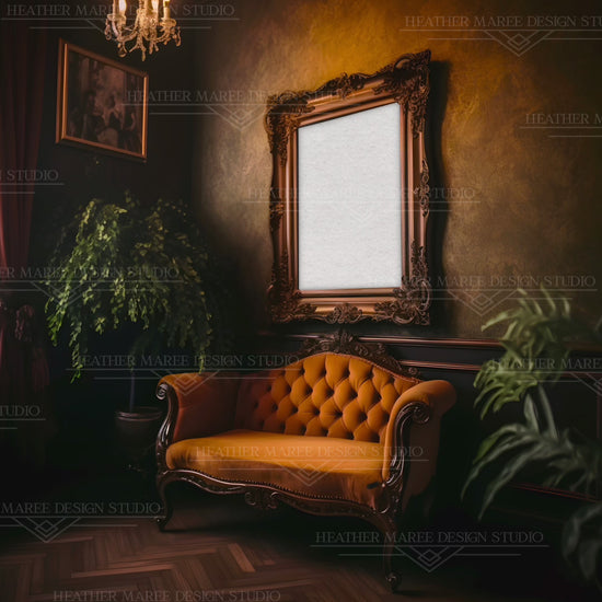 A sophisticated mockup featuring a vintage-inspired ornate picture frame and a luxurious orange chair, meticulously crafted for a moody ambiance. All mockups adhere to a 1x1 aspect ratio.