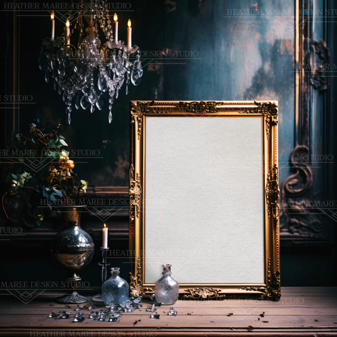 Elevate your creative vision with our enchanting mockup, featuring a soft gold picture frame resting gracefully on a rustic wood table. The room exudes the charm of French country aesthetics, with blue-painted walls creating a serene backdrop. A crystal chandelier casts a warm glow in the background, adding a touch of elegance. On the table, curated decorative items, including a blue vase with delicate flowers, a flickering candle, and small decorative vases, complete the scene. Thoughtfully designed with thorough attention to detail, our mockups proudly present a functional 1x1 aspect ratio, seamlessly merging with your artistic projects. Permeated with creative expertise, these designs guarantee an authentic, professional, and polished presentation every time, inviting you to elevate your creative vision with sophistication and style.Â