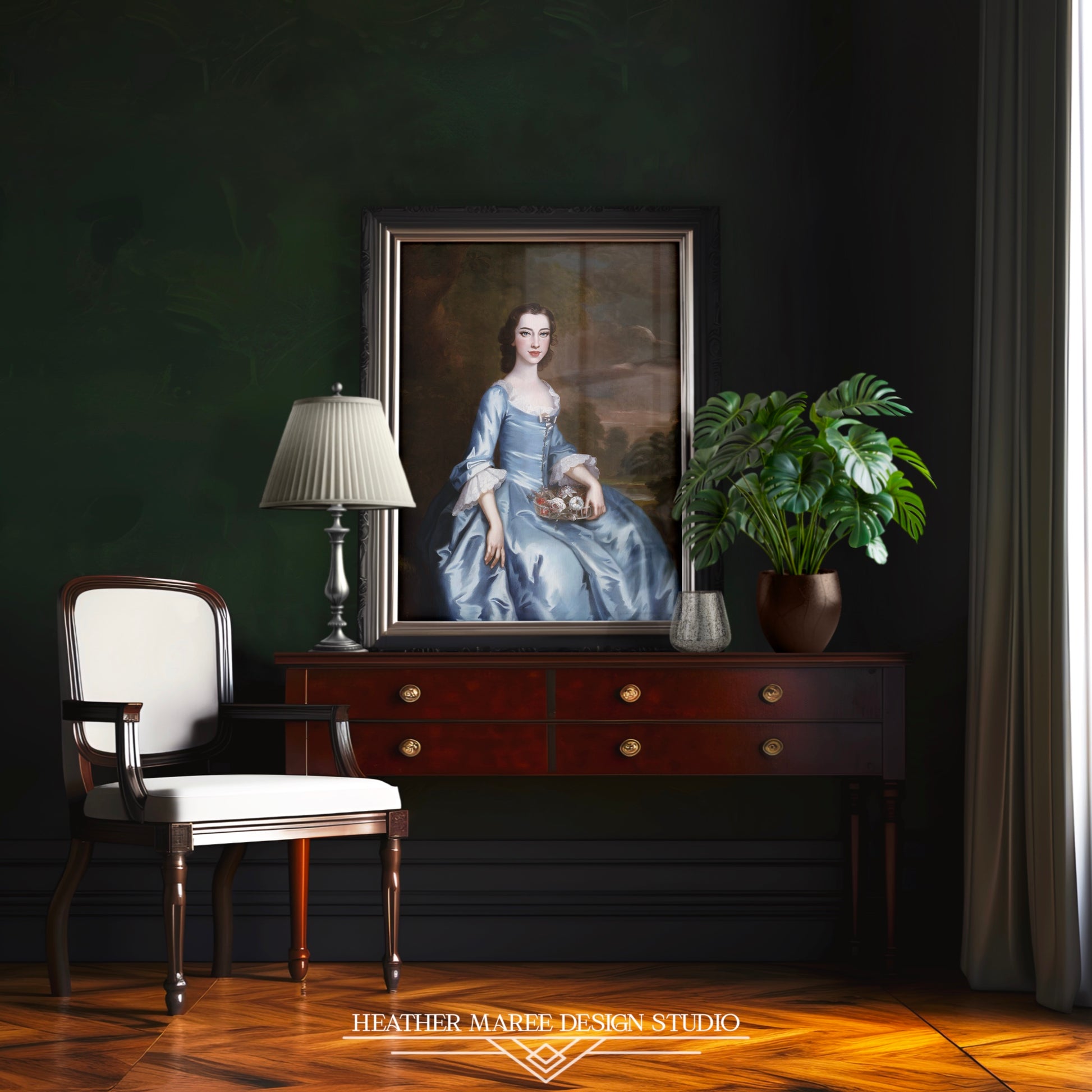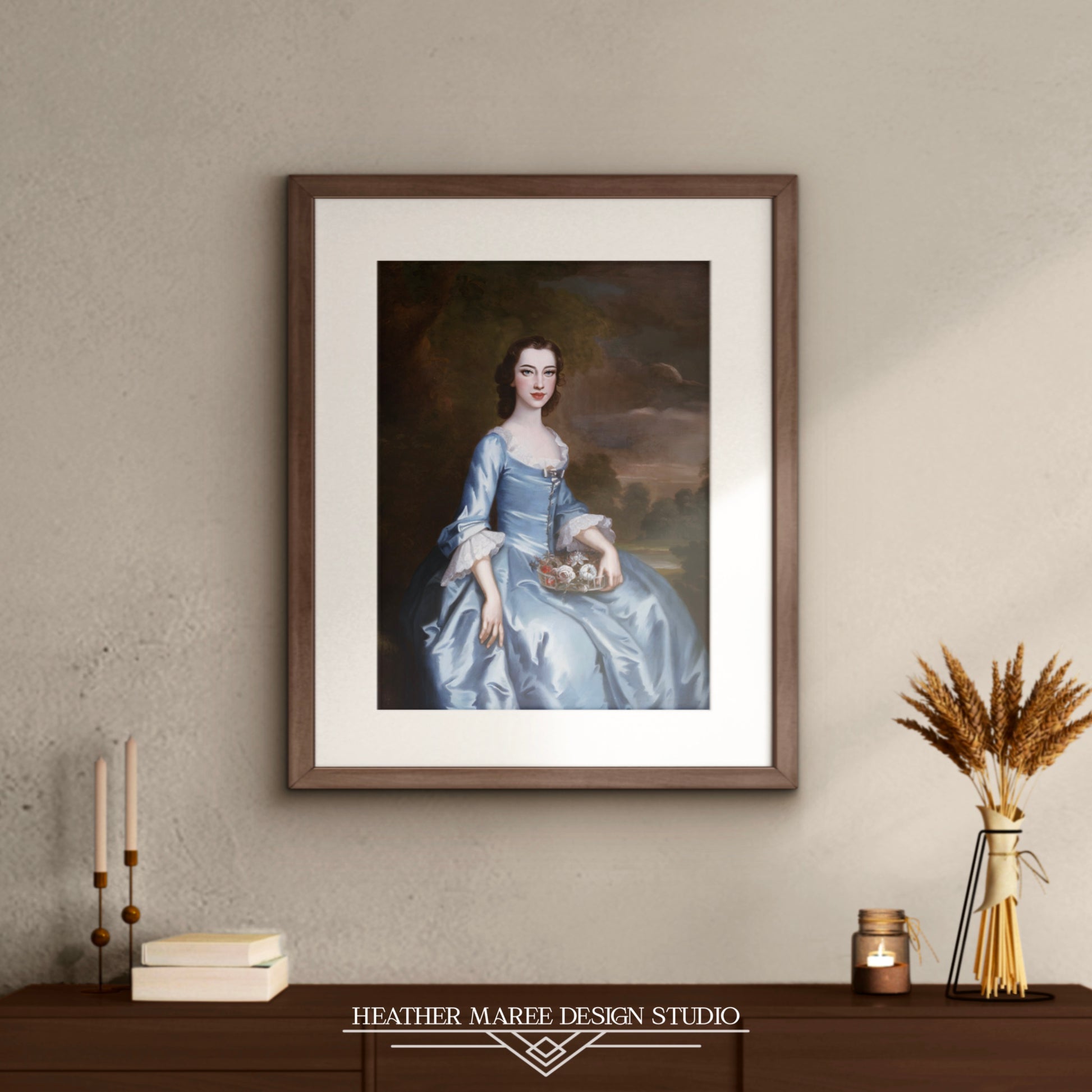Step into the timeless elegance of John Wollaston's 1750 original painting, where an American woman adorned in a graceful blue dress delicately holds a small tray of flowers. This digitally altered artwork seamlessly blends history with a contemporary twist, capturing the essence of a bygone era while adding a touch of modern allure. The subtle transformation enhances the delicate features of the subject, creating a piece that transcends time and sparks the imagination.