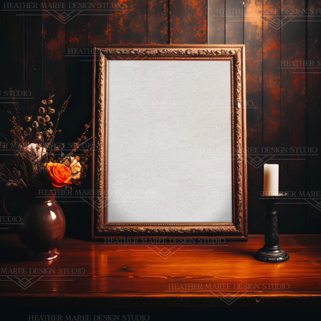 Embark on an exploration of design sophistication with this unique mockup, featuring a singular vertical bronze picture frame adorning an antique wood table within a room steeped in a moody rustic autumn aesthetic. Deliberately crafted with meticulous attention to detail, our mockups proudly unveil a functional 1x1 aspect ratio, seamlessly merging with your artistic projects. Infused with a wealth of creative expertise, these designs promise an authentic, professional, and polished presentation every time, beckoning you to elevate your creative vision with sophistication and style.
