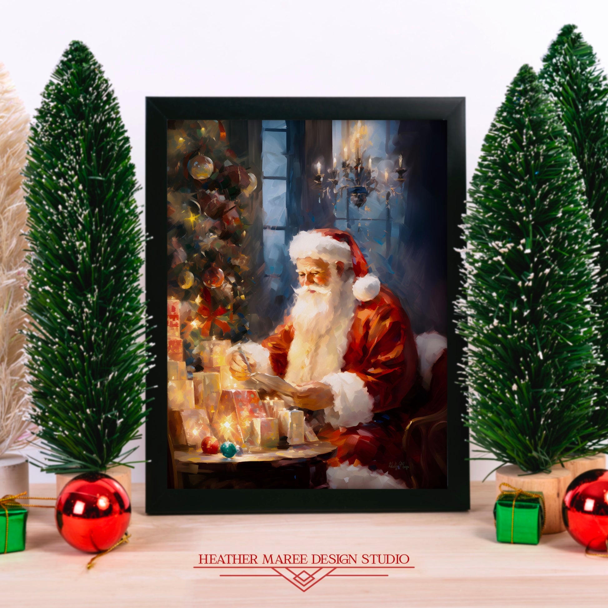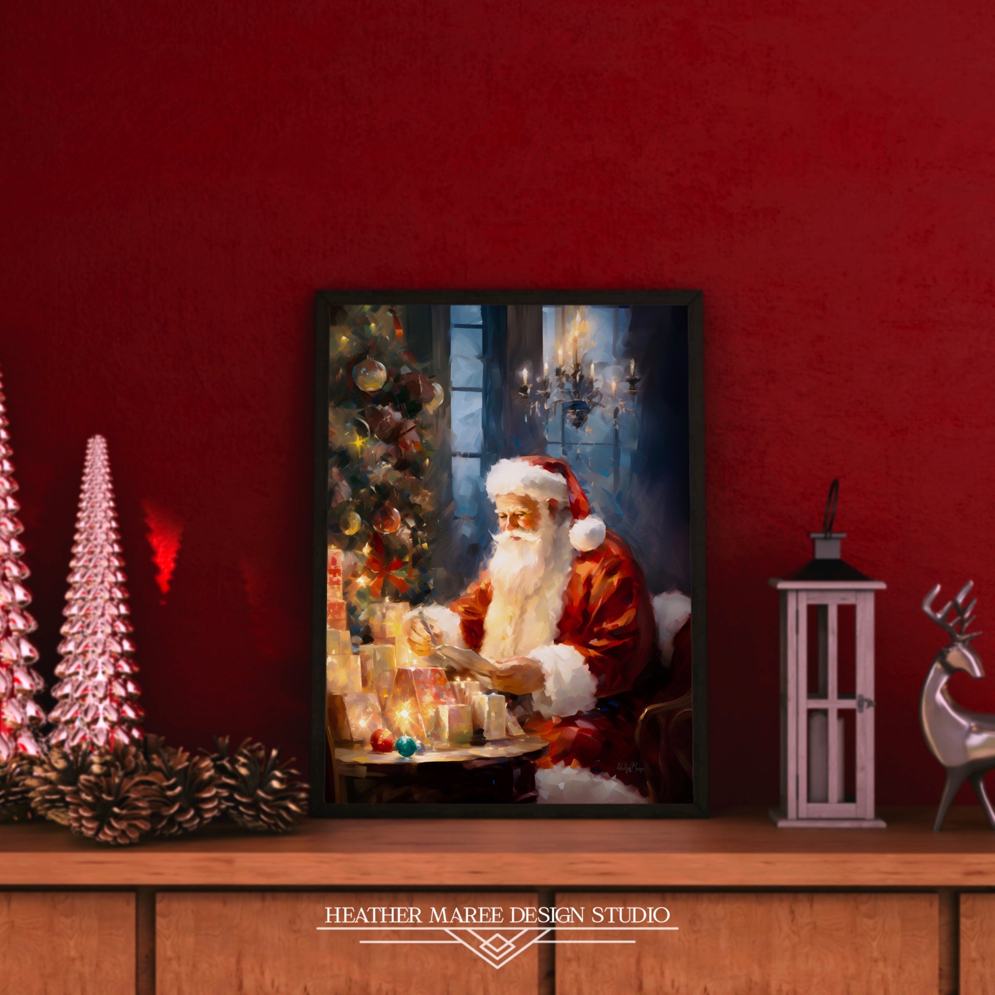 Experience the heartwarming nostalgia of the holiday season with this original this digital impressionist painting. In this artwork, Santa Claus is portrayed seated at a table adorned with glistening Christmas gifts, meticulously reviewing his list of recipients. The scene is set against a backdrop of a wintery night, complete with a beautifully decorated Christmas tree and the soft glow of a candlelit chandelier.