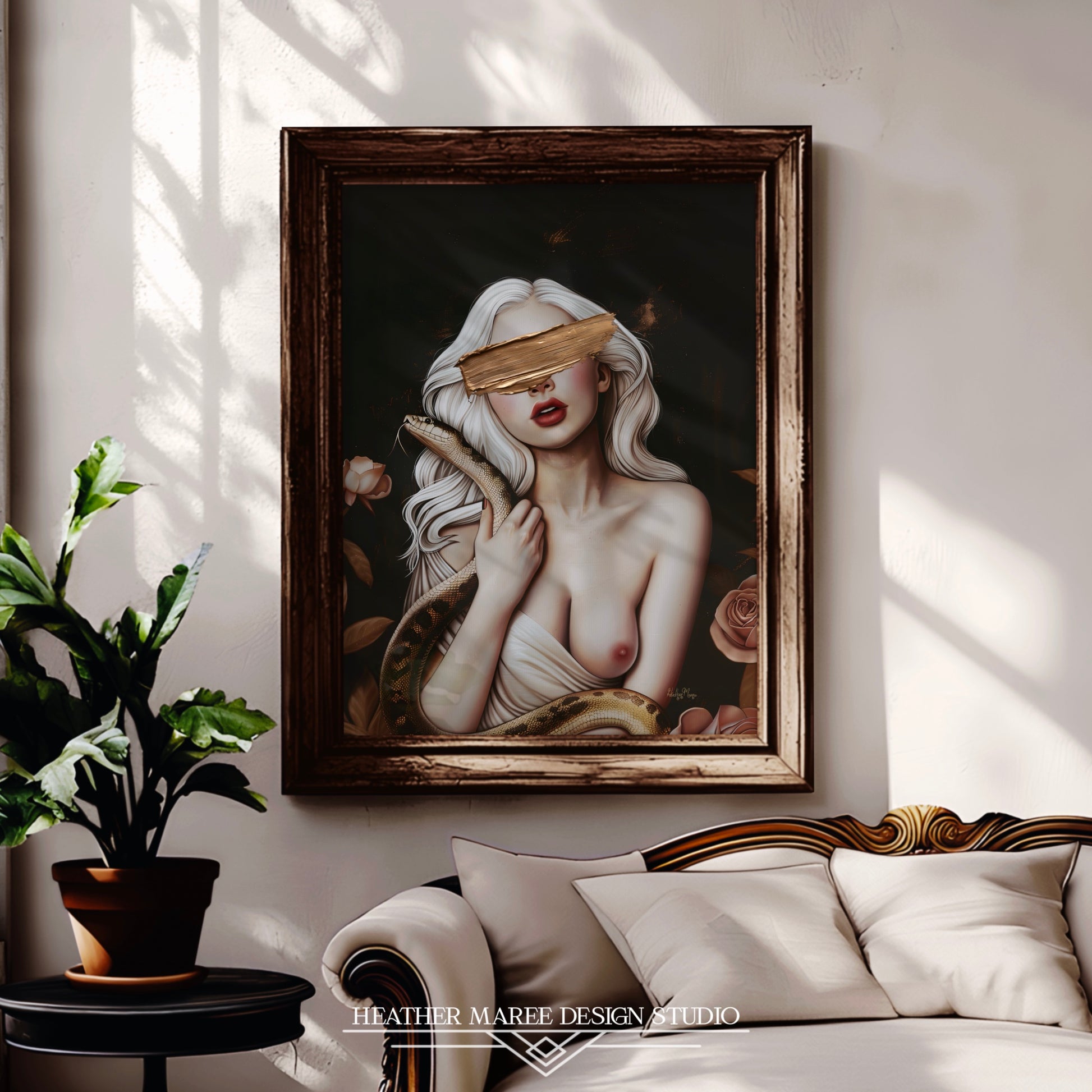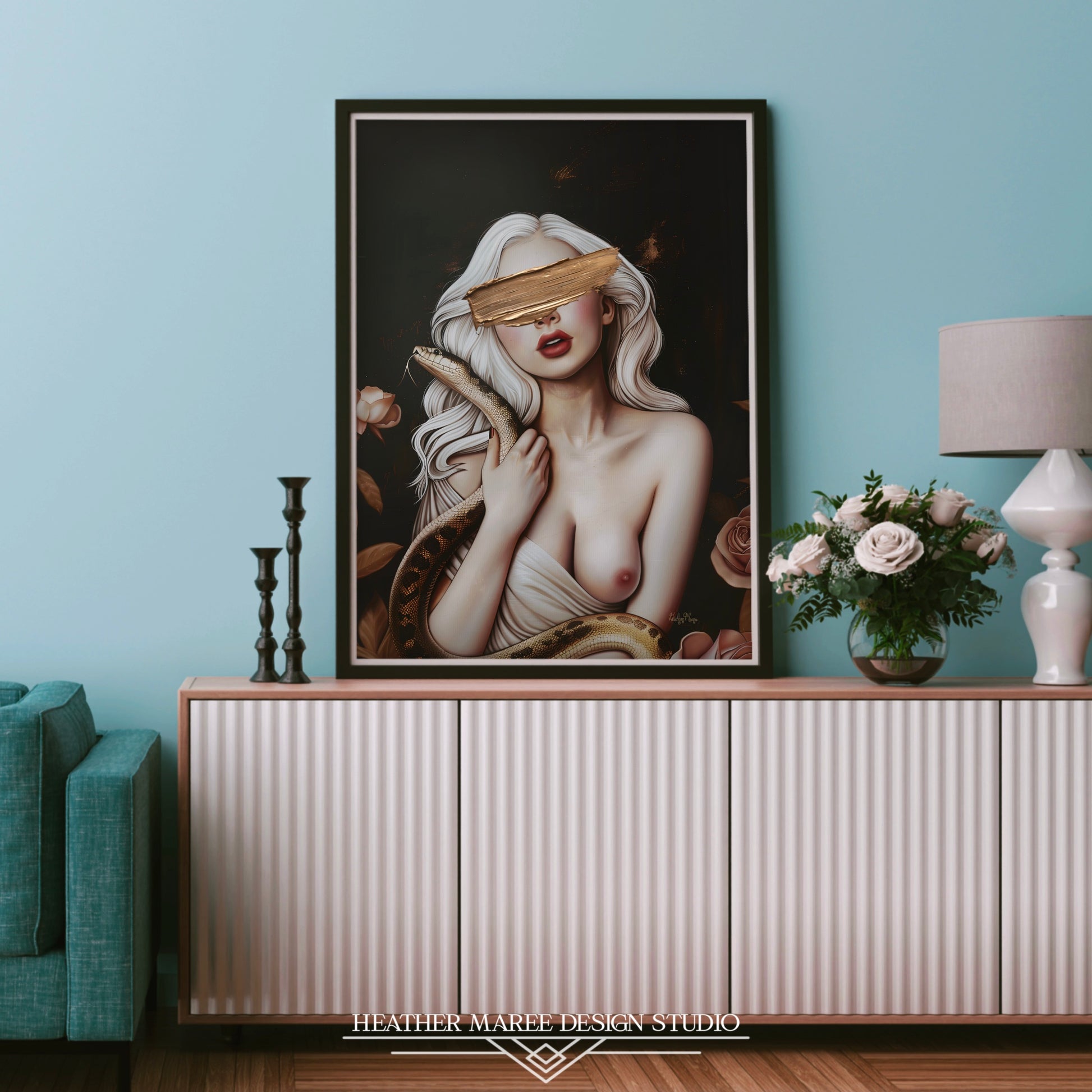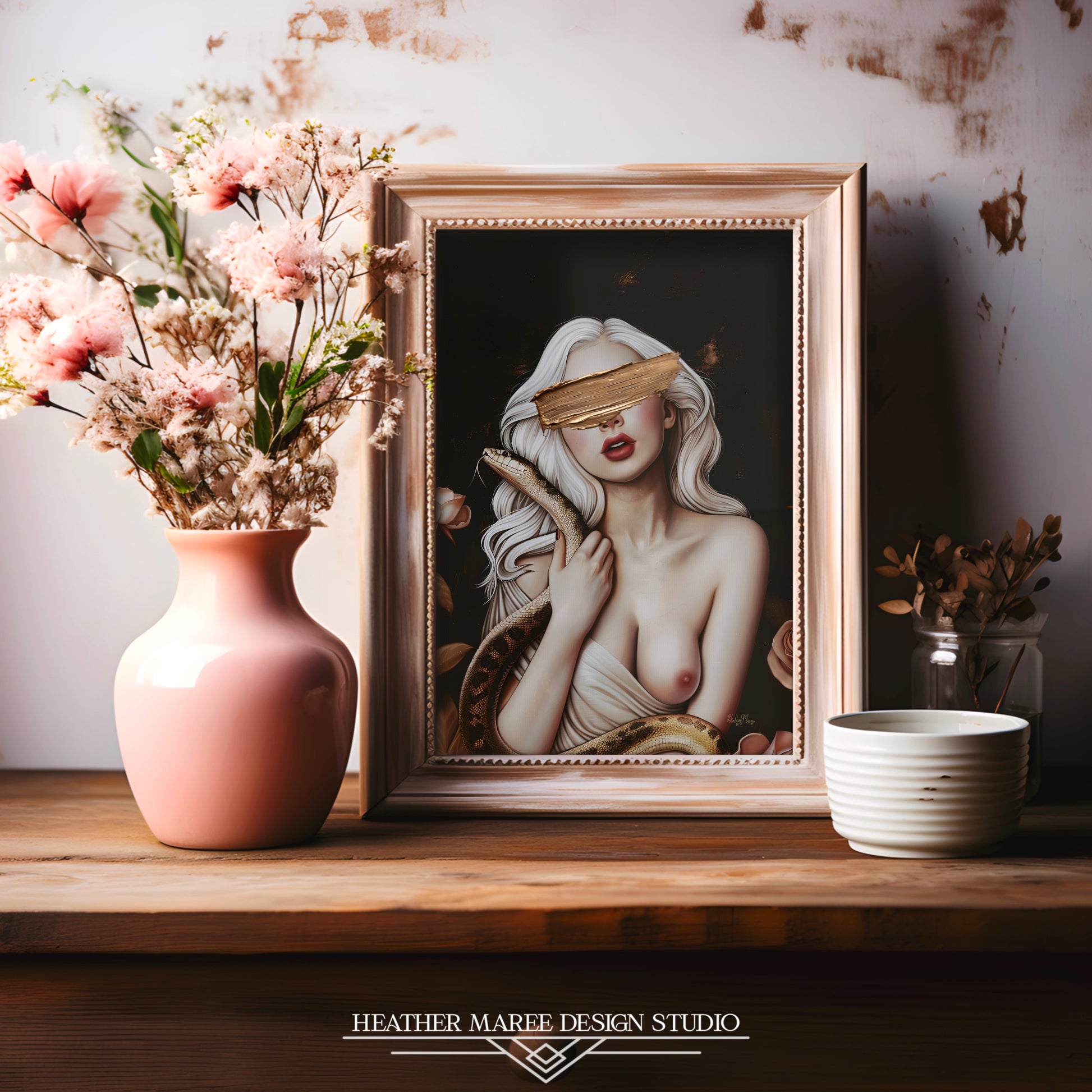This bewitching original fine art print features a striking image of a young woman with flowing white hair, her gaze both intense and captivating. She holds a serpent gracefully wrapped around her bare shoulders, its textured scales contrasting with her smooth, porcelain skin. Her rosy cheeks and bold red lips add a touch of warmth to the otherwise cool, ethereal palette. The background is a deep, dark canvas, accentuated by hints of gold and bronze, with delicate roses framing the scene.