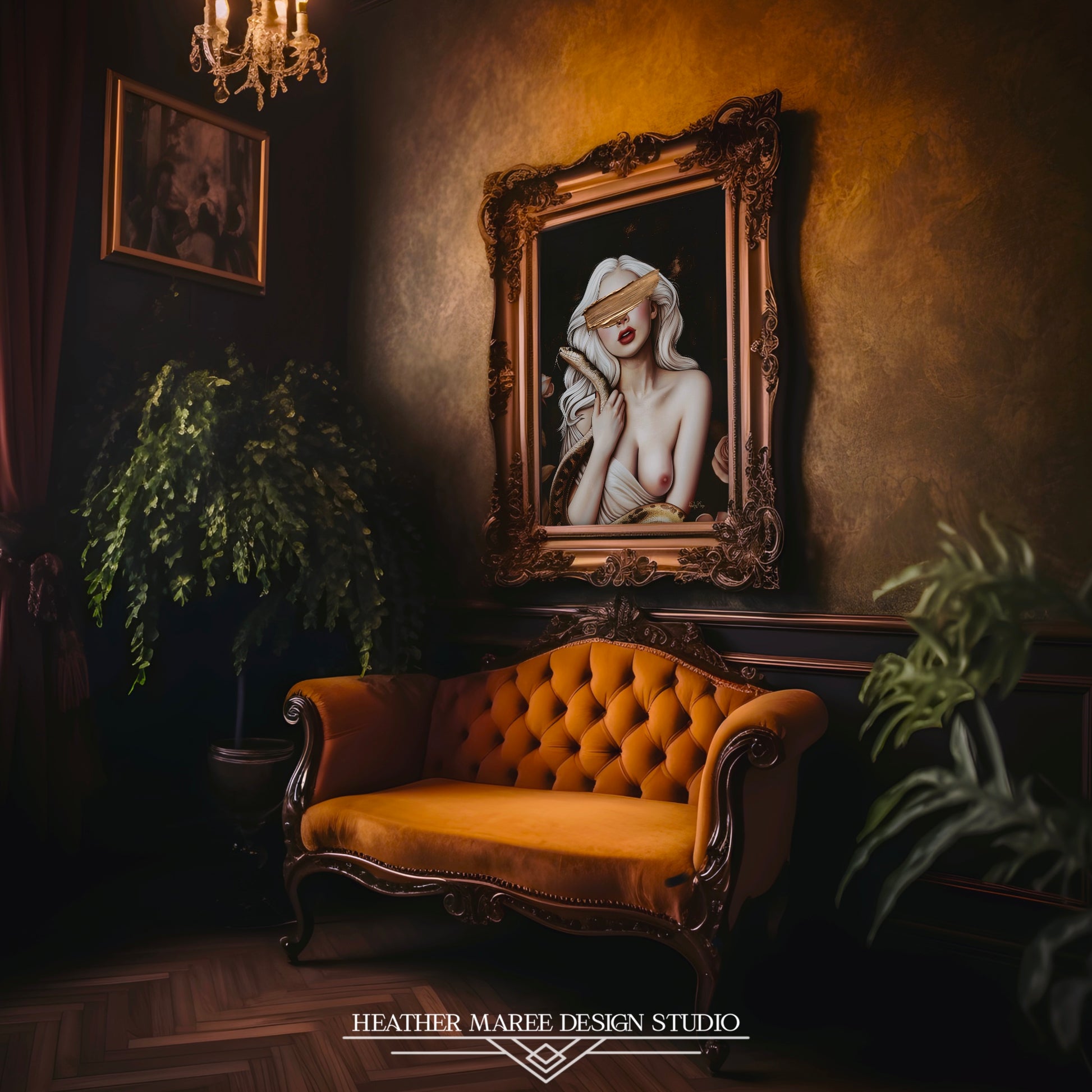 This artwork seamlessly blends elements of fantasy and realism, creating a mesmerizing and mysterious visual narrative. This stunning piece would beautifully complement various home decor styles, especially those with a penchant for rich, moody aesthetics. It is a perfect addition to dark academia interiors, where its deep tones and dramatic subject matter can enhance a sophisticated, scholarly atmosphere. In a dark bohemian setting, the artwork's mix of natural and fantastical elements can add a layer of intrigue and mystique. It also pairs wonderfully with gothic decor, adding an elegant yet haunting focal point. For those who appreciate vintage glamour with a modern twist, this print offers a timeless allure that fits seamlessly into eclectic and maximalist spaces.