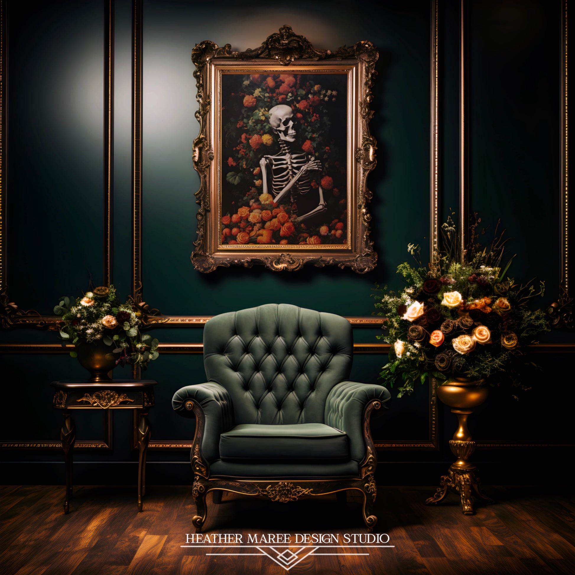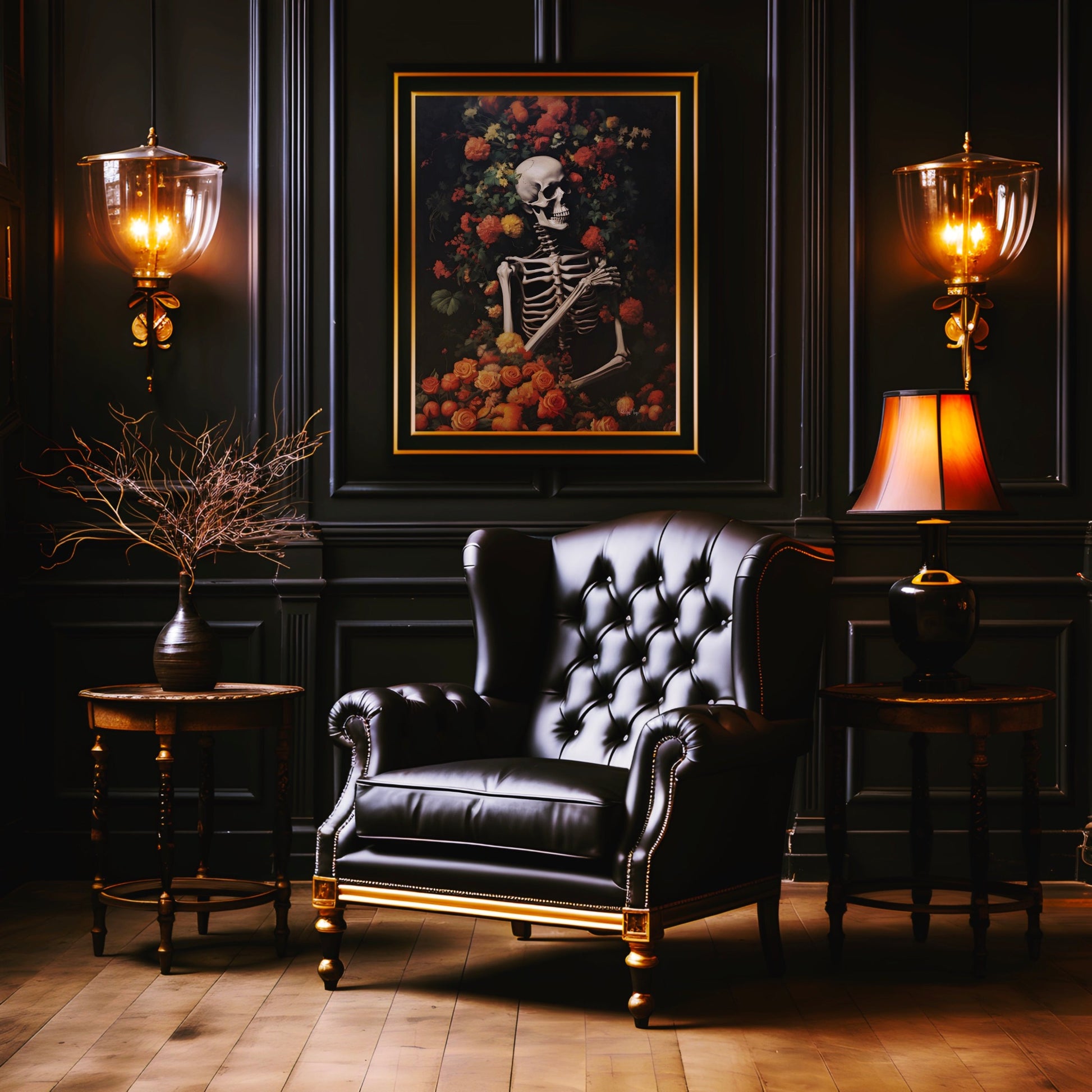 Channel the dark allure of gothic home décor and witchy inspired home décor, as the skeletal figure emerges from the shadows, intertwining with the rich symbolism of orange blossoms and verdant leaves. This artwork would be a captivating addition to your space during Halloween and spooky season, transforming it into an immersive atmosphere that invites curiosity and awe. The harmonious blend of elements caters to a variety of maximalist home décor aesthetics.