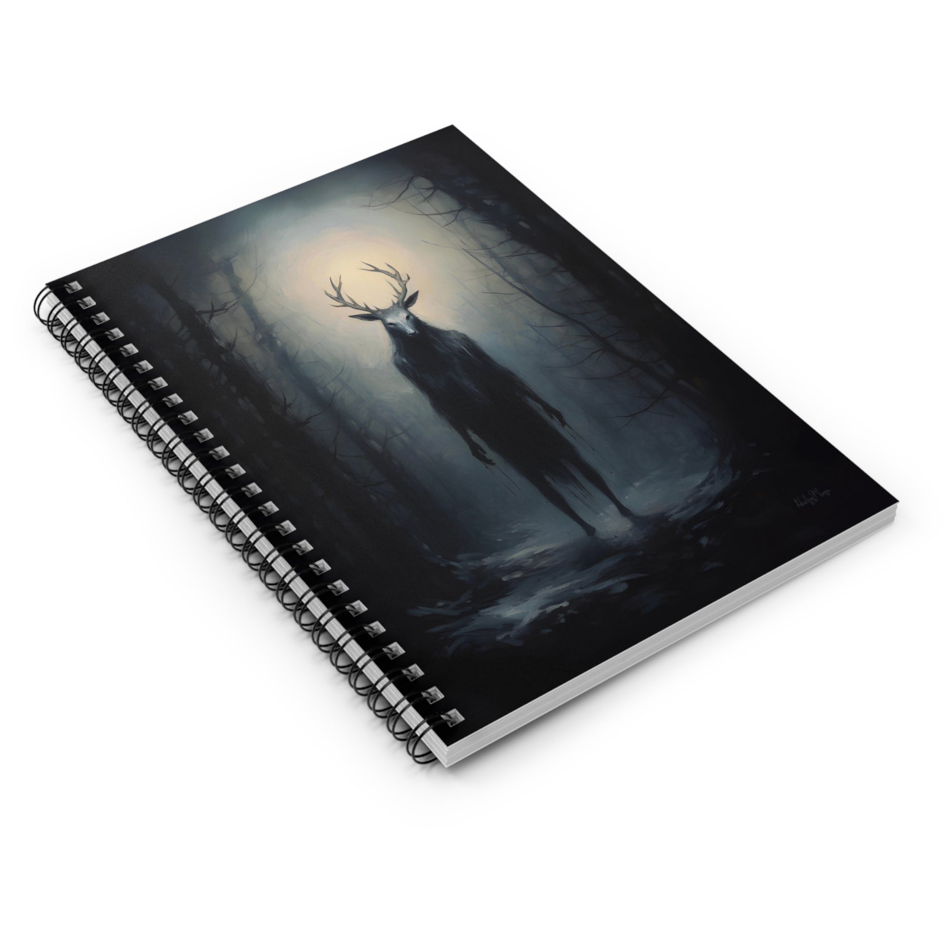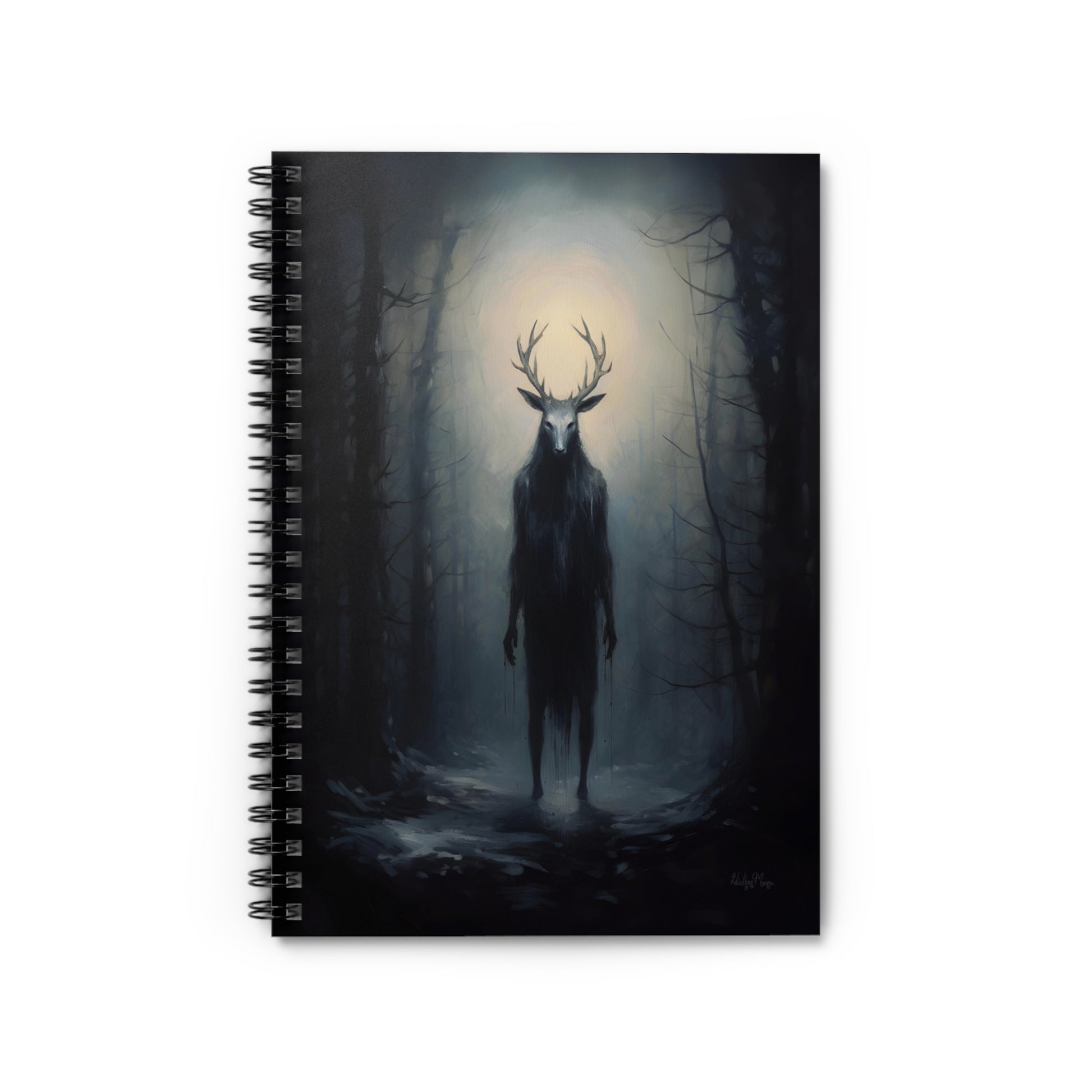 .Engage in the evocative allure of Slavic folklore with this spiral notebook, featuring a captivating original digital painting that brings to life the haunting presence of a Slavic wendigo amid a dark forest. The subtle interplay of blacks and blues establishes a wintery and eerie ambiance, inviting you into a realm of captivating mystery and enchantment. As an ideal companion for school notes, poems, shopping lists, and more, this notebook seamlessly blends practicality with artistic sophistication. Elevate your daily notetaking experience with this unique fusion of cultural richness and expressive design.