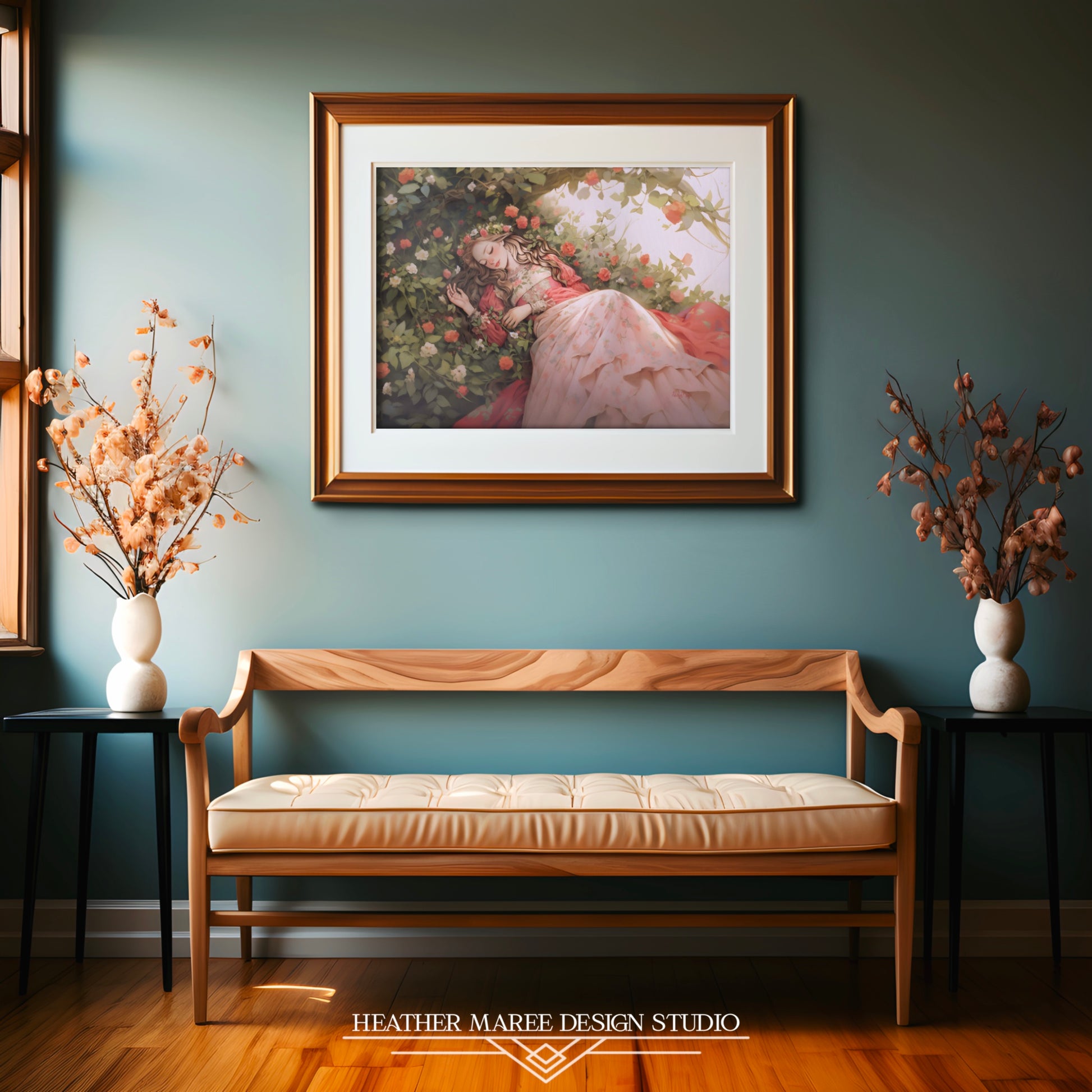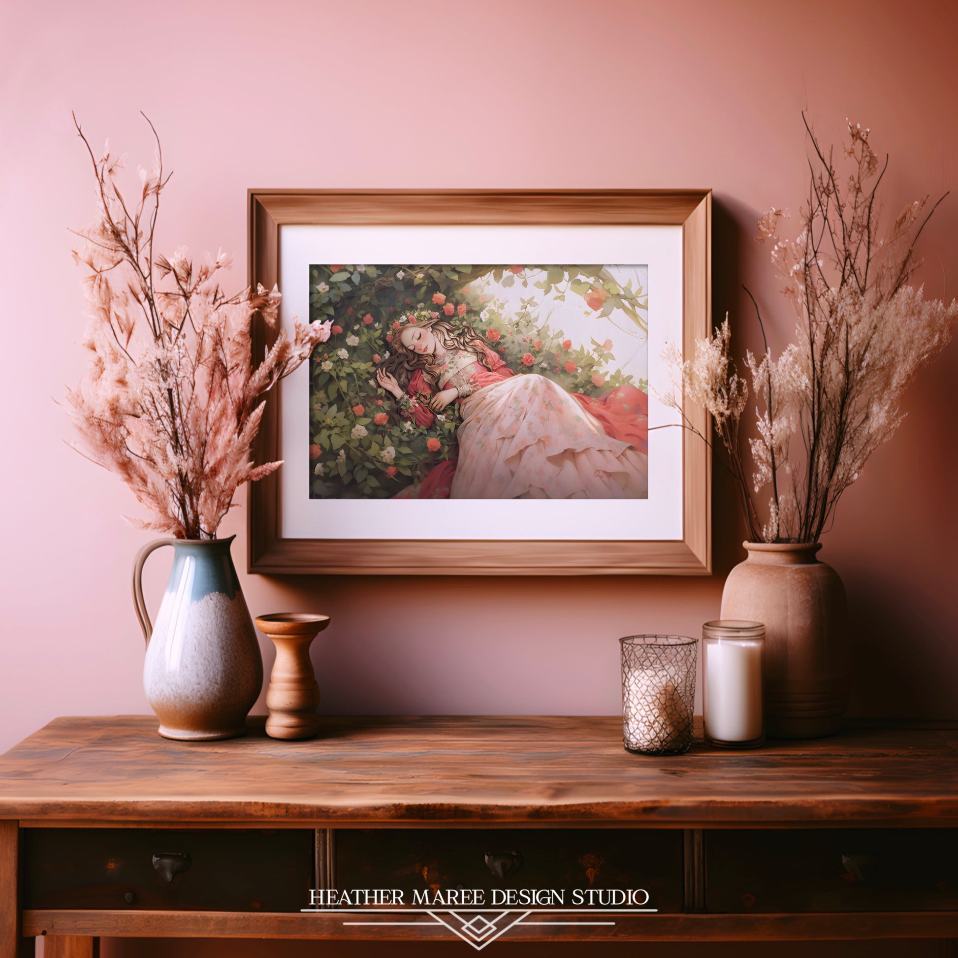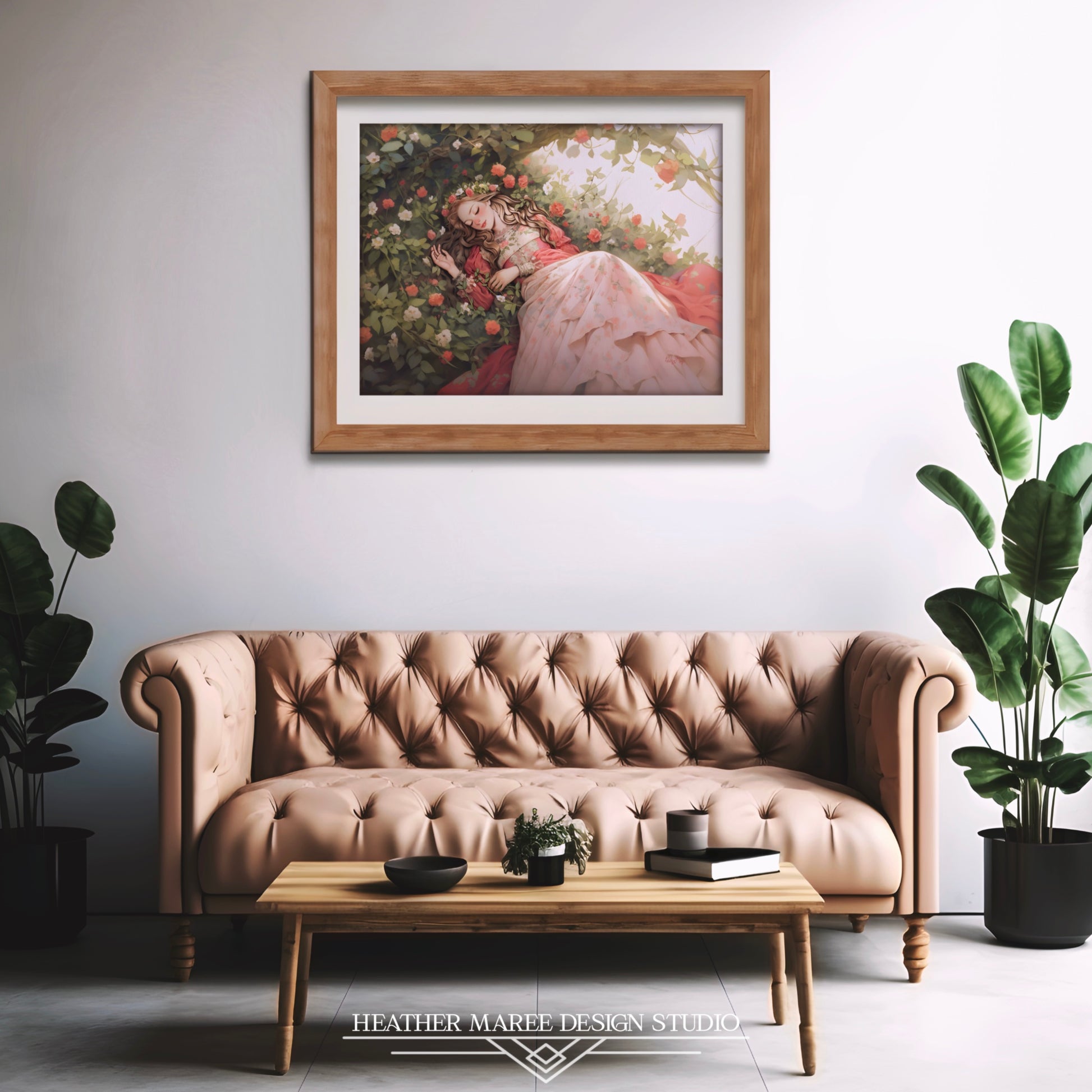 Embark on an enchanting journey into the world of fairy tales with this original digital painting featuring Sleeping Beauty. This captivating artwork portrays the iconic princess lying gracefully in a bed of leaves and flowers, adorned in a pink gown and a crown of delicate blooms. Bathed in gentle sunlight, the color palette of greens, corals, pinks, and beiges creates a dreamlike atmosphere, capturing the timeless magic of classic princess tales.