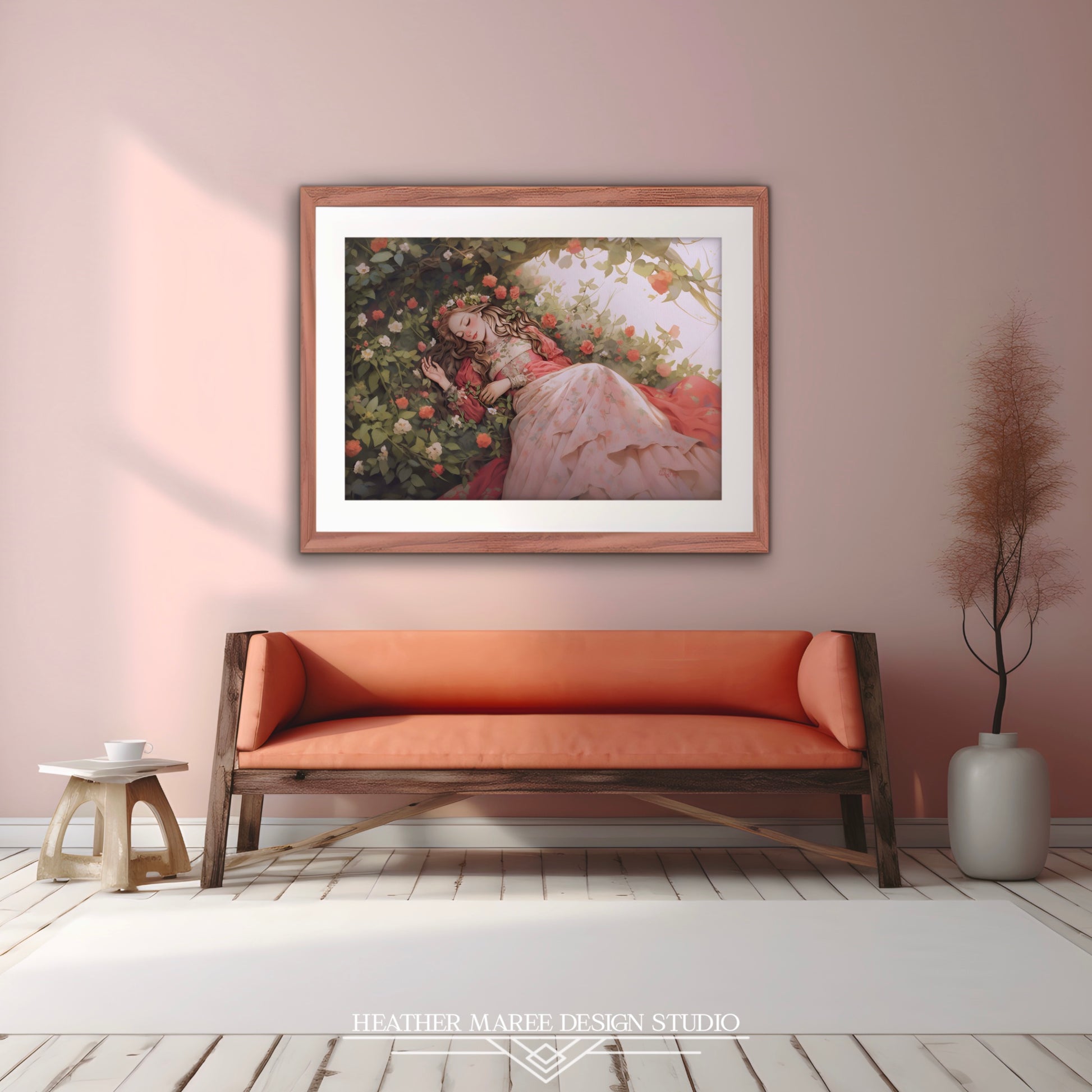 Embark on an enchanting journey into the world of fairy tales with this original digital painting featuring Sleeping Beauty. This captivating artwork portrays the iconic princess lying gracefully in a bed of leaves and flowers, adorned in a pink gown and a crown of delicate blooms. Bathed in gentle sunlight, the color palette of greens, corals, pinks, and beiges creates a dreamlike atmosphere, capturing the timeless magic of classic princess tales.