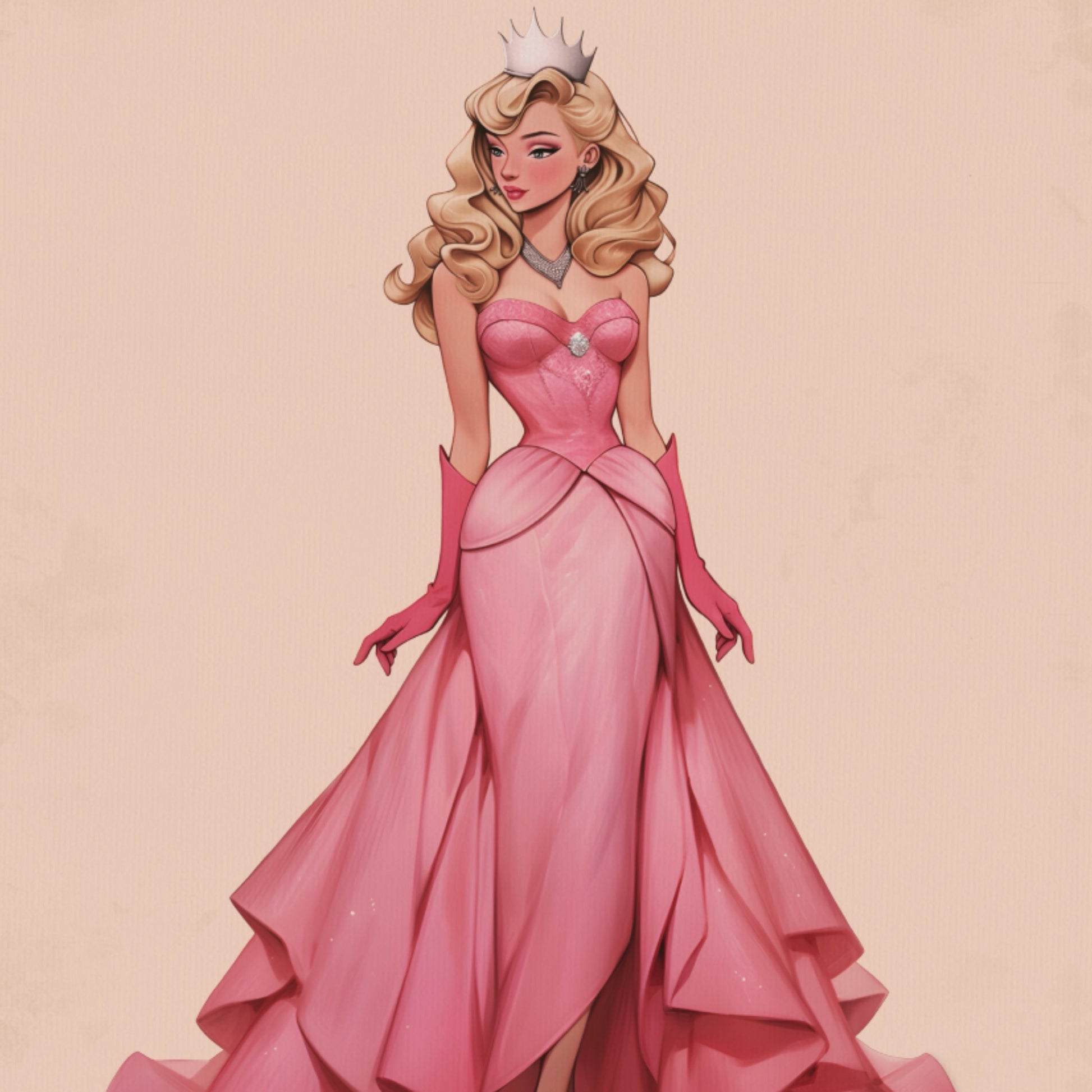 Enter the captivating realm of this original digital illustration, a mesmerizing fusion of Sleeping Beauty's grace and the glamorous allure of 1940s pin-up girls and Hollywood fashion. Adorned in a pink form-fitting strapless gown, paired with elegant gloves and sparkling silver pumps, Sleeping Beauty exudes a timeless charm reminiscent of Hollywood's golden era. The glittering silver necklace and matching crown add a touch of regal sophistication, creating a unique blend of fairy-tale magic and vintage glamour.