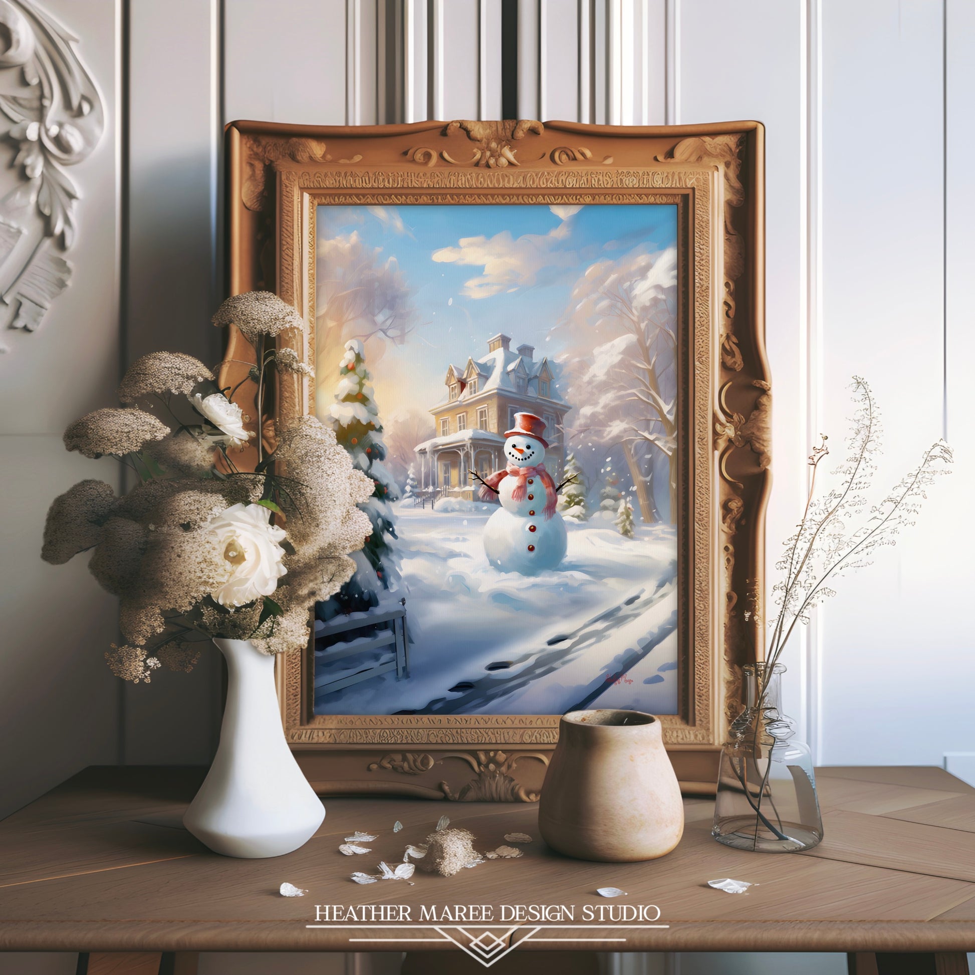 Experience the joy of winter with this enchanting original artwork that captures the essence of the season. A cheerful snowman takes center stage in the front yard of a picturesque Victorian manor, surrounded by snow-covered trees and a beautifully adorned evergreens. The bright blue sky and abundant sunshine paint a vibrant backdrop, creating a scene that radiates happiness and the magic of winter days.
