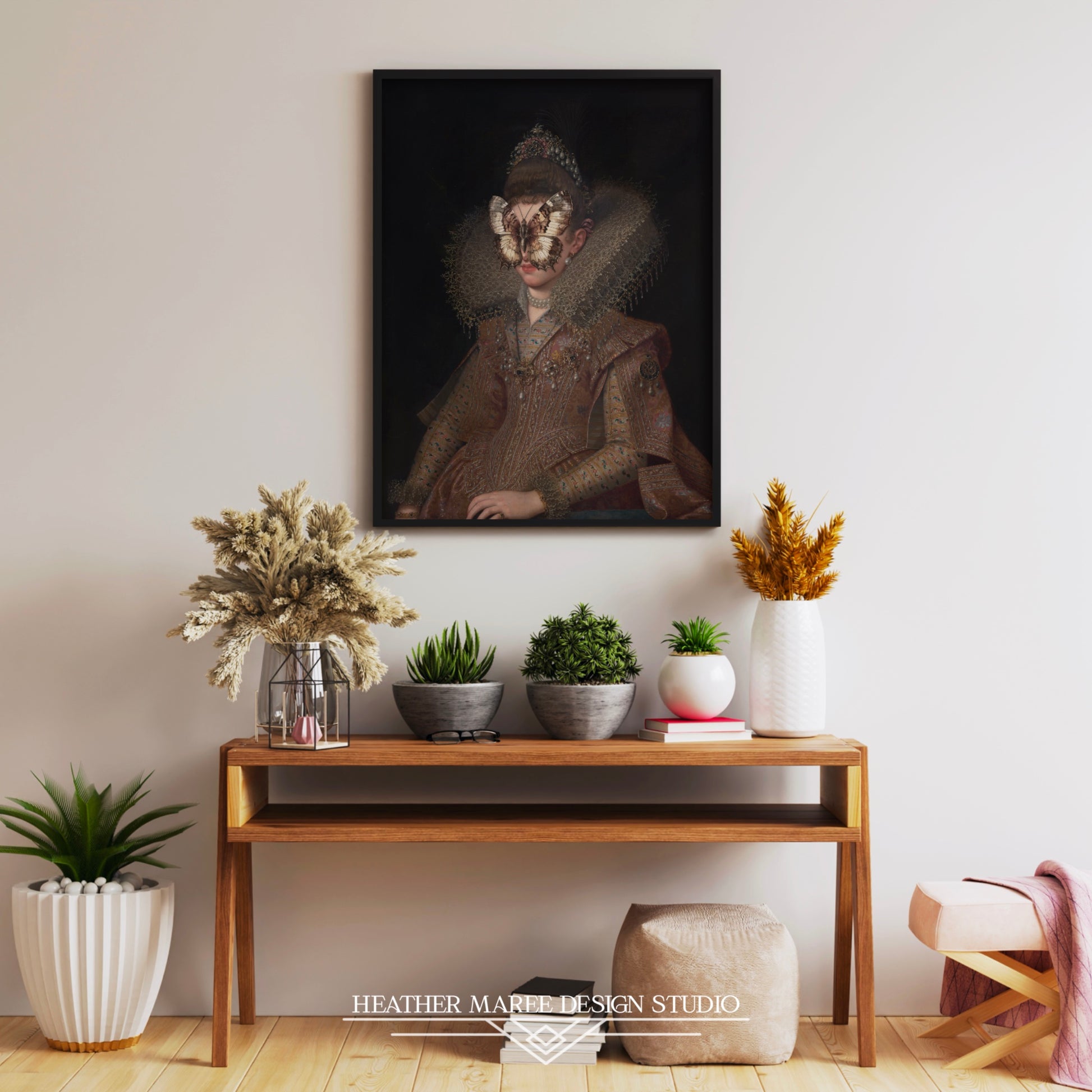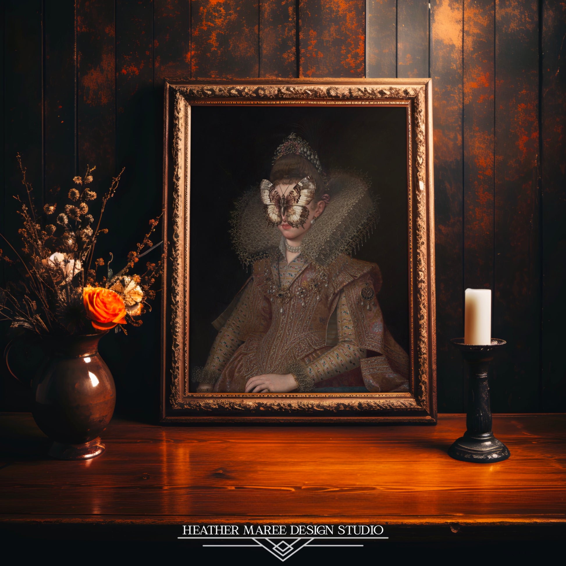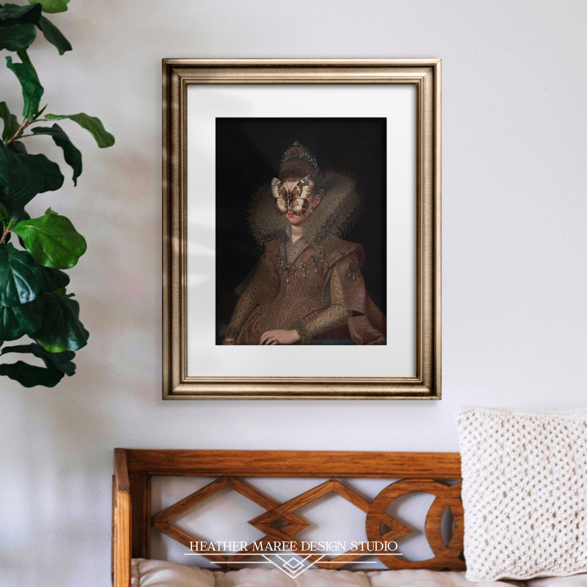 Discover the magic of our uniquely retouched and altered art print reproduction, presenting a fresh and enchanting take on classic portraiture. The graceful figure of a mysterious lady, adorned in a beautifully detailed gown and stunning jewels, maintains her dignified presence. Yet, her face is playfully obscured by a large butterfly, adding an air of intrigue. The fine lace, pearls, and embroidered fabrics of her attire, contrasted with the gentle, delicate wings of the butterfly, evoke a nostalgic blend of historical elegance and whimsical modernity.