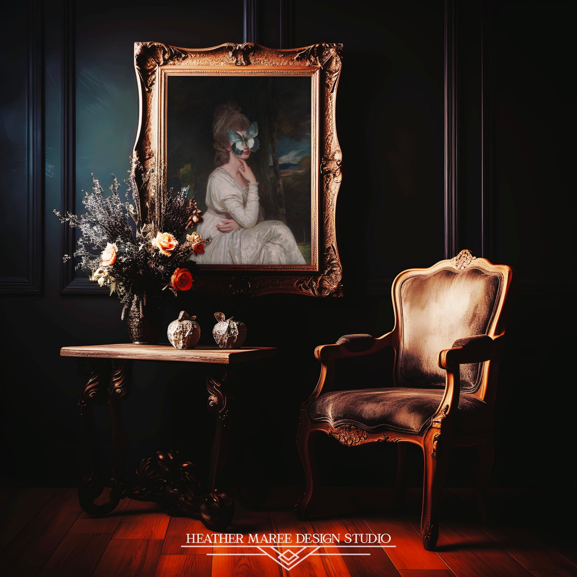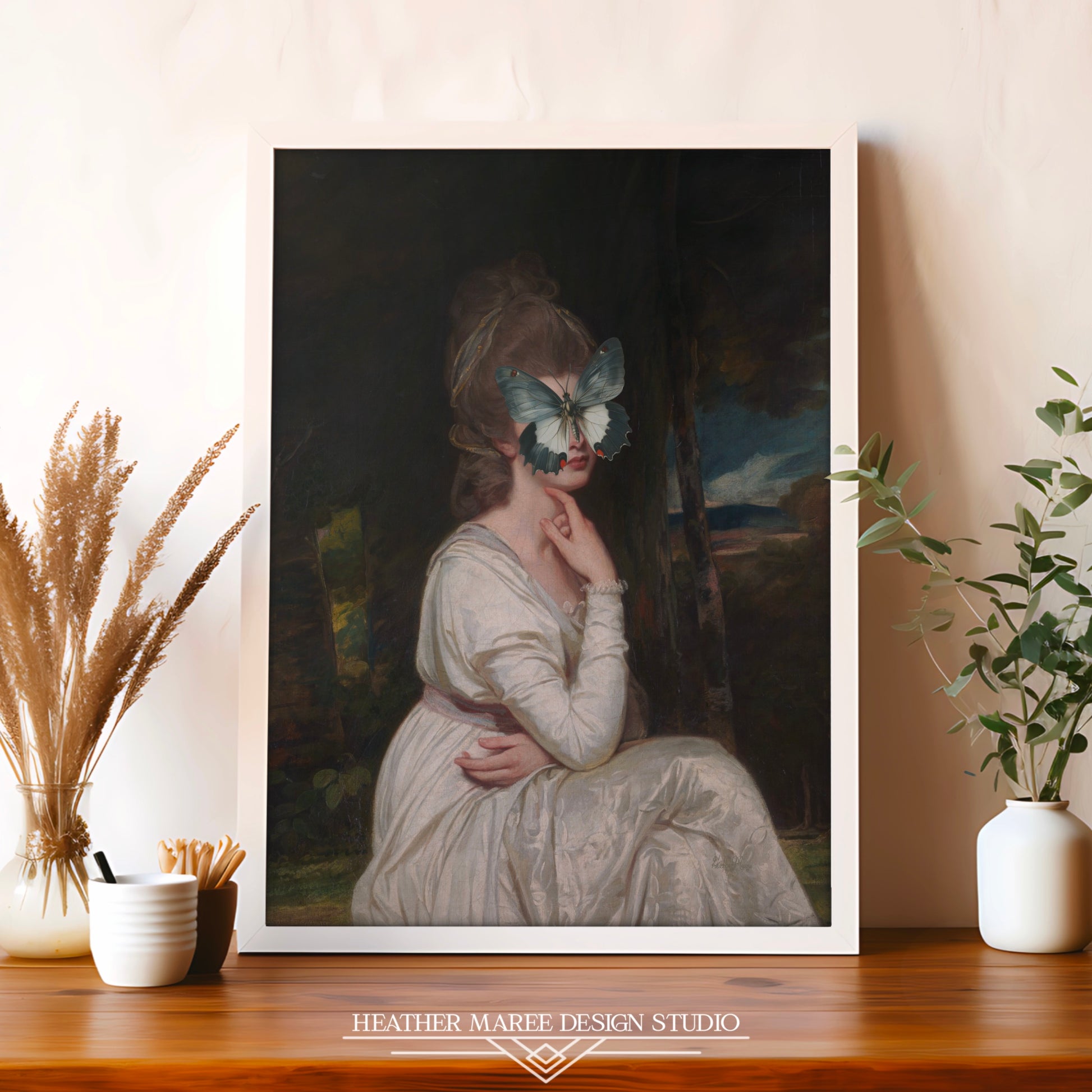This expertly retouched and altered art print reproduction reinvents classical portraiture with a captivating twist. The elegant figure of a seated woman, adorned in a flowing white gown, radiates timeless grace and poise. Her face is intriguingly hidden behind a large, ethereal butterfly. This surprising surreal aspect transforms the traditional into something whimsical and mysterious, encouraging the viewer to contemplate what is hidden behind the butterfly's wings.